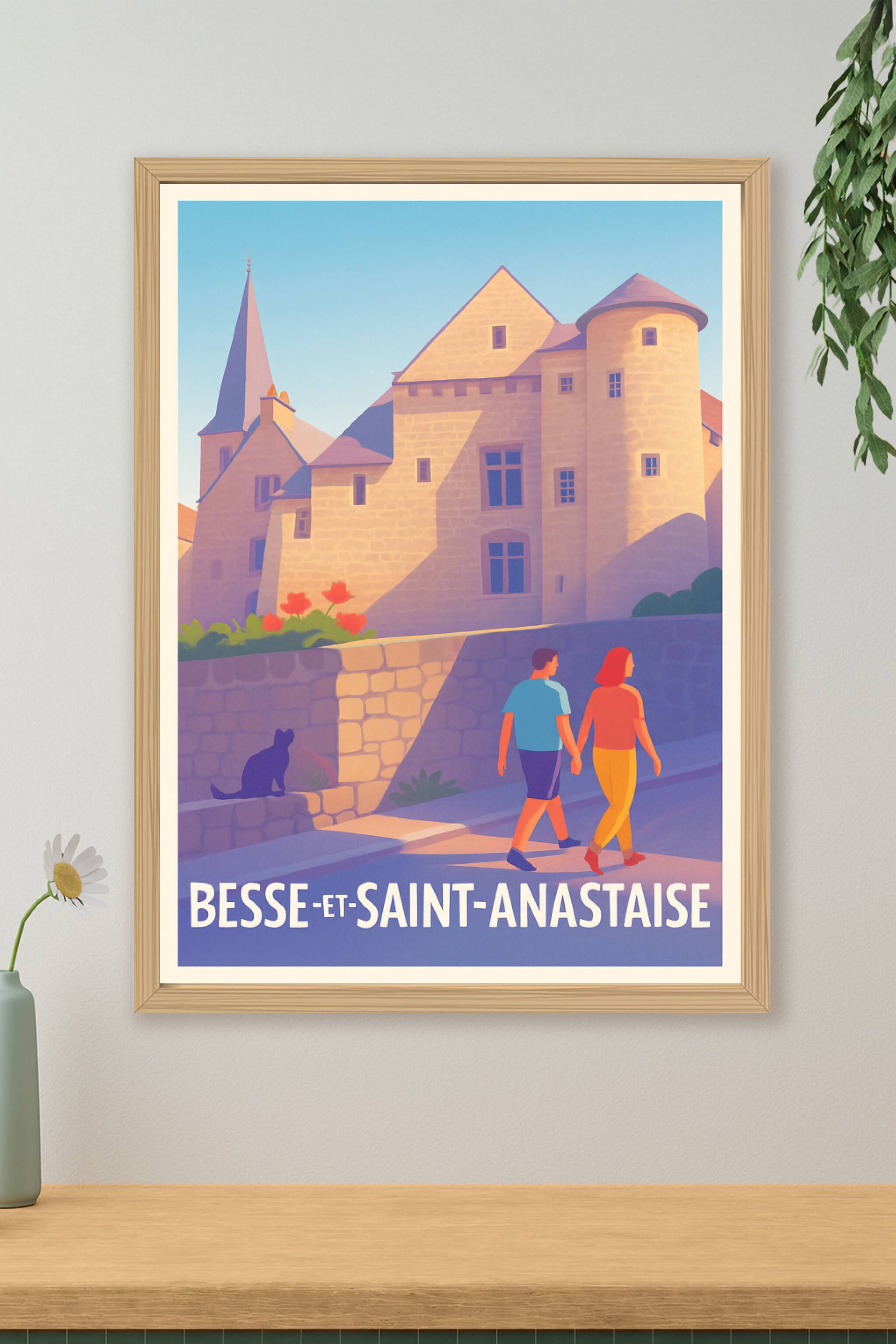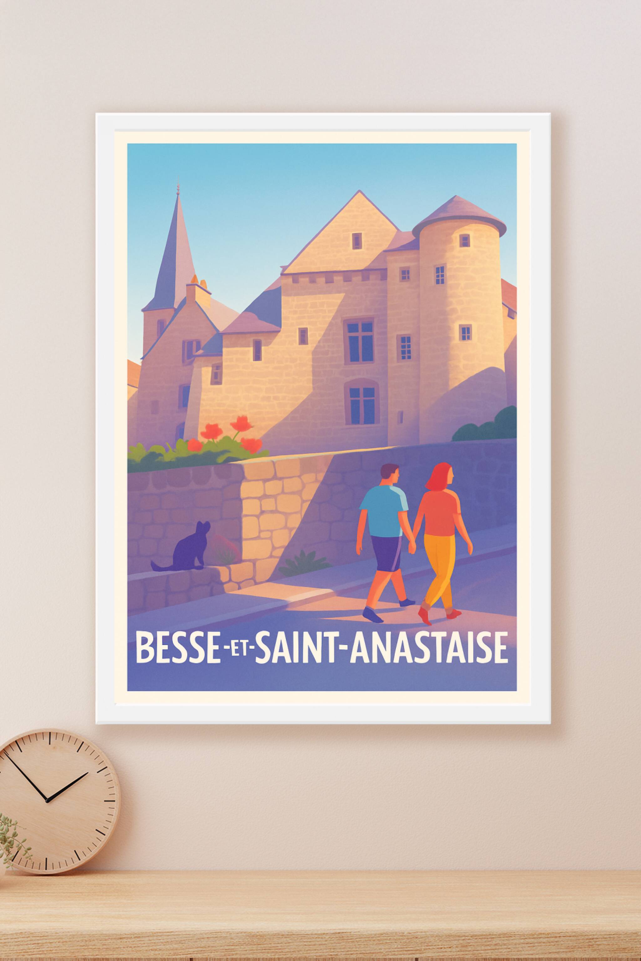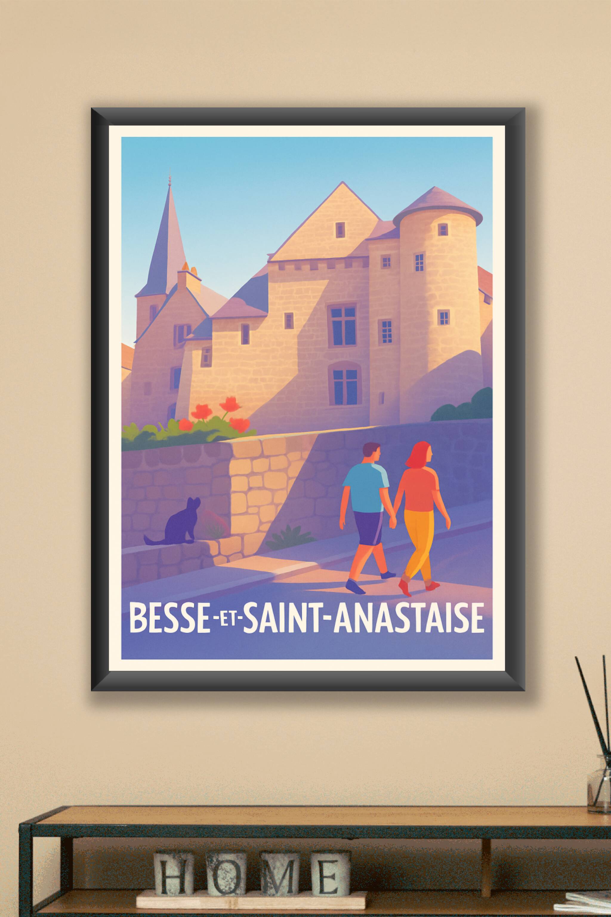 Découvrez la douceur de vivre de Besse-et-Saint-Anastaise à travers cette affiche rétro illustrant une scène paisible dans les ruelles du village, avec ses bâtisses en pierre baignées par une lumière chaleureuse. Ce poster élégant capture l’essence d’un lieu chargé d’histoire et de charme, parfait pour décorer votre intérieur avec une touche d’authenticité.Affinée en tirage "Fine Art" sur papier 305g coton, cette affiche garantit une qualité d’impression exceptionnelle, aux couleurs vives et détails soignés. Disponible en formats A1 à A4, avec ou sans cadre, elle s’adapte à tous les styles et espaces, faisant de cette affiche un cadeau idéal ou un élément déco unique pour les amoureux des villages pittoresques.
