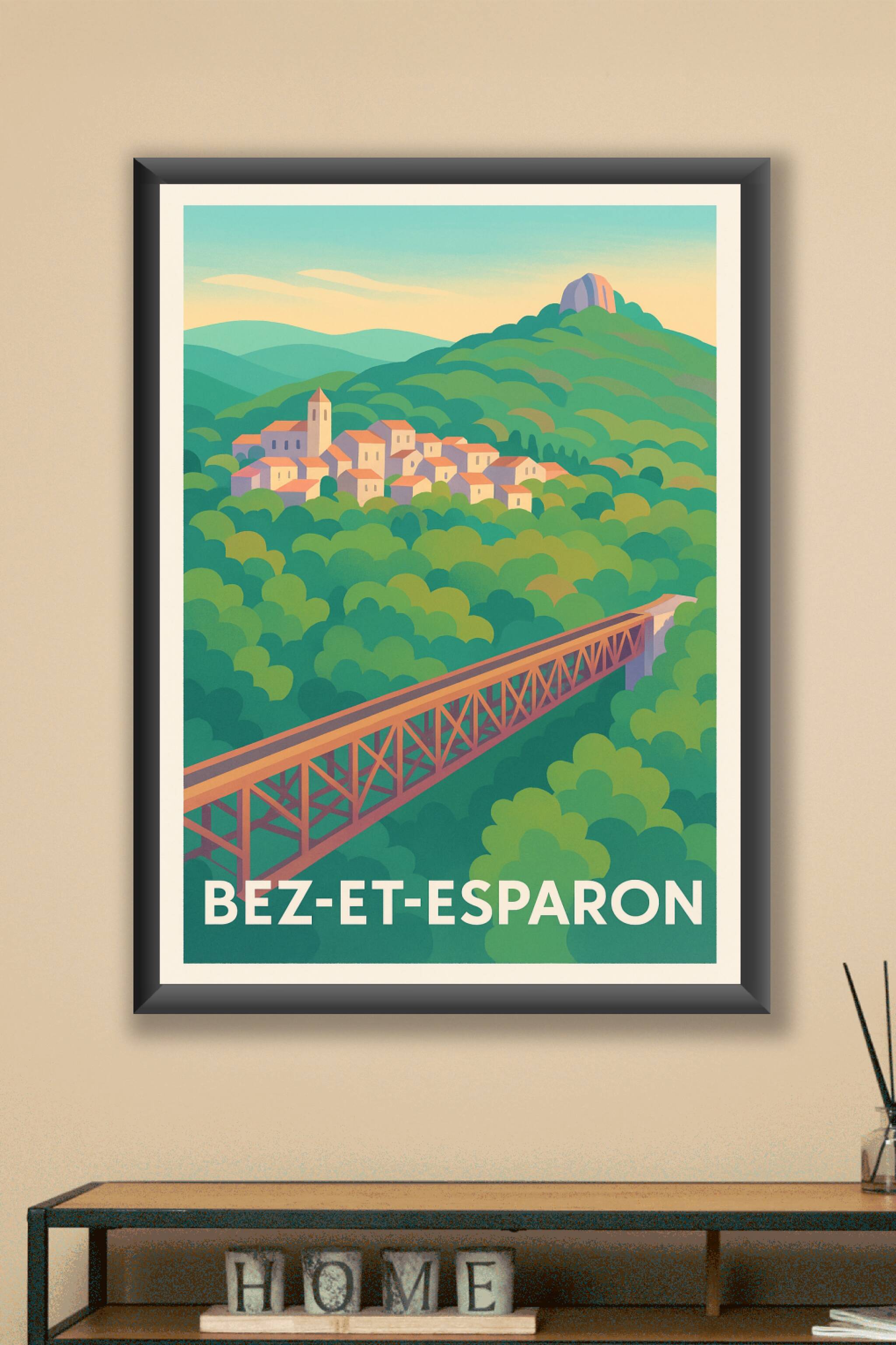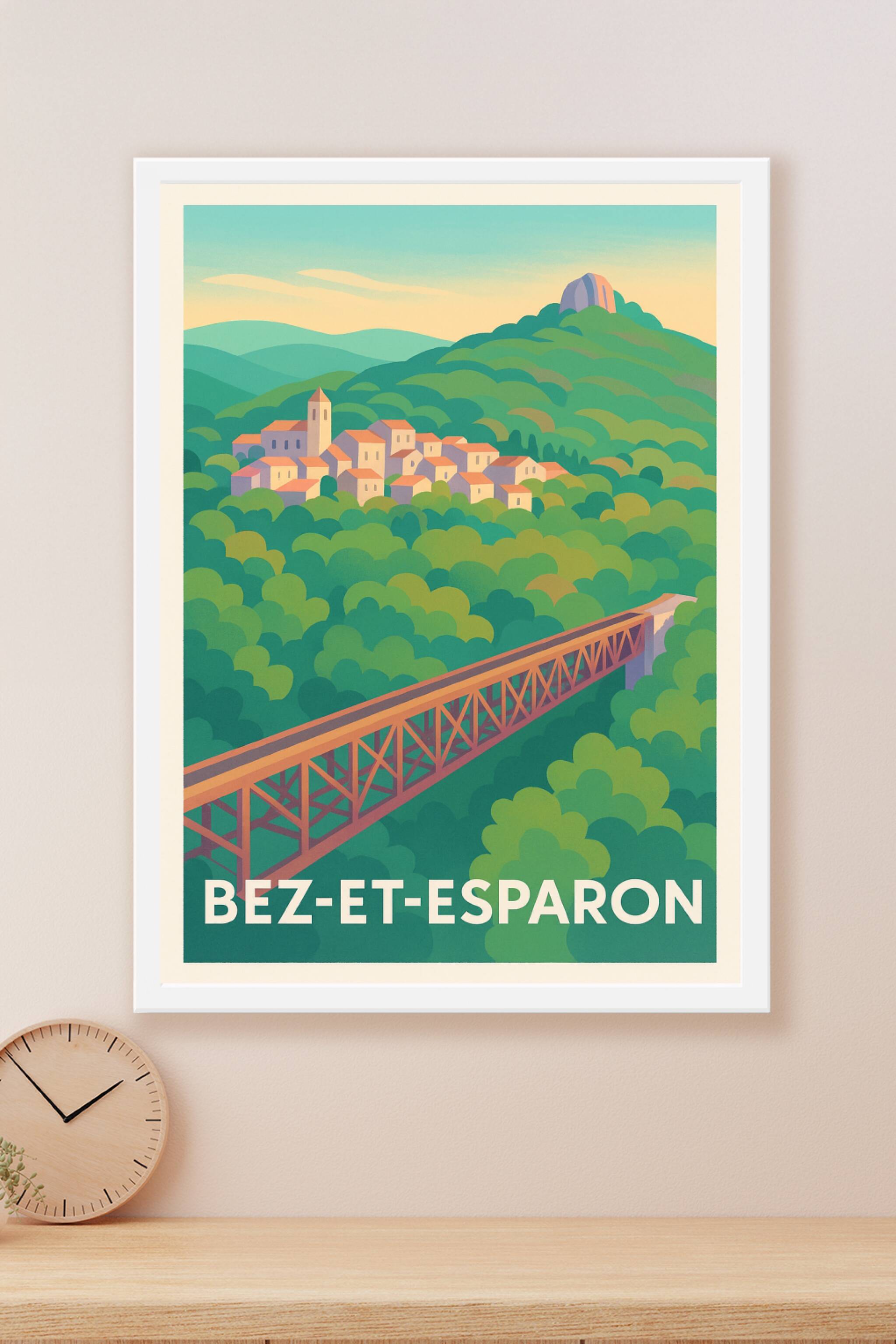 Découvrez l'élégance rustique de Bez-et-Esparon à travers cette affiche aux tonalités douces et harmonieuses. Ce poster illustre un village niché a...