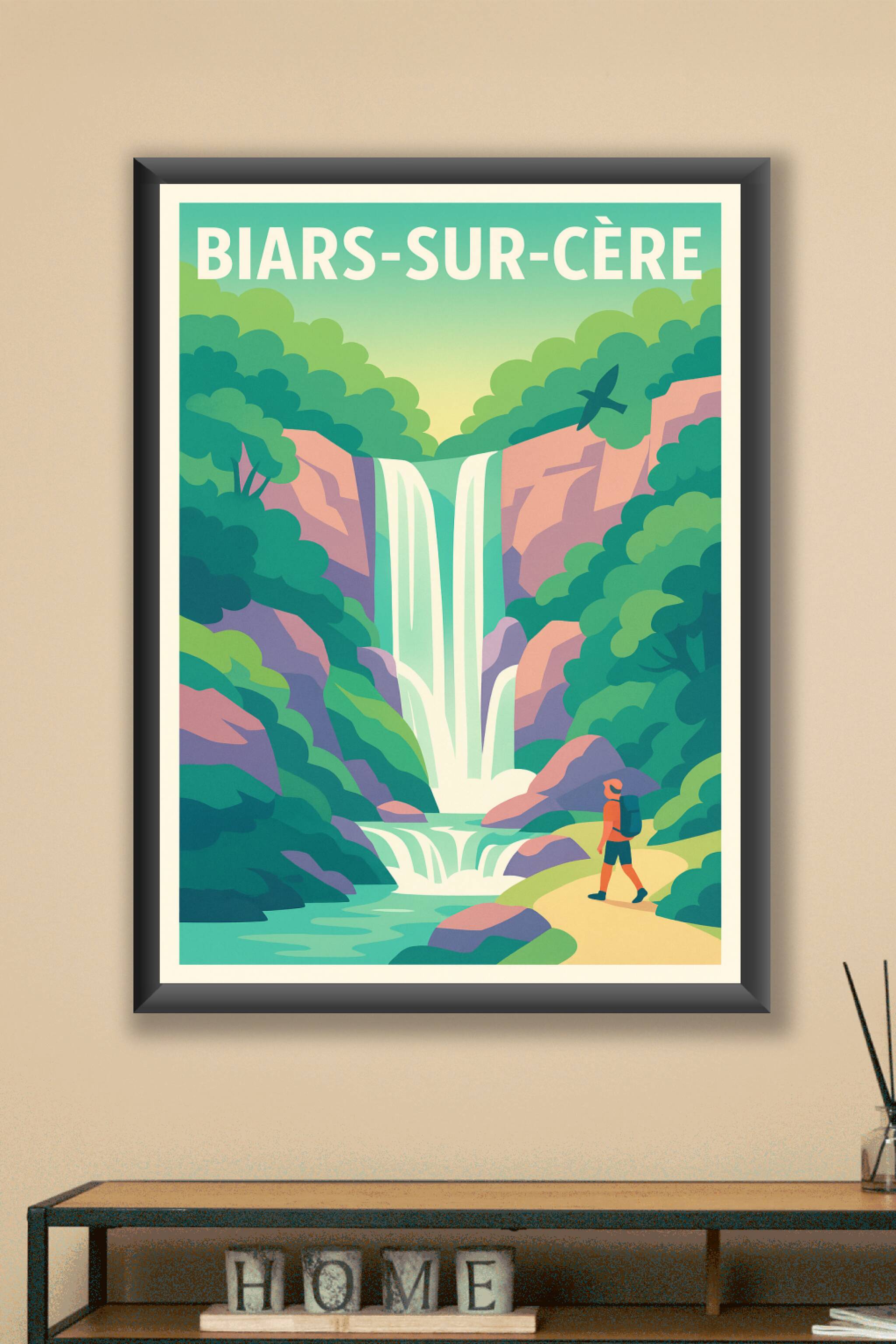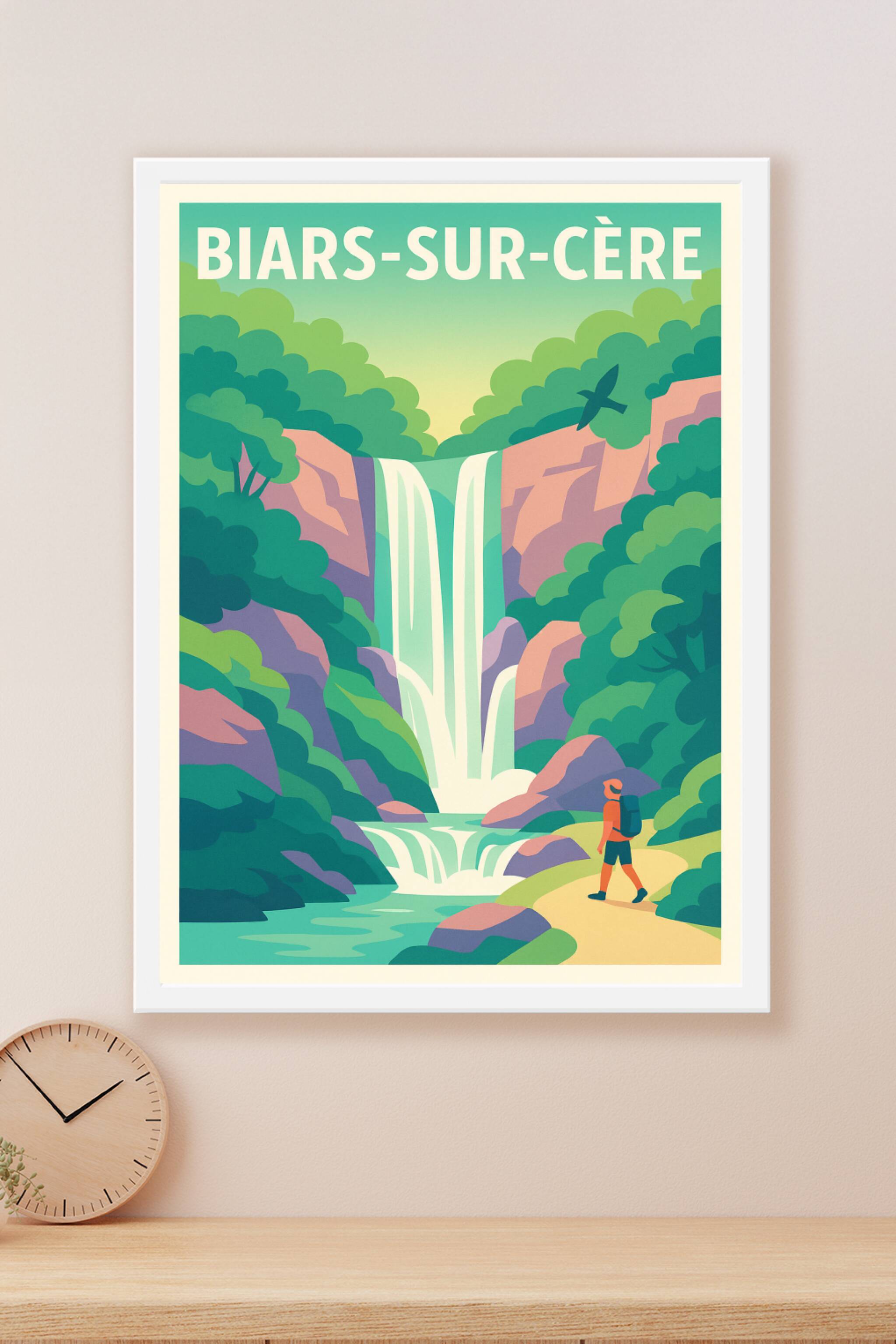 Découvrez la beauté sauvage et paisible de Biars-sur-Cère à travers cette affiche illustrée représentant une cascade majestueuse entourée d'une nat...