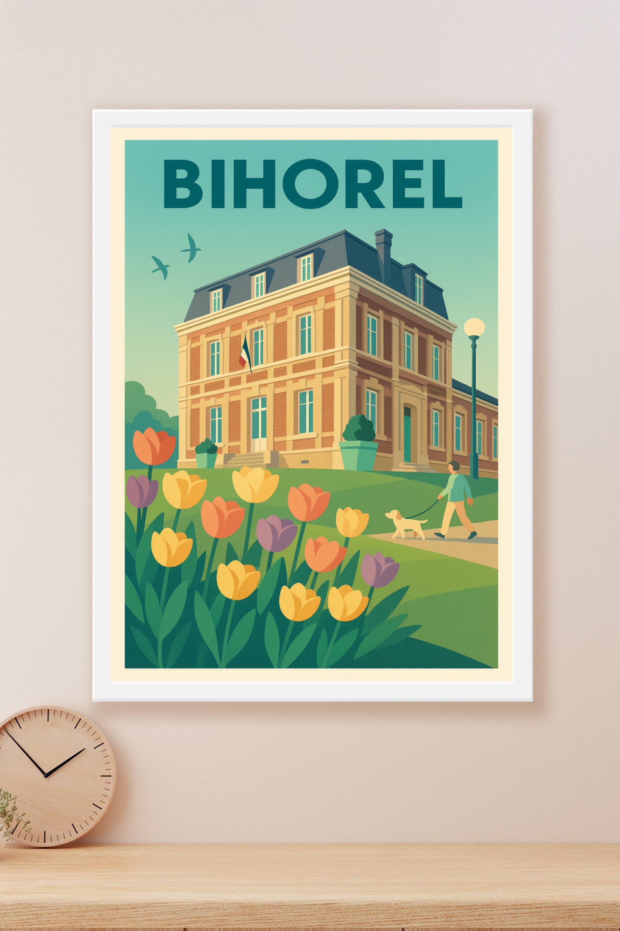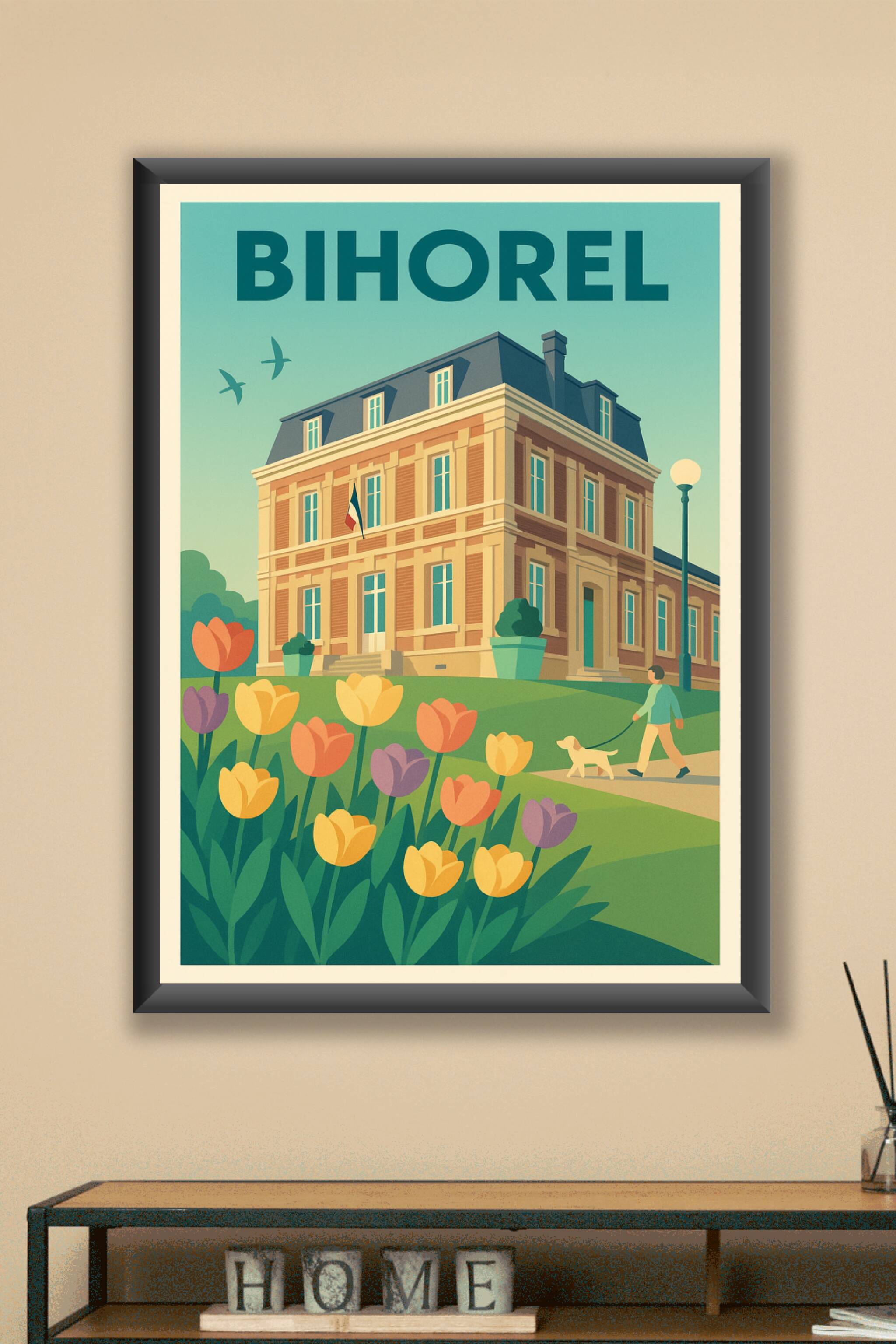 Découvrez le charme paisible de Bihorel à travers cette affiche élégante illustrant une bâtisse typique entourée de tulipes colorées et d'un promen...