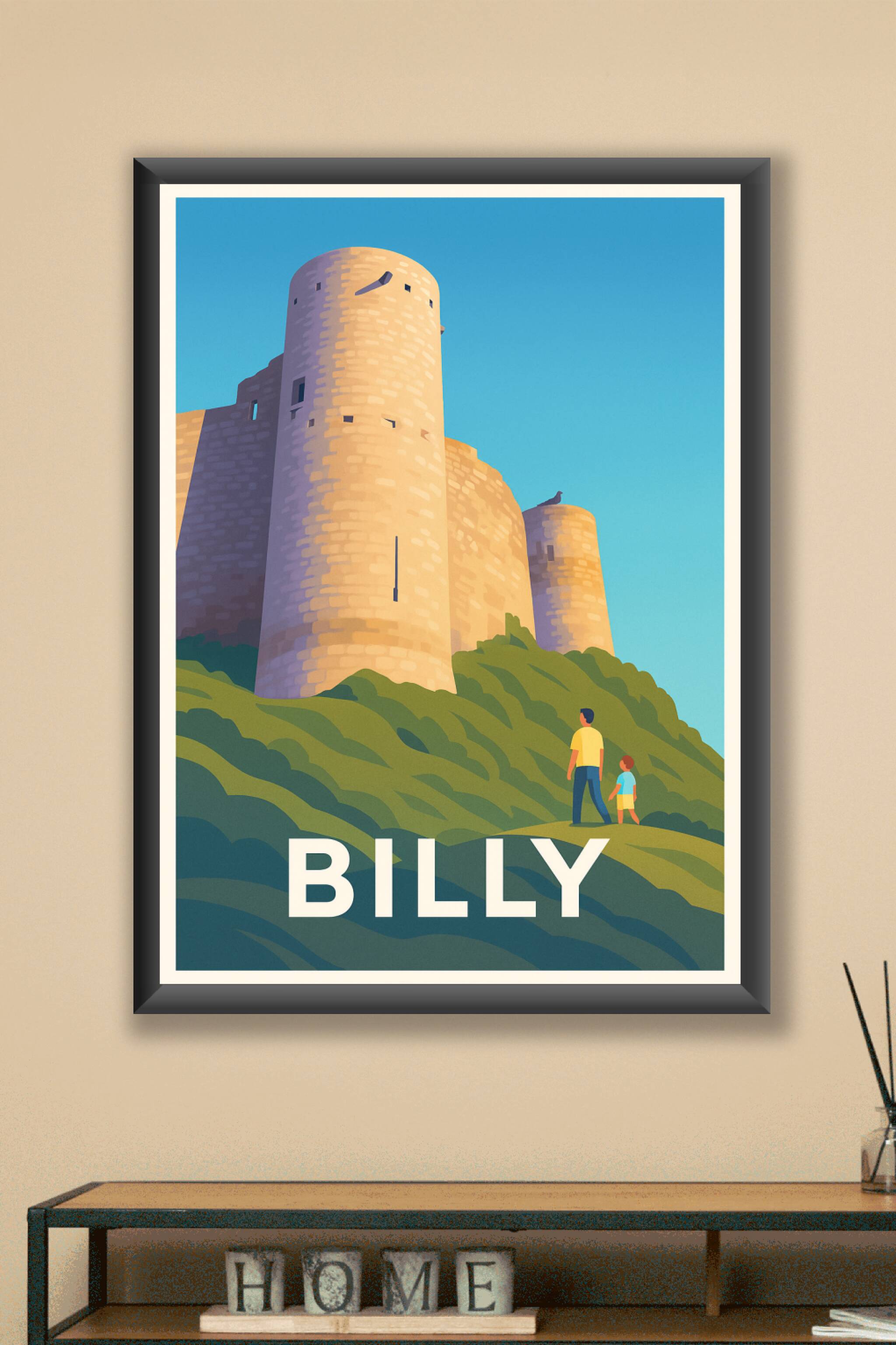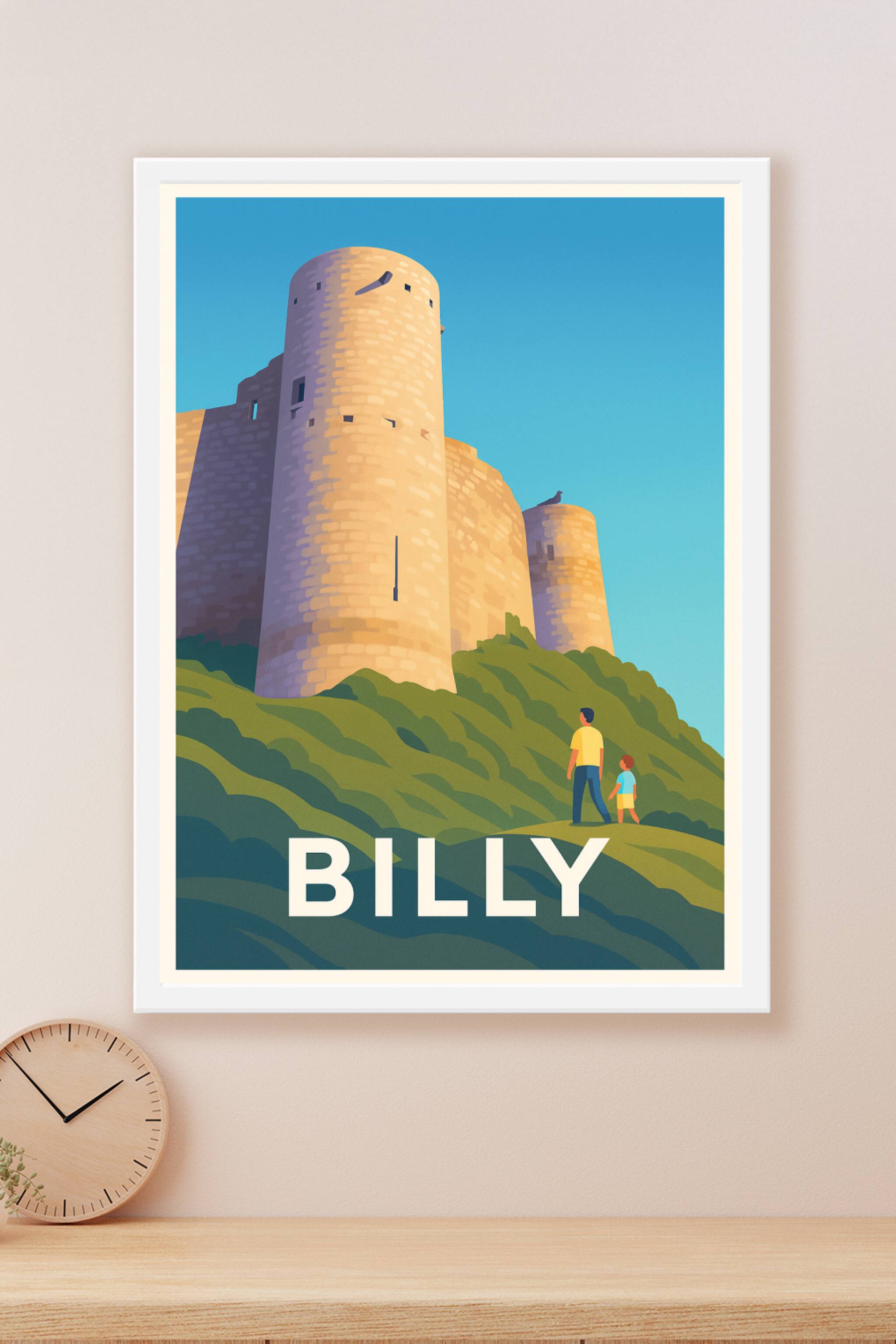 Explorez la beauté historique de Billy avec cette affiche illustrée mettant en scène ses tours emblématiques baignées par la lumière douce du jour....