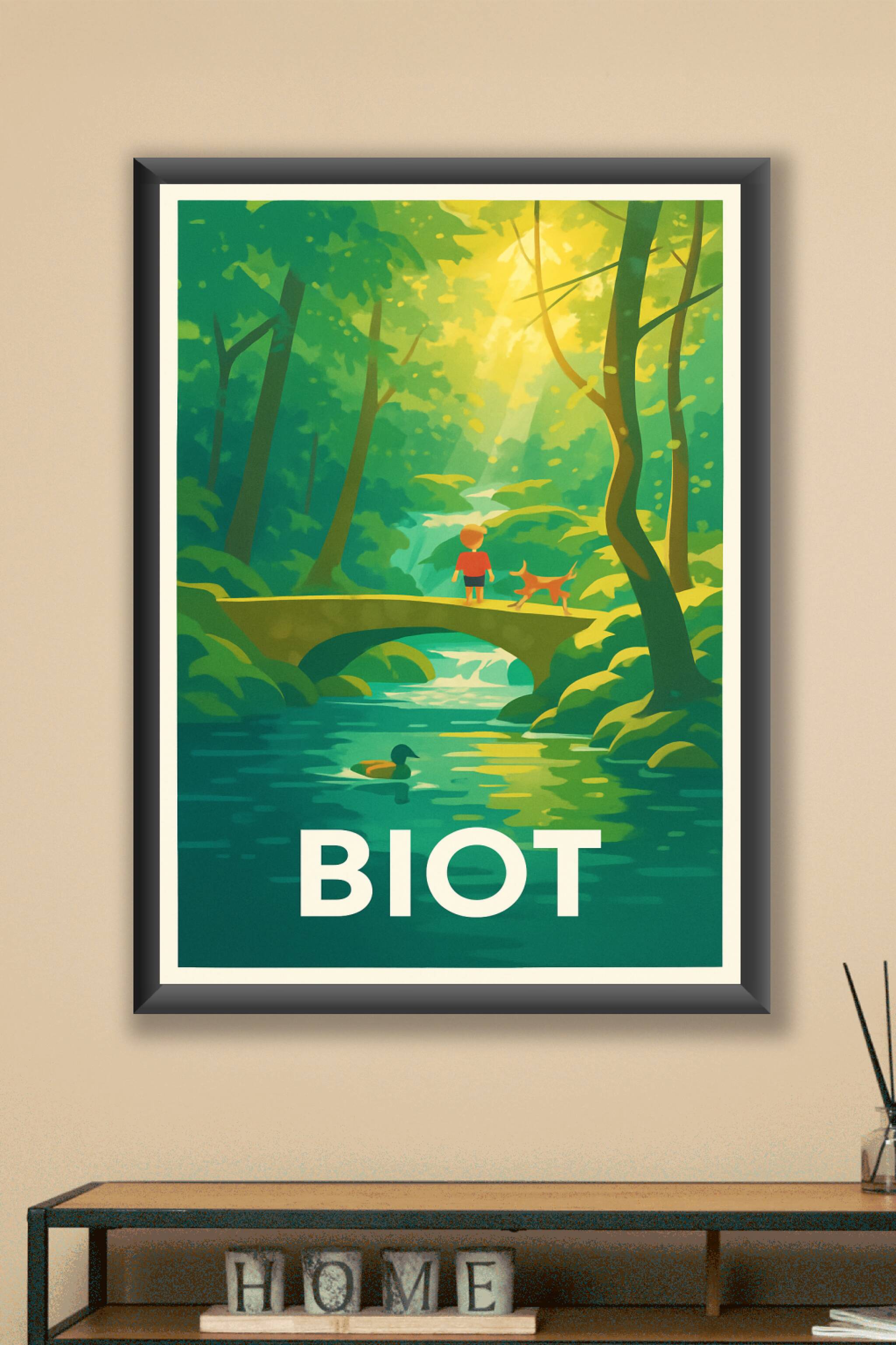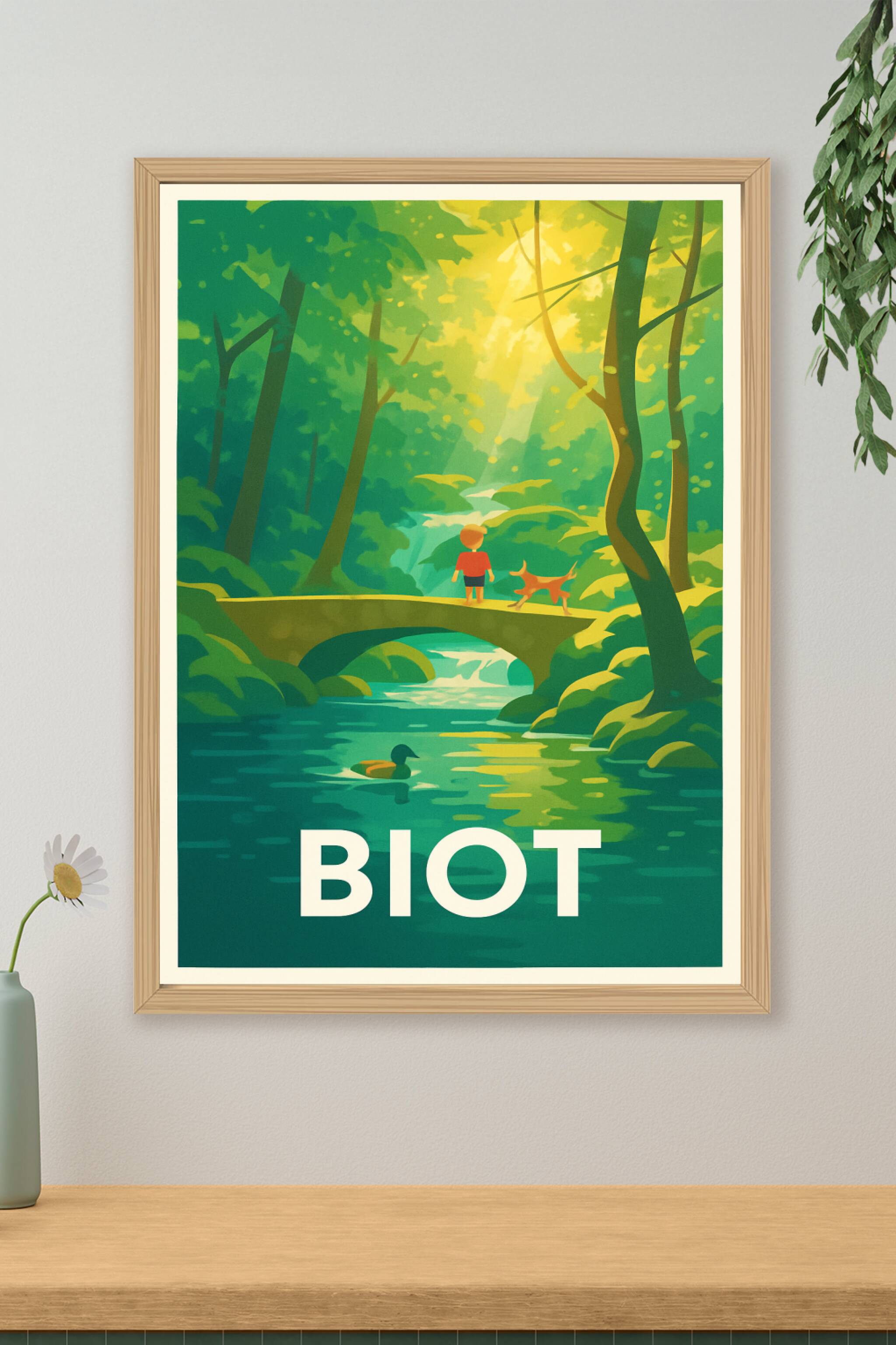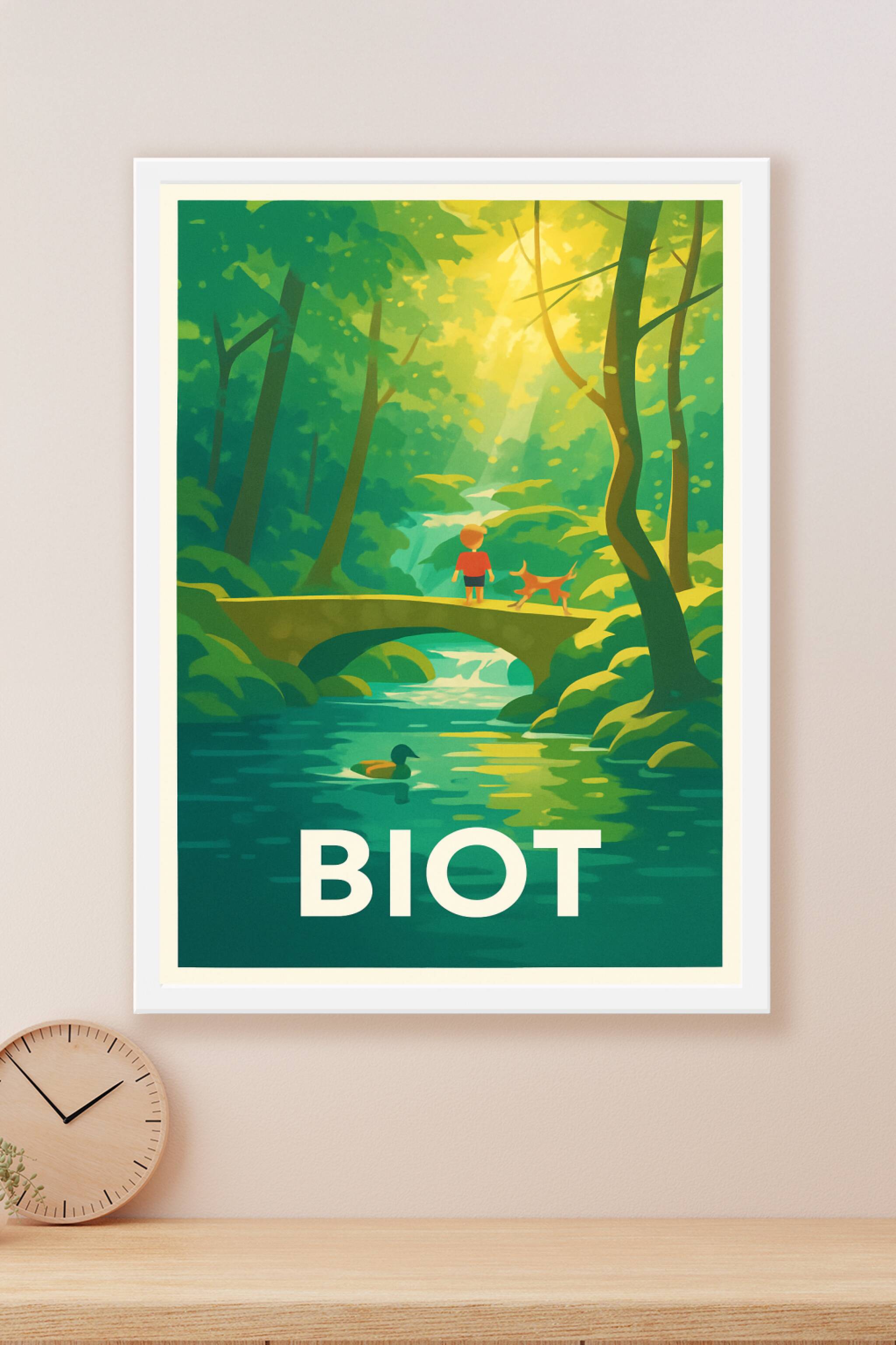 Découvrez la sérénité et la beauté naturelle de Biot avec cette affiche illustrée montrant un enfant et son chien traversant un pont au cœur d'une ...