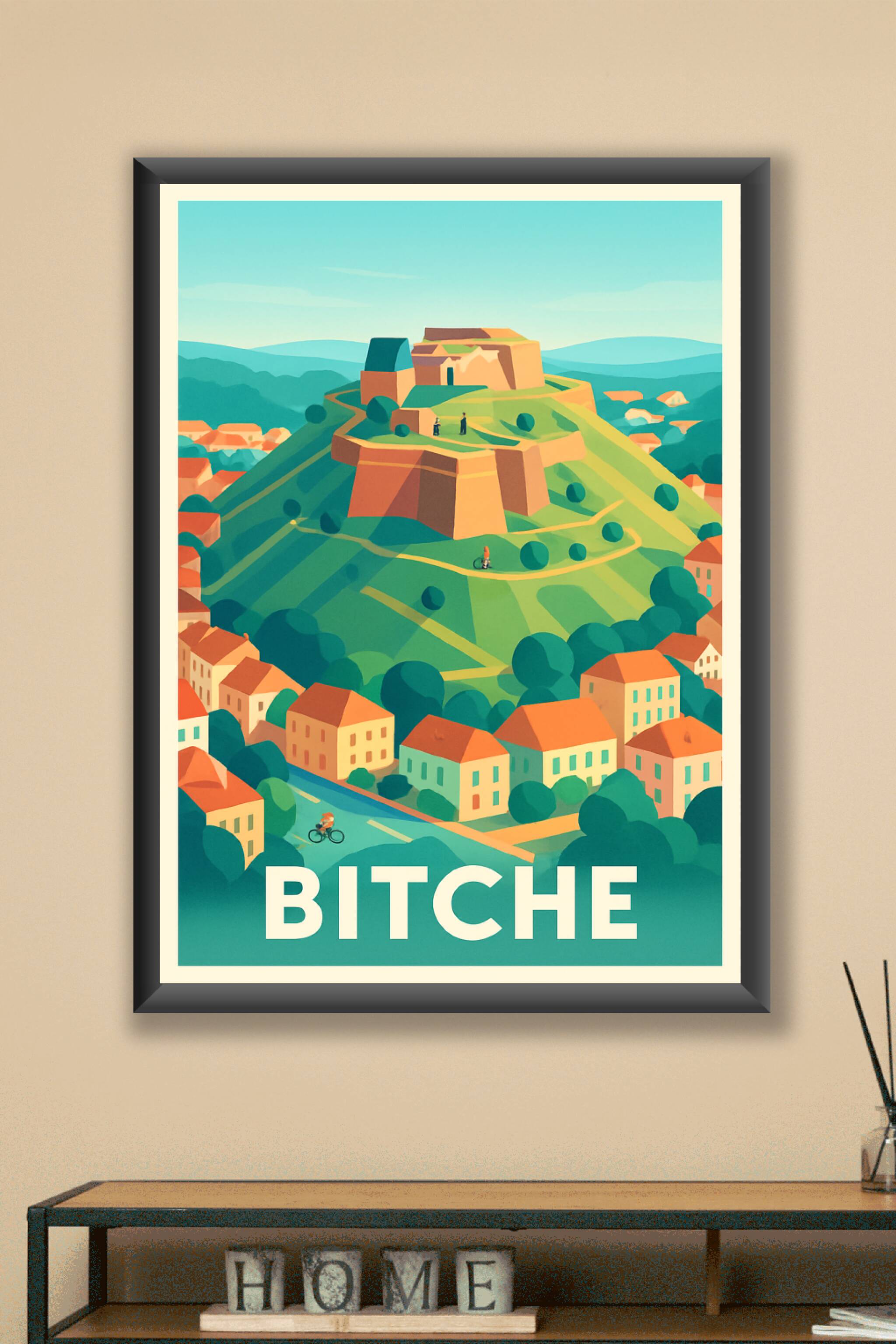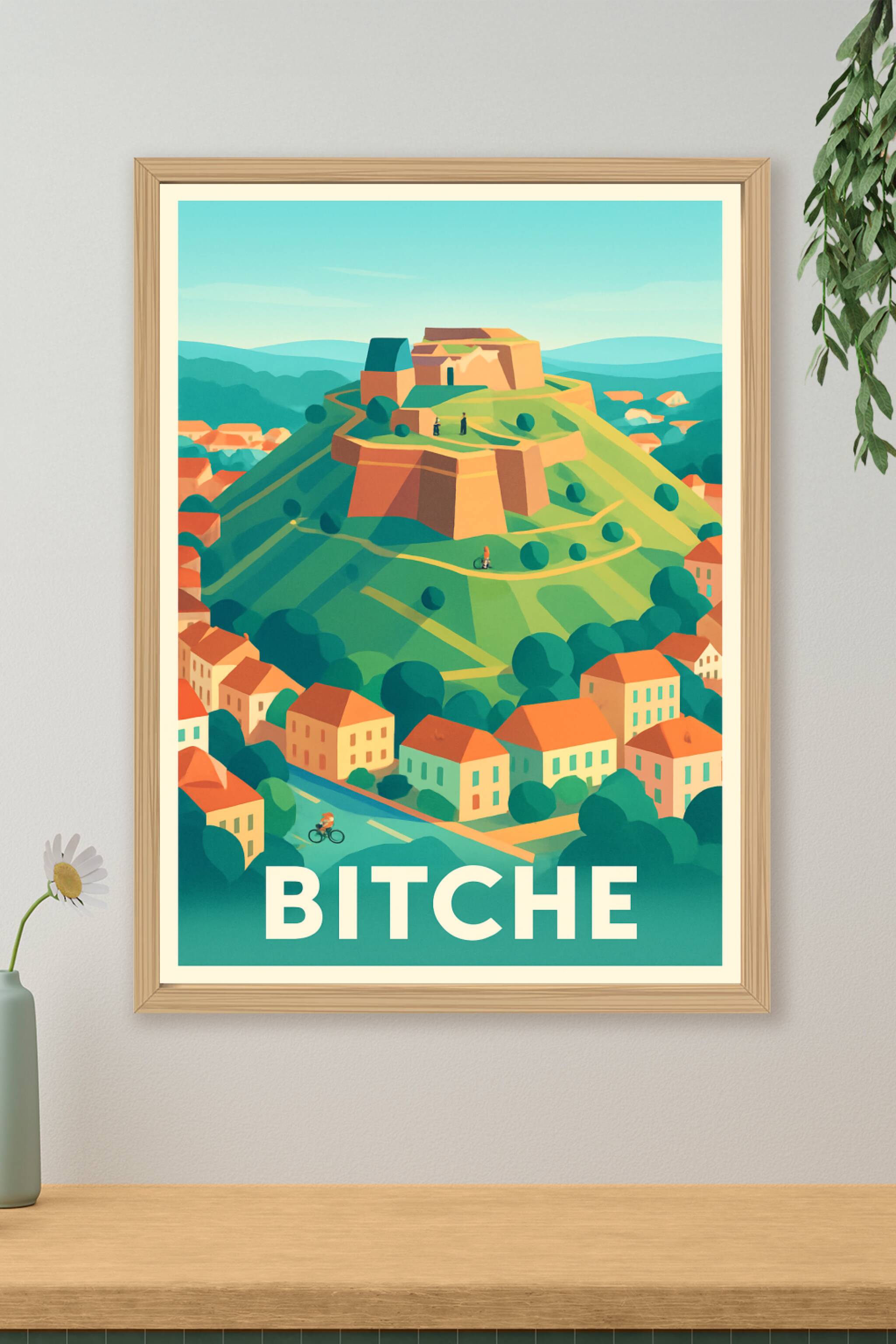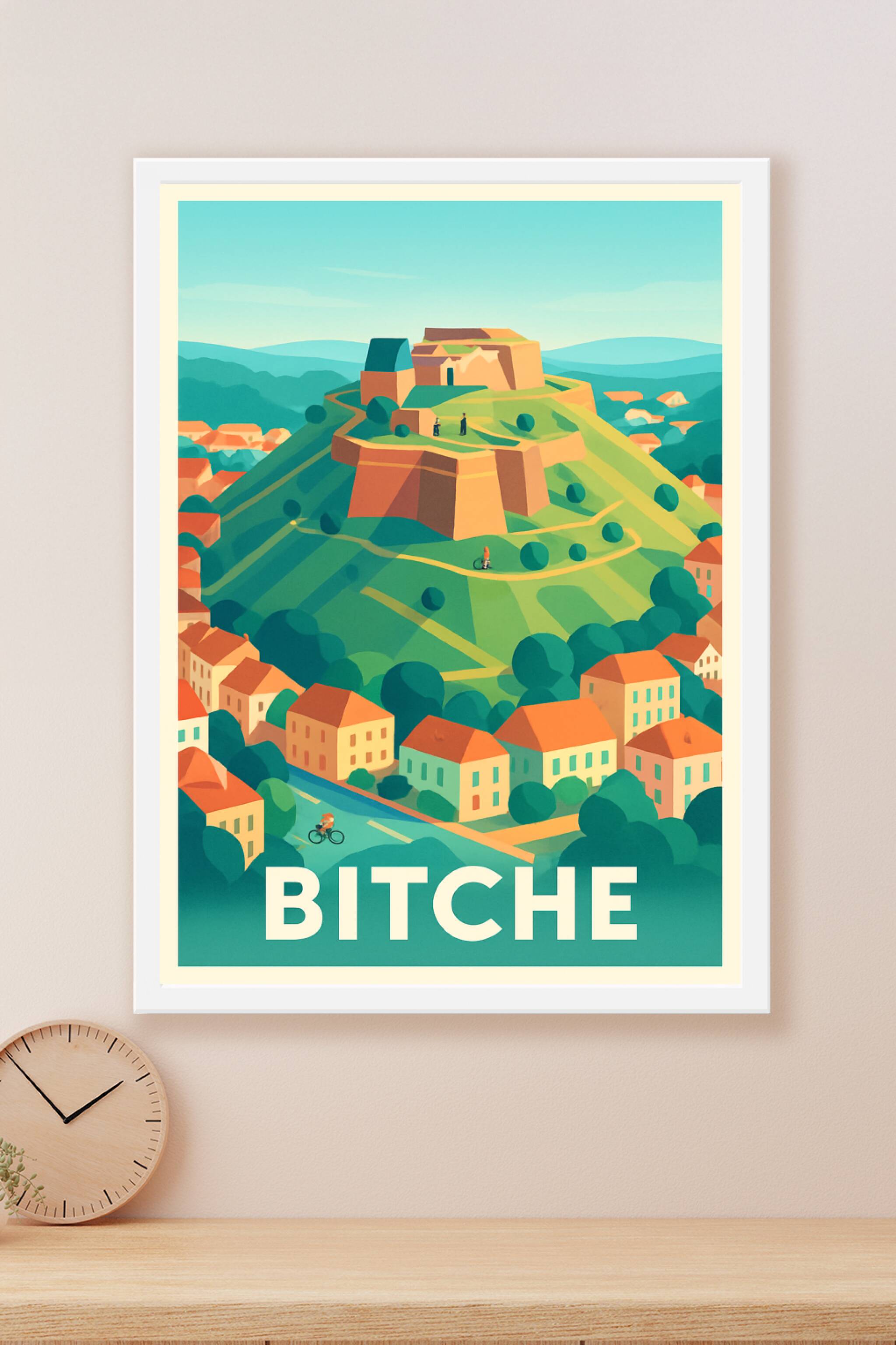 Découvrez cette magnifique affiche illustrée mettant en scène la citadelle de Bitche, joyau fortifié perché au cœur d’un paysage verdoyant. Ce poster aux couleurs vibrantes capture l’âme paisible et historique de cette petite ville lorrainne empreinte de charme et de caractère. Imprimé en tirage "Fine Art" sur un papier 305g coton de haute qualité, ce poster garantit une netteté et une longévité exceptionnelles. Disponible en formats A1 à A4, avec ou sans cadre, cette affiche s’intégrera parfaitement à votre décoration intérieure, apportant une touche d’authenticité et de caractère. Un cadeau idéal pour les amoureux des lieux emblématiques français ou pour embellir votre maison avec élégance.