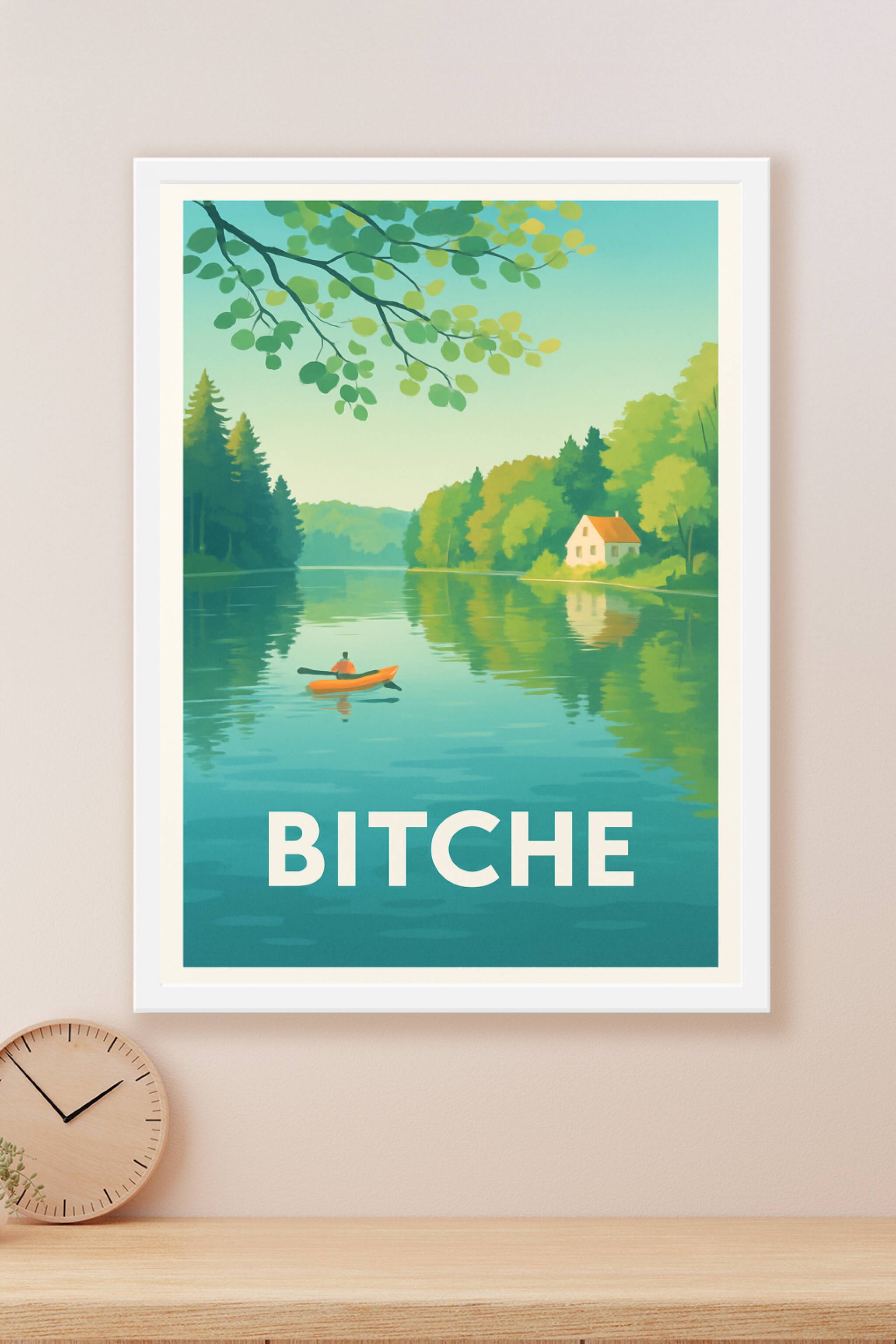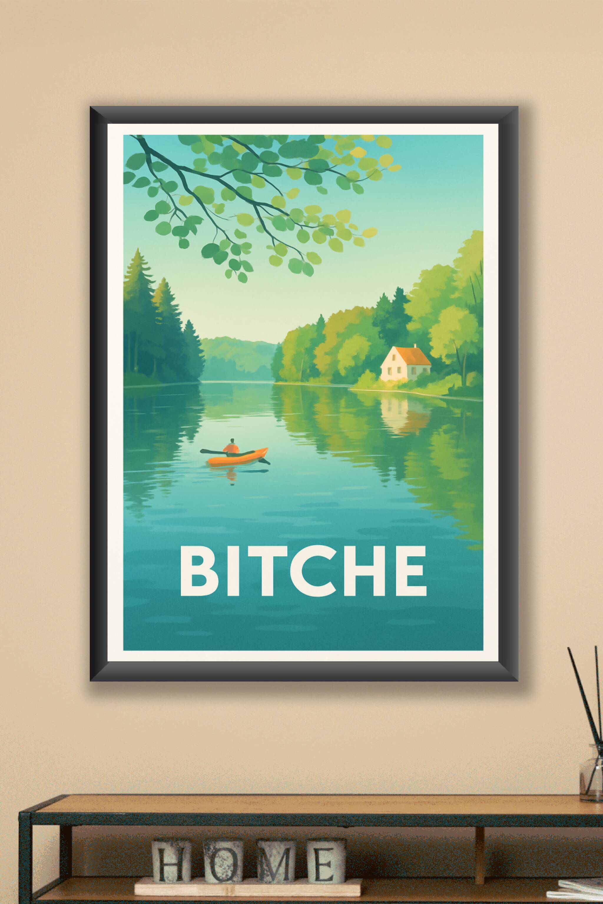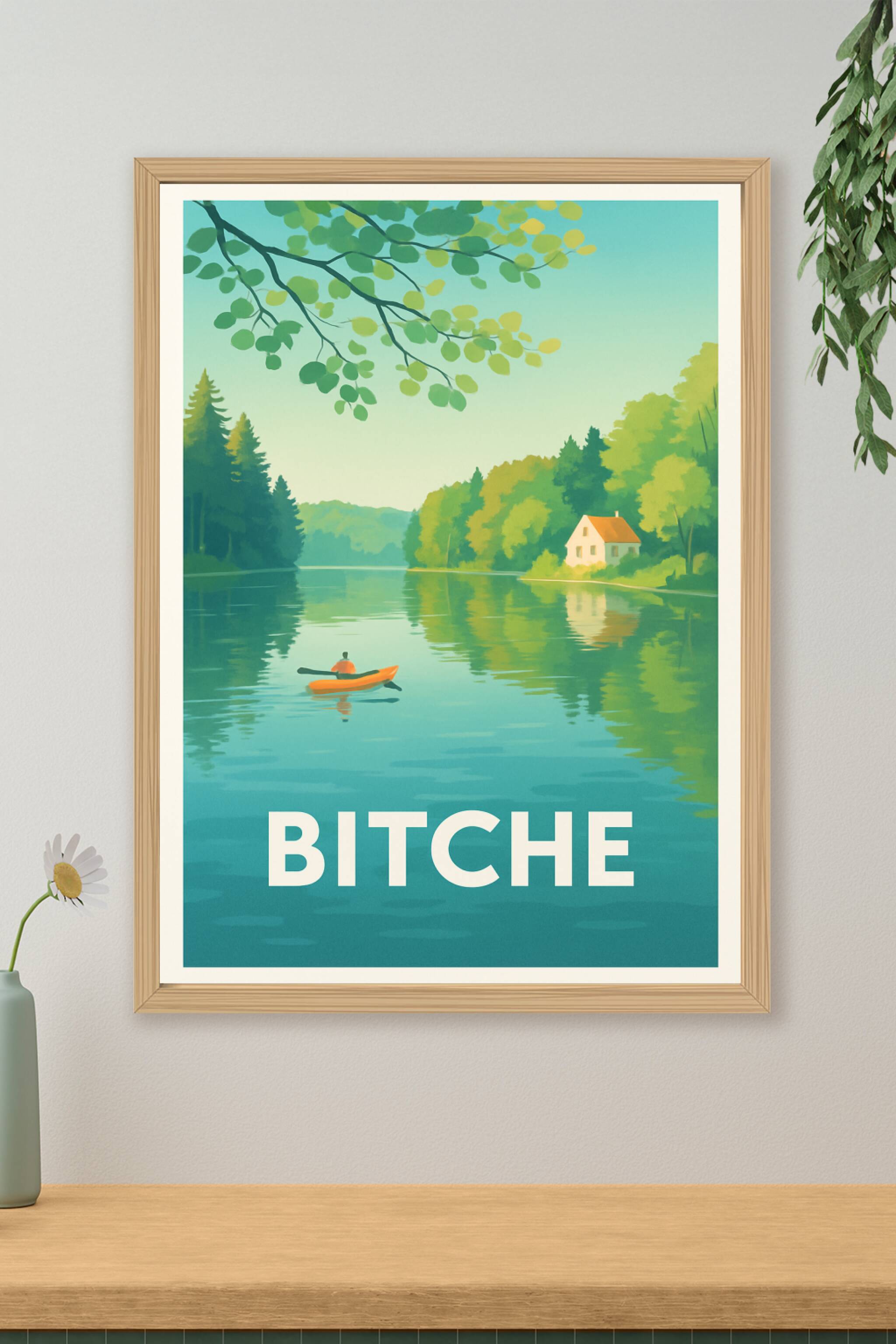 Découvrez la quiétude et la beauté naturelle de Bitche à travers cette affiche illustrée qui capture un moment paisible sur la rivière bordée de fo...