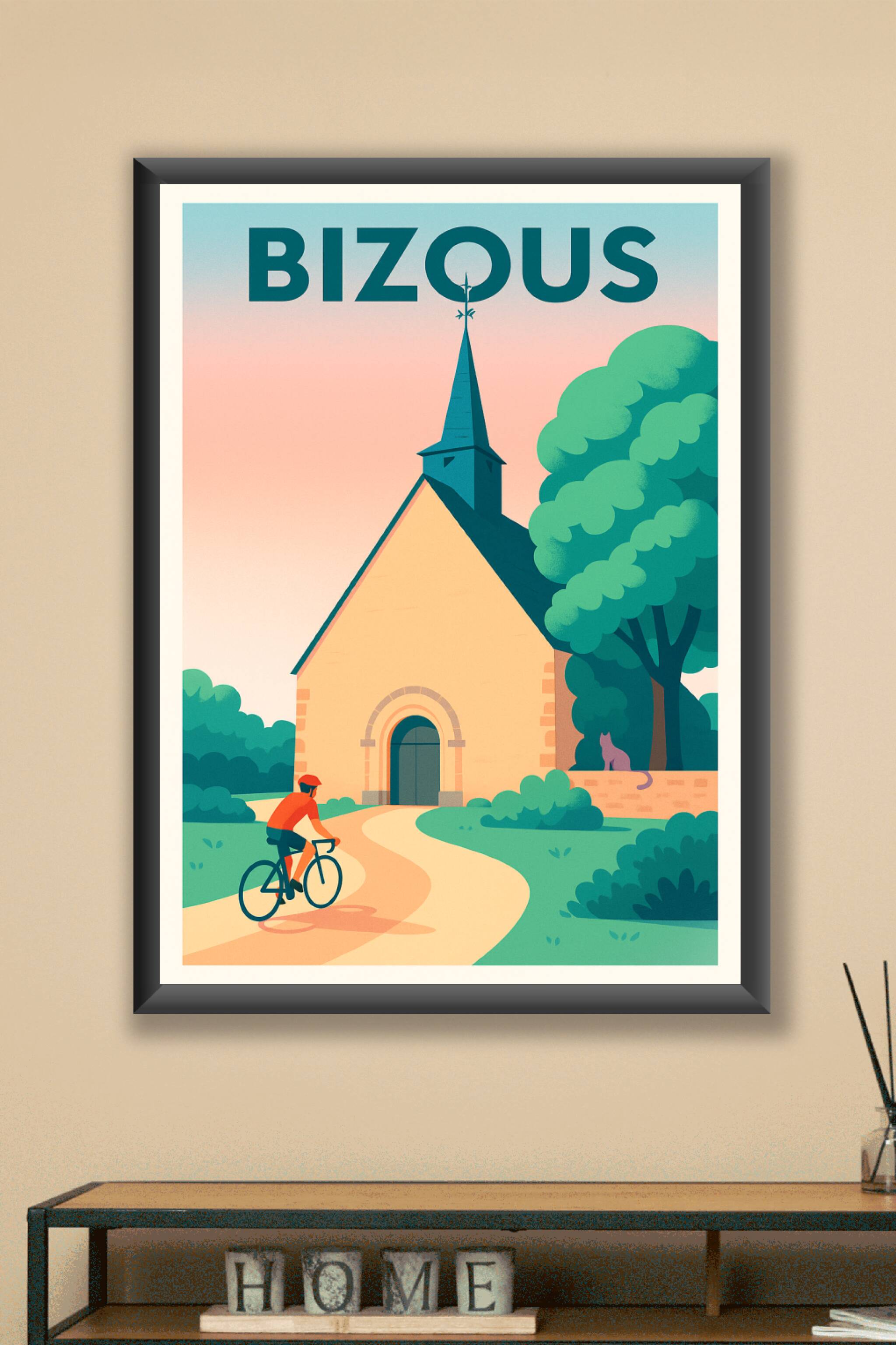 Découvrez l'ambiance paisible et authentique de Bizous avec cette affiche illustrée, mettant en scène une charmante chapelle et un cycliste emprunt...