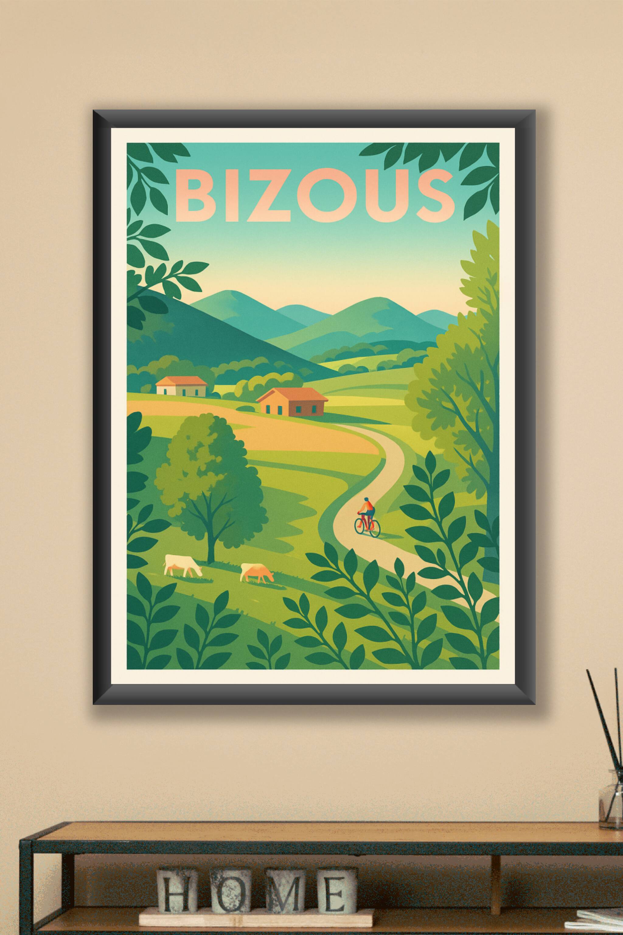 Découvrez la douceur de vivre à Bizous avec cette affiche illustrée mettant en scène un paysage rural paisible, aux couleurs douces et apaisantes. ...