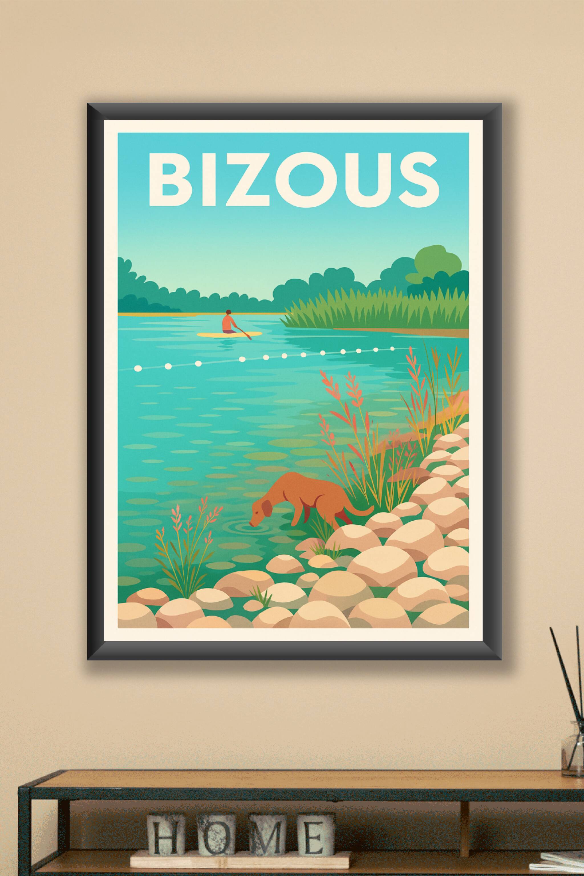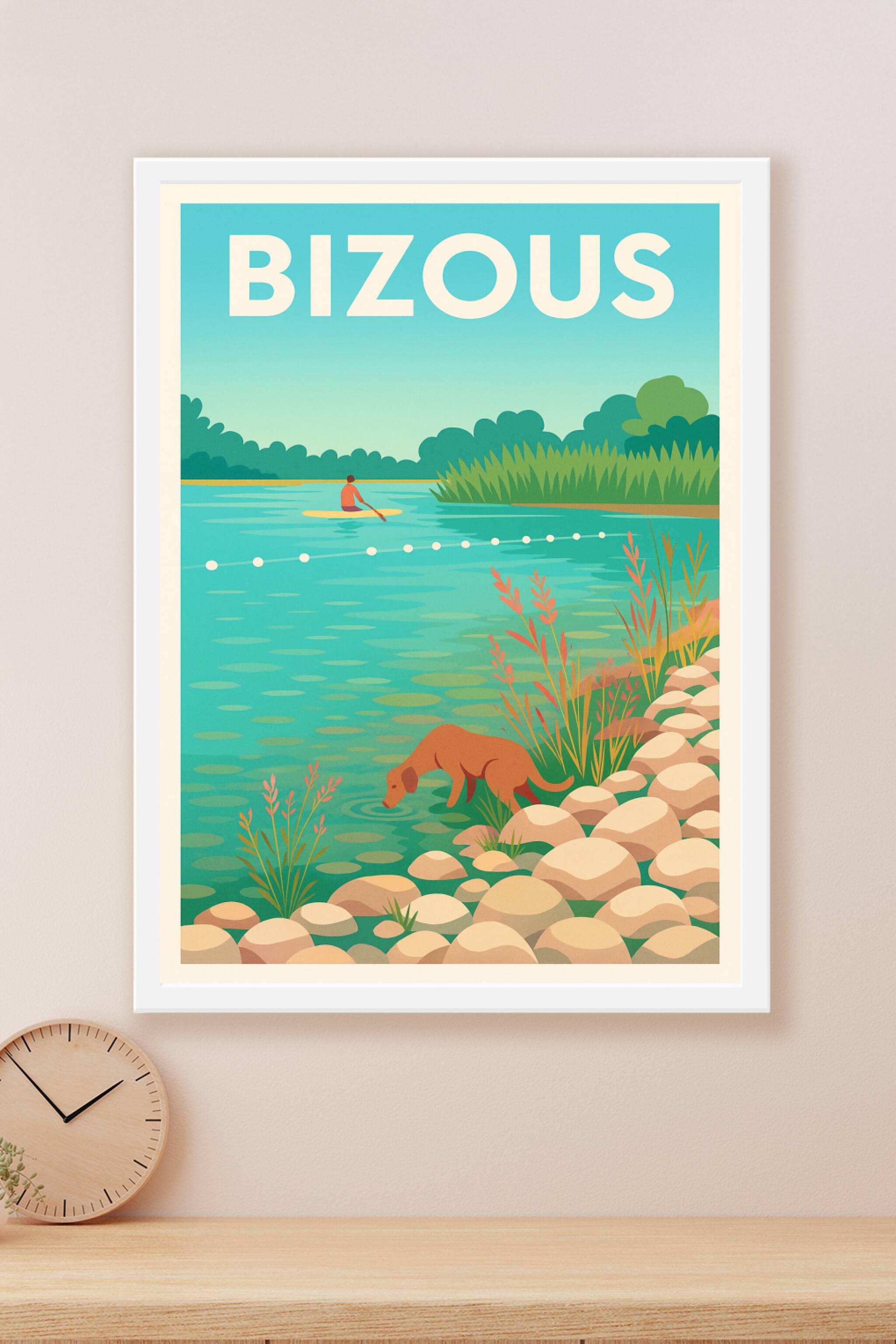 Découvrez cette affiche apaisante illustrant un paysage naturel aux couleurs douces de Bizous. Un chien vient s'abreuver sur les rives rocheuses tandis qu'un pagayeur navigue tranquillement sur l'eau turquoise. Ce poster est idéal pour apporter une touche de sérénité et de fraîcheur à votre décoration intérieure.L'impression Fine Art sur papier 305g coton garantit une qualité exceptionnelle et un rendu des couleurs profond et lumineux. Disponible en formats A1 à A4, avec ou sans cadre, cette affiche s'adapte parfaitement à tous vos espaces, qu'ils soient petits ou grands. Profitez d'un tirage Made in France, parfait pour offrir ou se faire plaisir avec un souvenir visuel unique de Bizous.