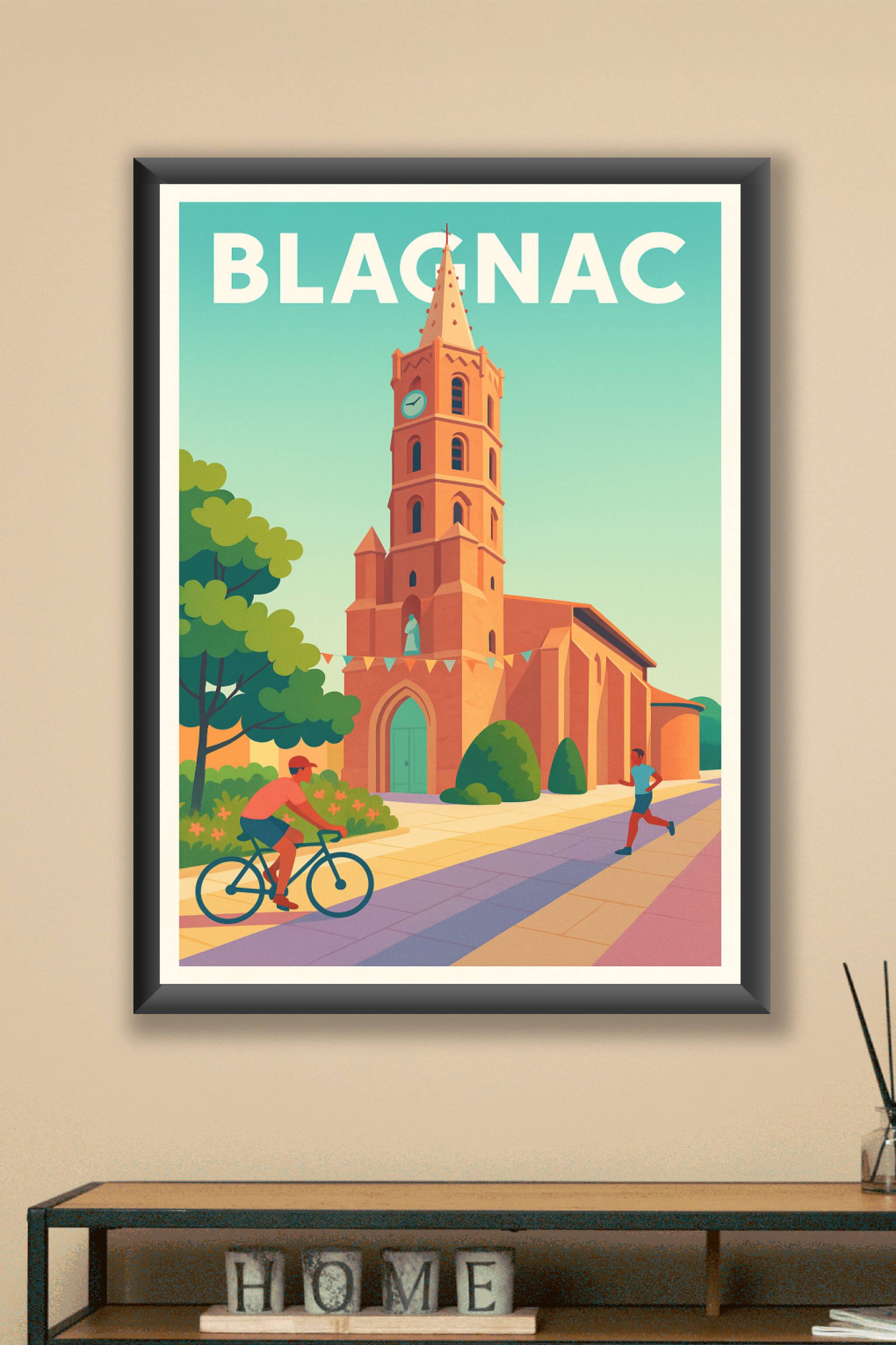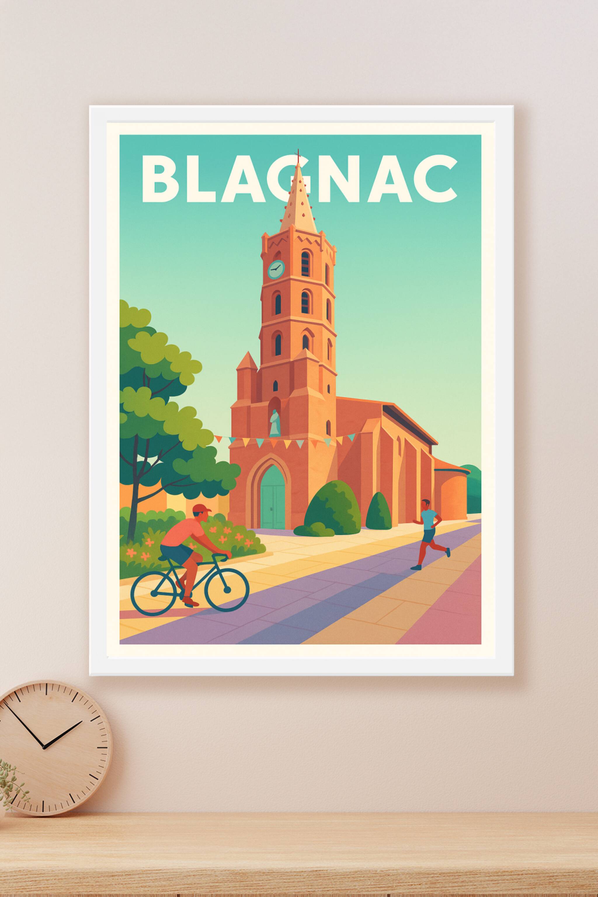 Découvrez l'ambiance paisible et énergique de Blagnac à travers cette affiche illustrée mettant en scène son église typique baignée de lumière chaleureuse, entourée d'une scène urbaine active avec un cycliste et un joggeur. Ce poster est imprimé en tirage "Fine Art" sur un papier 305g coton de haute qualité pour une restitution des couleurs éclatantes et une durabilité exceptionnelle. Disponible en formats A1 à A4, avec ou sans cadre, cette affiche s'intégrera parfaitement dans votre intérieur pour apporter une touche de sérénité et de vie. Profitez d'une impression premium 100% fabriquée en France pour sublimer votre décoration ou offrir un souvenir élégant aux amoureux de Blagnac.