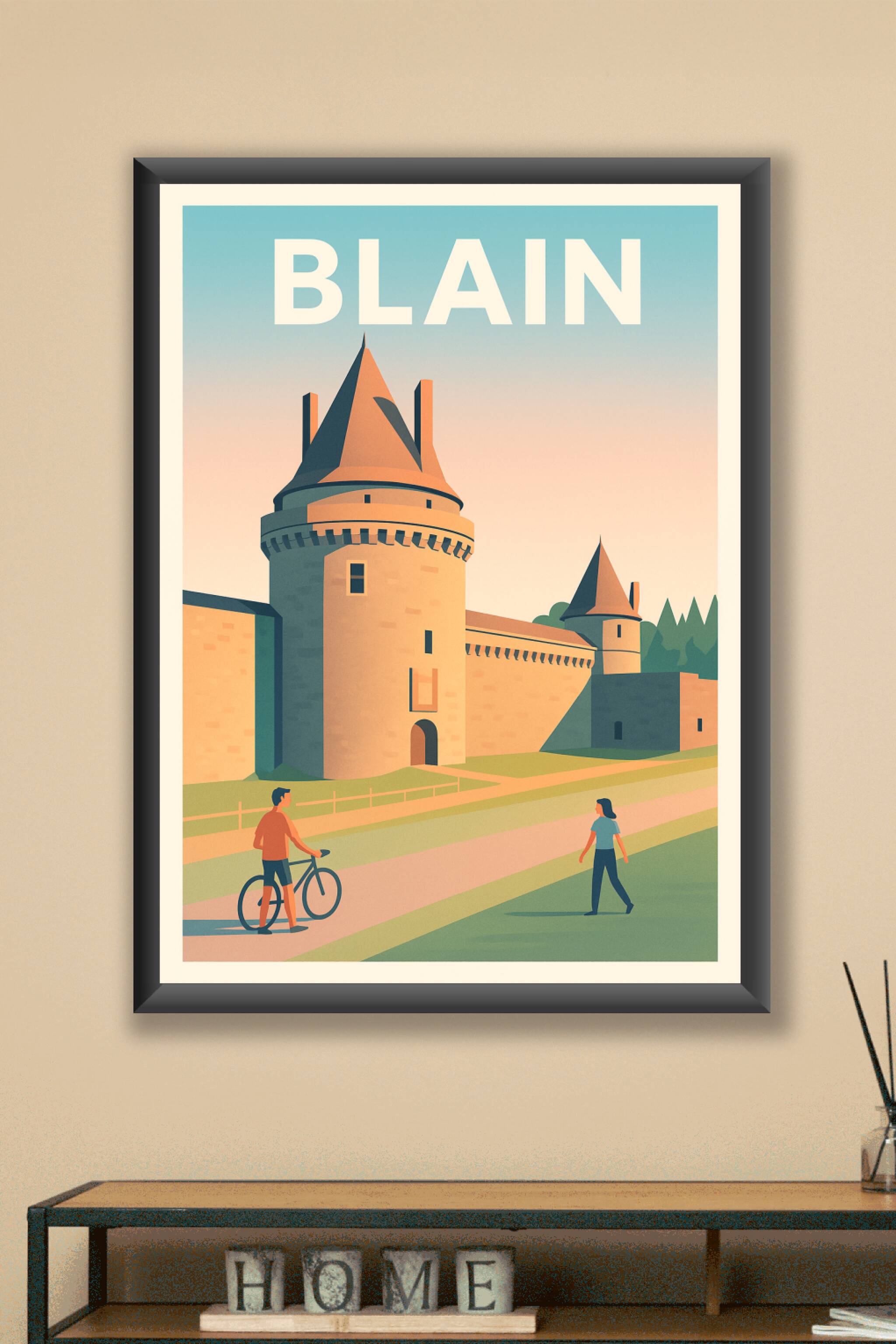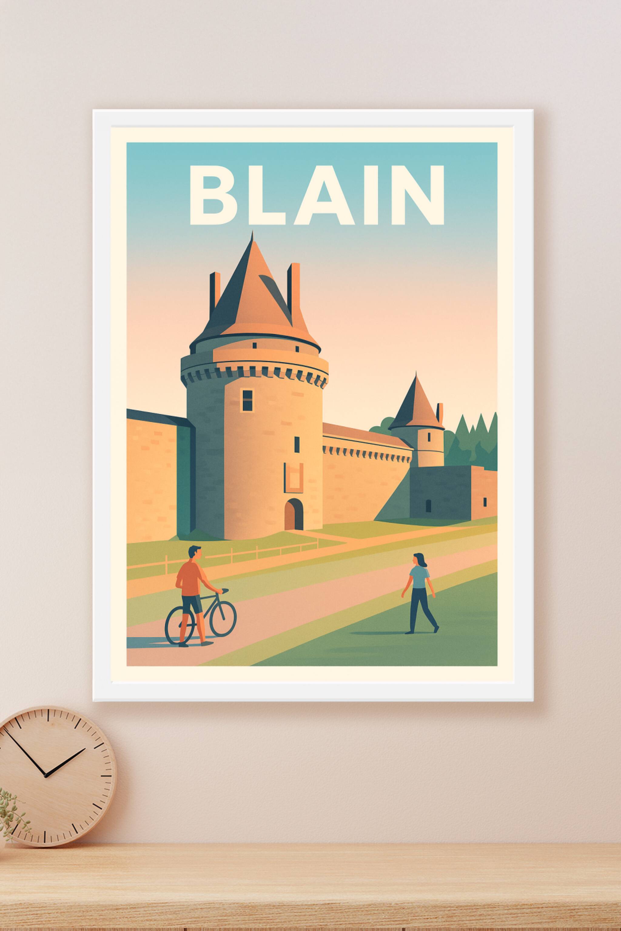 Découvrez l'atmosphère paisible et historique de Blain avec cette affiche illustrée mettant en valeur son château emblématique baigné par la lumièr...