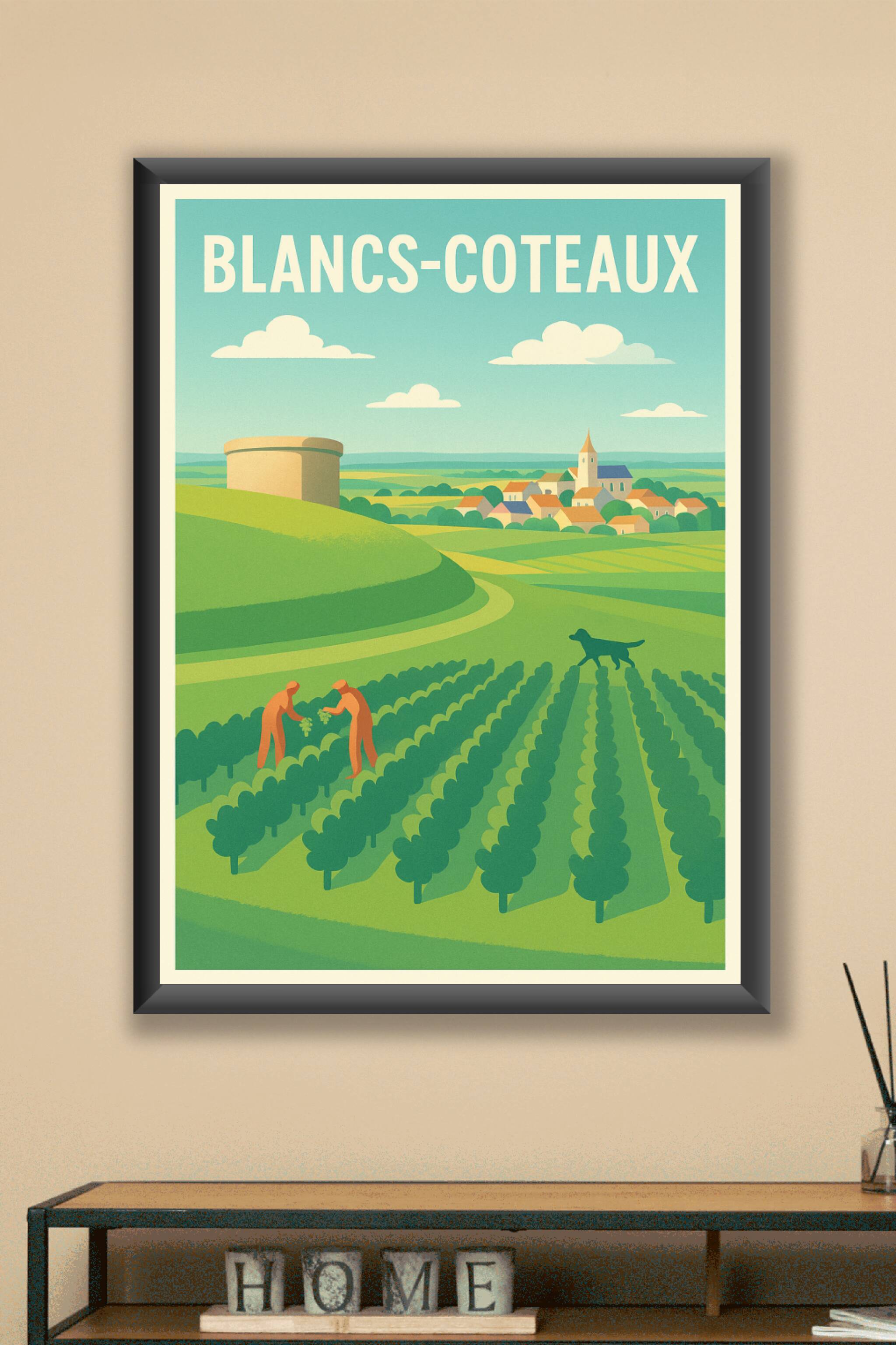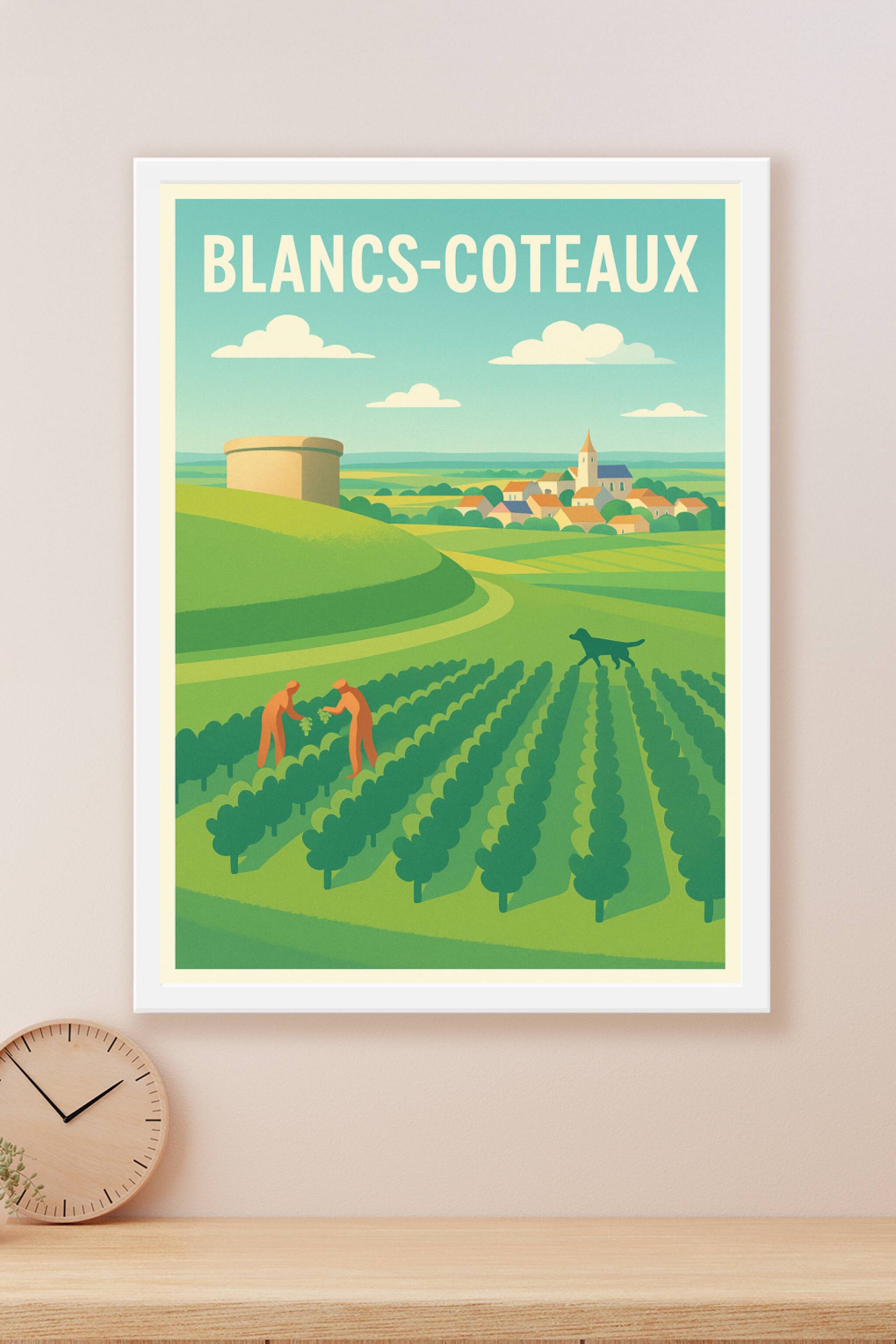 Découvrez l'ambiance paisible et bucolique de Blancs-Coteaux avec cette affiche illustrée mettant en valeur ses vignobles verdoyants et son village...