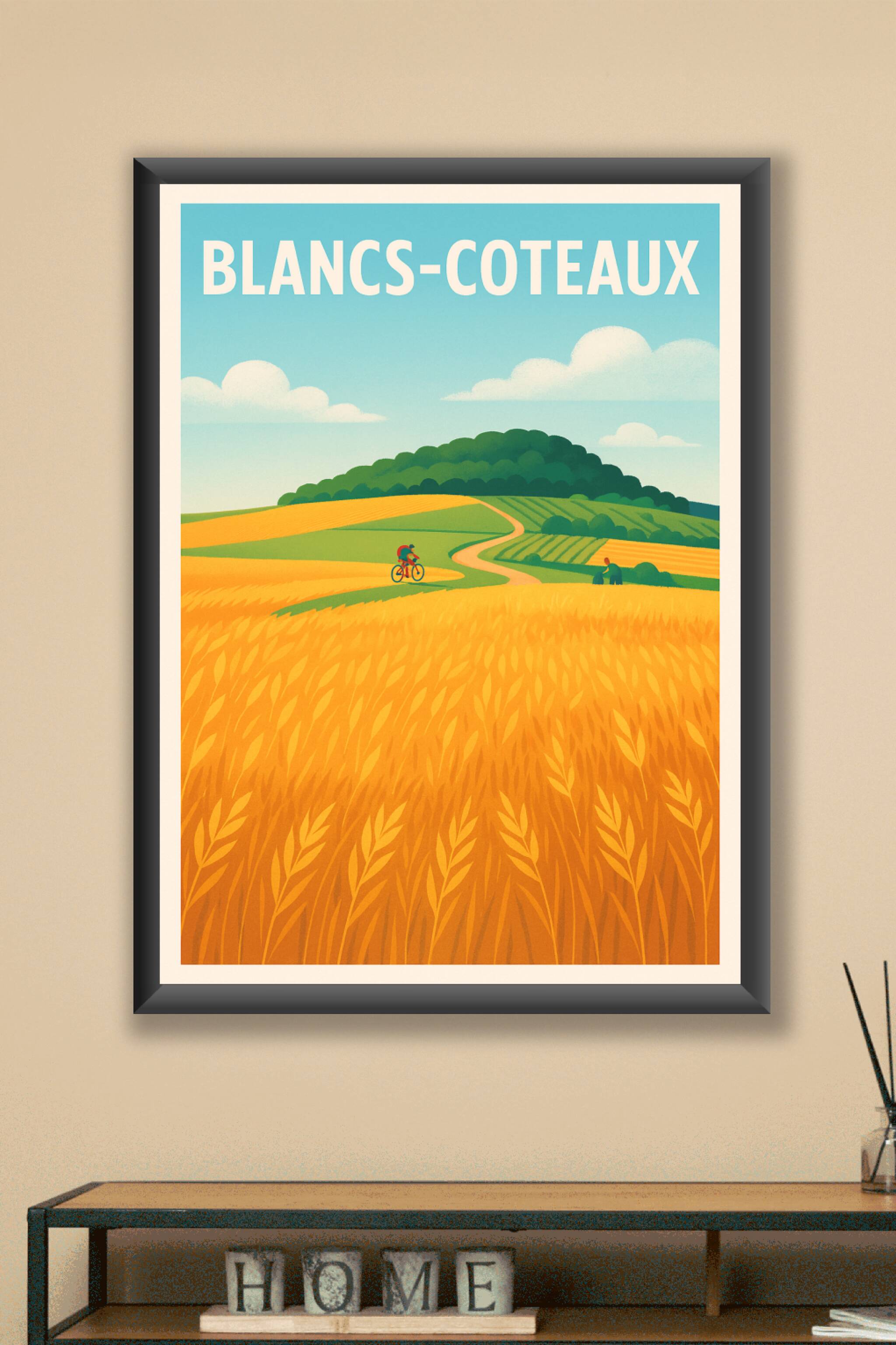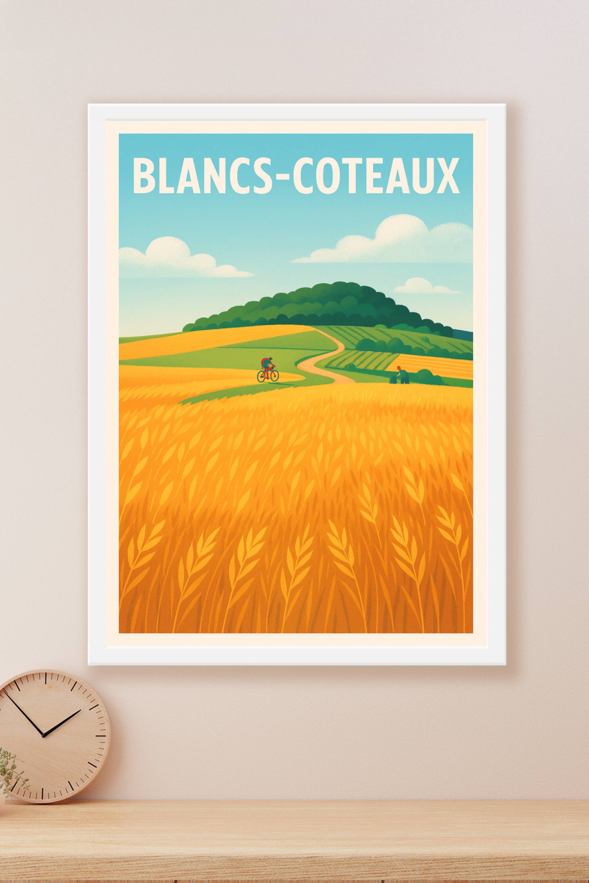 Apportez une touche de sérénité et de nature lumineuse à votre intérieur avec cette affiche illustrée représentant les paysages dorés et vallonnés des Blancs-Coteaux. On y découvre un chemin sinueux dans des champs de blé doré, ponctué par un cycliste et des promeneurs, sous un ciel bleu éclatant.Ce poster est imprimé en tirage "Fine Art" sur un papier 305g coton de haute qualité pour des couleurs vibrantes et une durabilité optimale. Disponible en formats A1 à A4, avec ou sans cadre, il s'adapte parfaitement à tous les styles de décoration intérieure.Profitez d'une impression premium française pour sublimer votre maison ou offrir un cadeau unique aux amoureux de paysages champêtres.