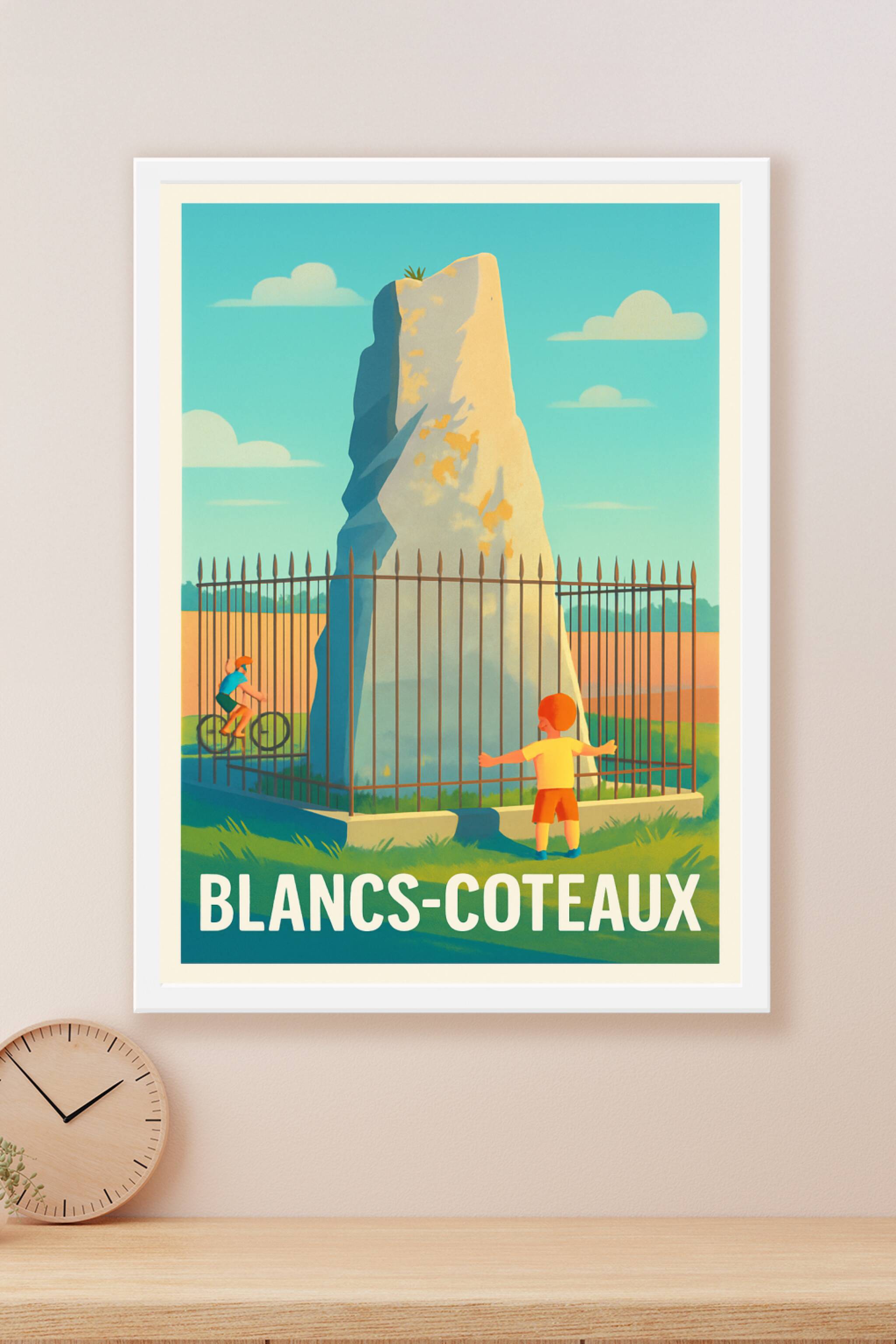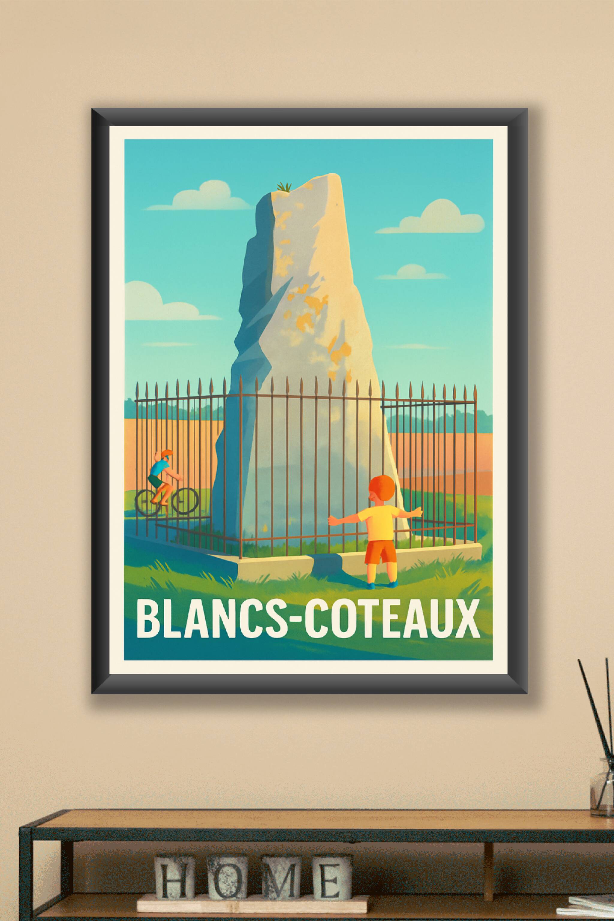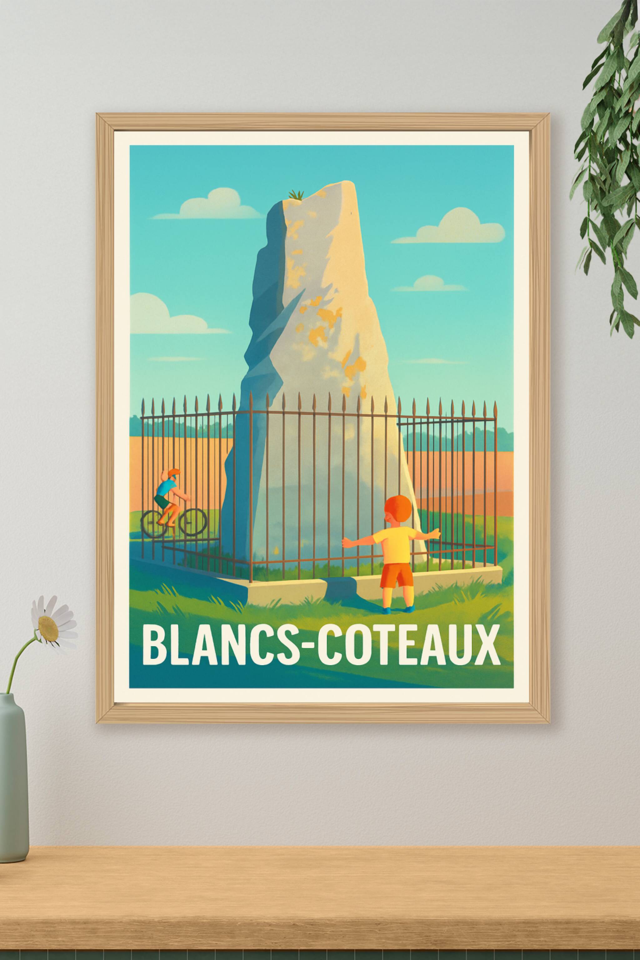 Apportez une ambiance paisible et bucolique à votre intérieur avec cette affiche illustrée mettant en scène le célèbre menhir entouré d'une grille, sous un ciel bleu éclatant. Cette représentation rétro et colorée de Blancs-Coteaux capture un moment simple et touchant, où un enfant admire la pierre tandis qu'un cycliste passe à proximité.Ce poster est imprimé en tirage "Fine Art" sur papier 305g coton offrant une qualité d'impression exceptionnelle, aux couleurs vives et à la finition soignée. Disponible en formats A1 à A4, avec ou sans cadre, cette affiche vous permet de personnaliser votre décoration selon votre espace et vos envies.Profitez d'une production 100% française pour sublimer votre décoration ou offrir un souvenir unique et élégant lié à Blancs-Coteaux.