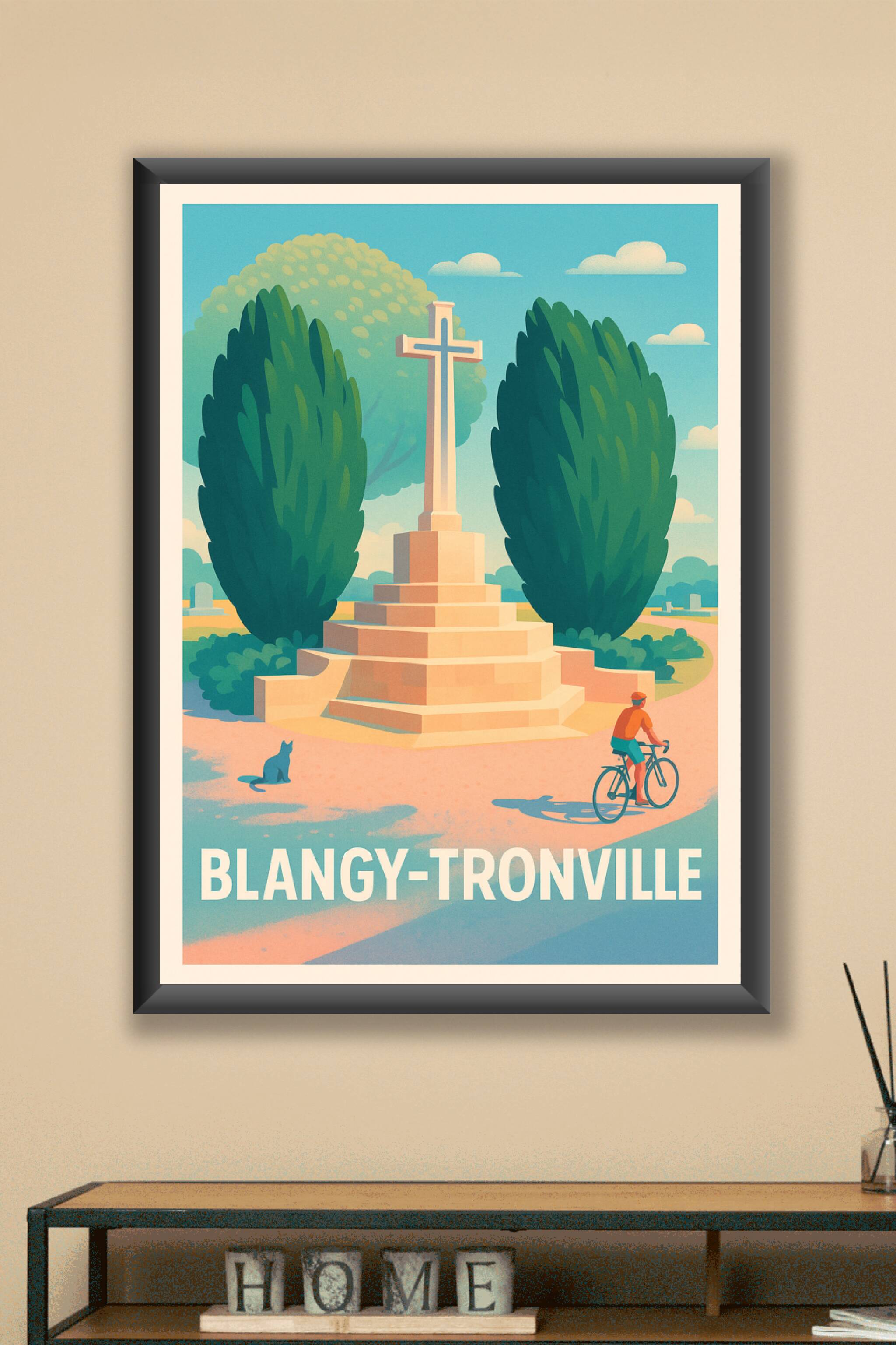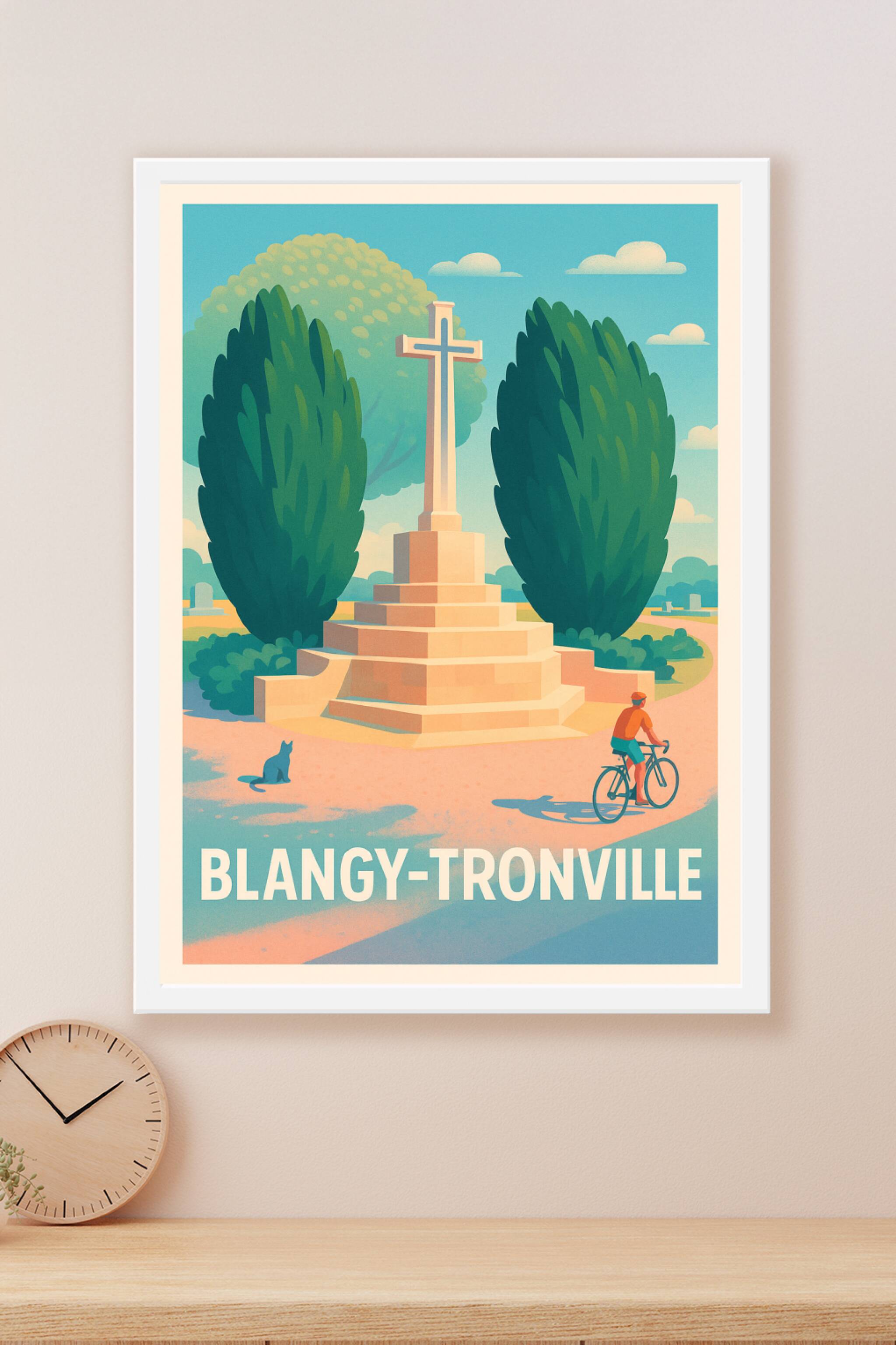 Découvrez l'atmosphère sereine et authentique de Blangy-Tronville avec cette affiche illustrée, mettant en avant une grande croix monumentale encad...