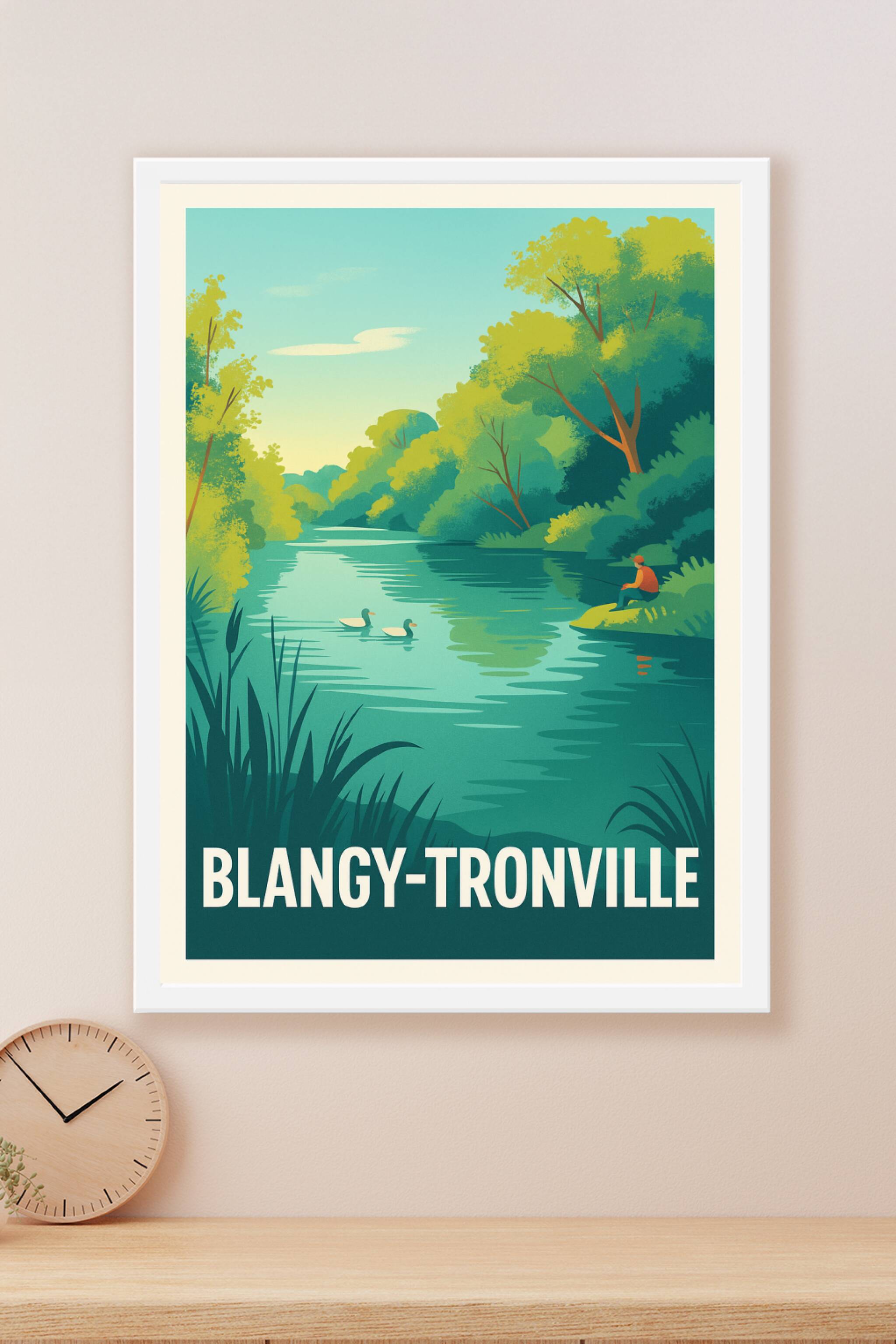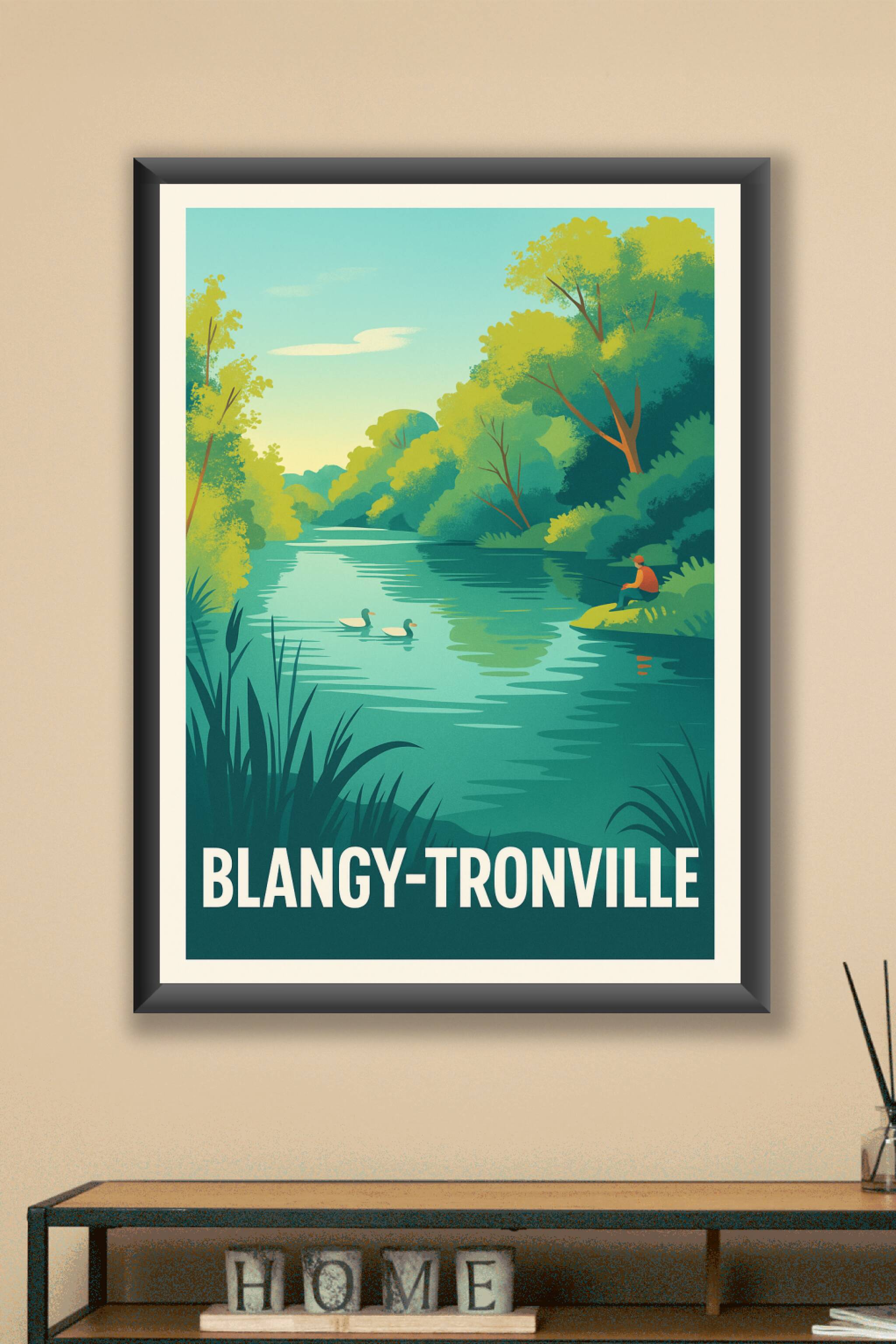 Découvrez la sérénité de Blangy-Tronville à travers cette affiche artistique qui capture un moment de tranquillité au bord de la rivière, entouré d...