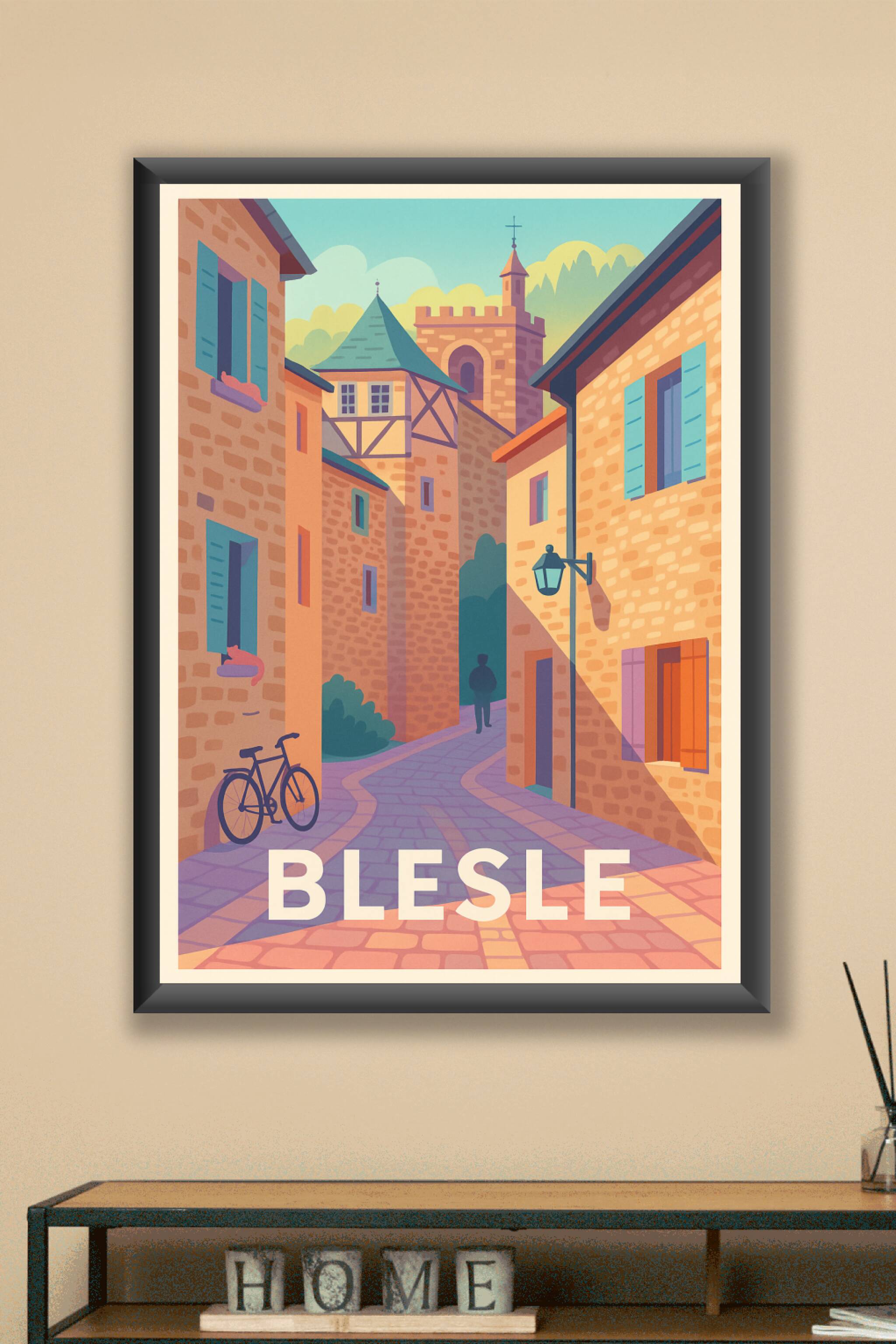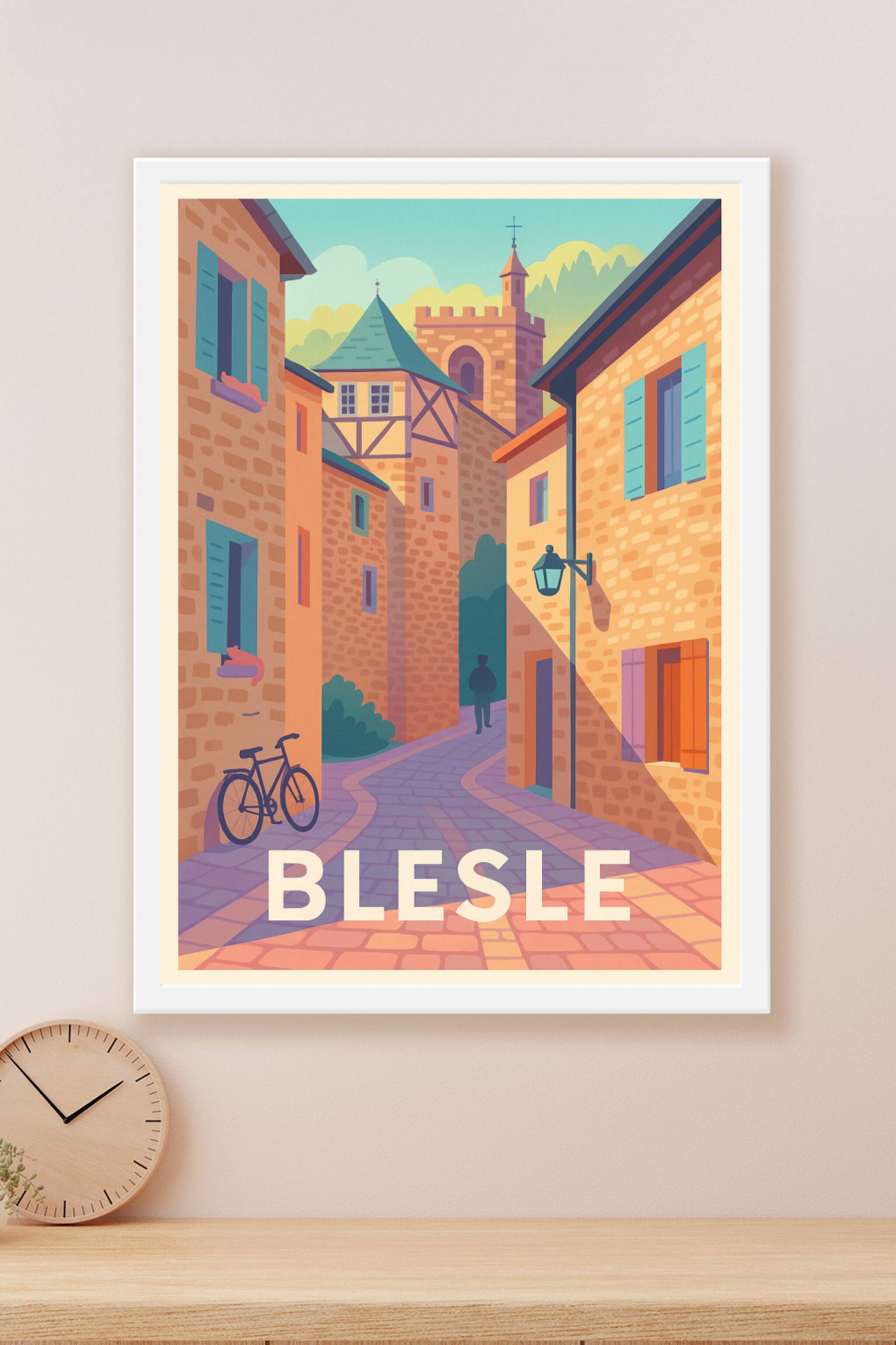 Découvrez l'ambiance chaleureuse et authentique de Blesle à travers cette affiche au style illustratif et coloré. Ce poster capture une ruelle pavé...