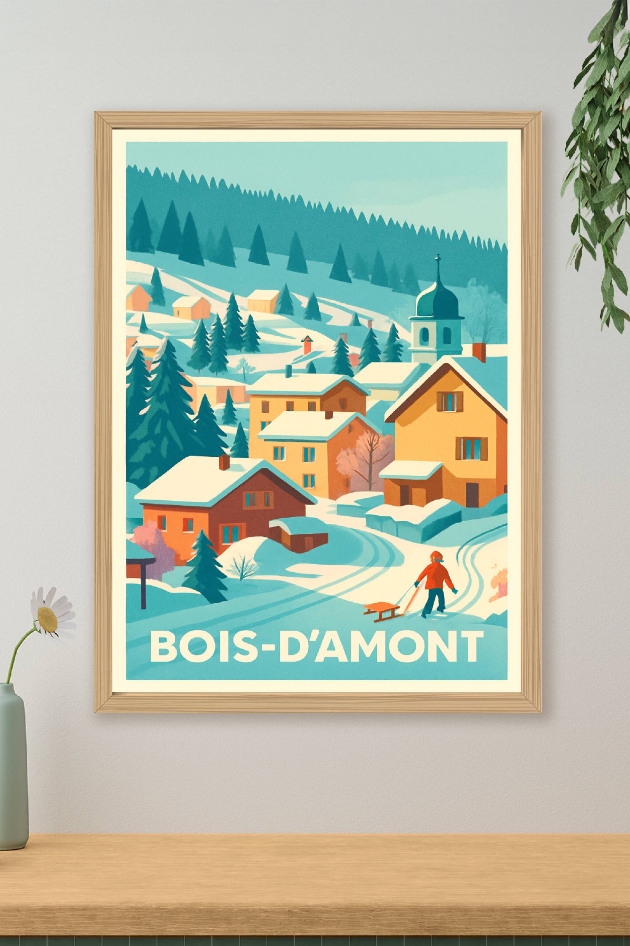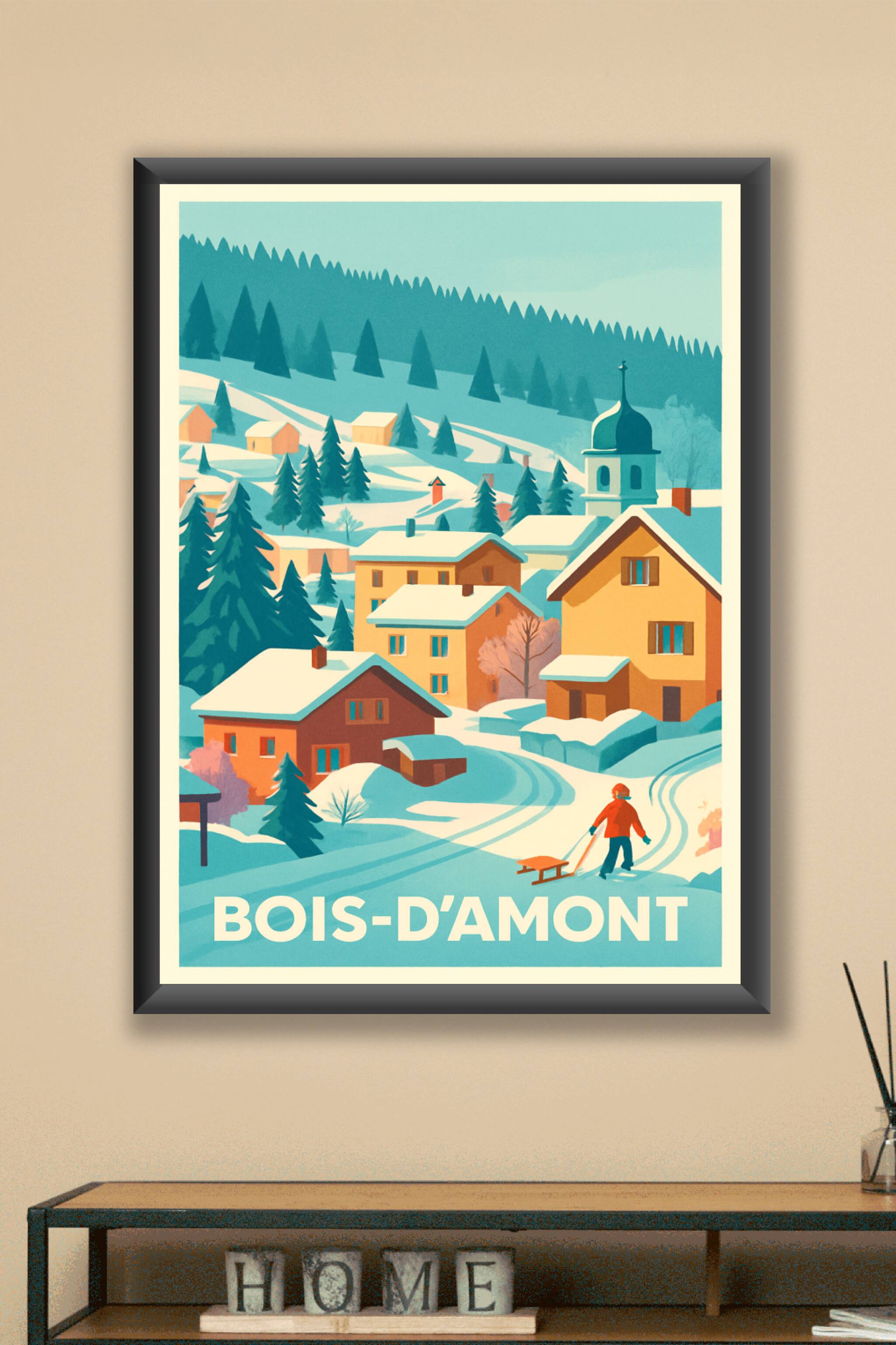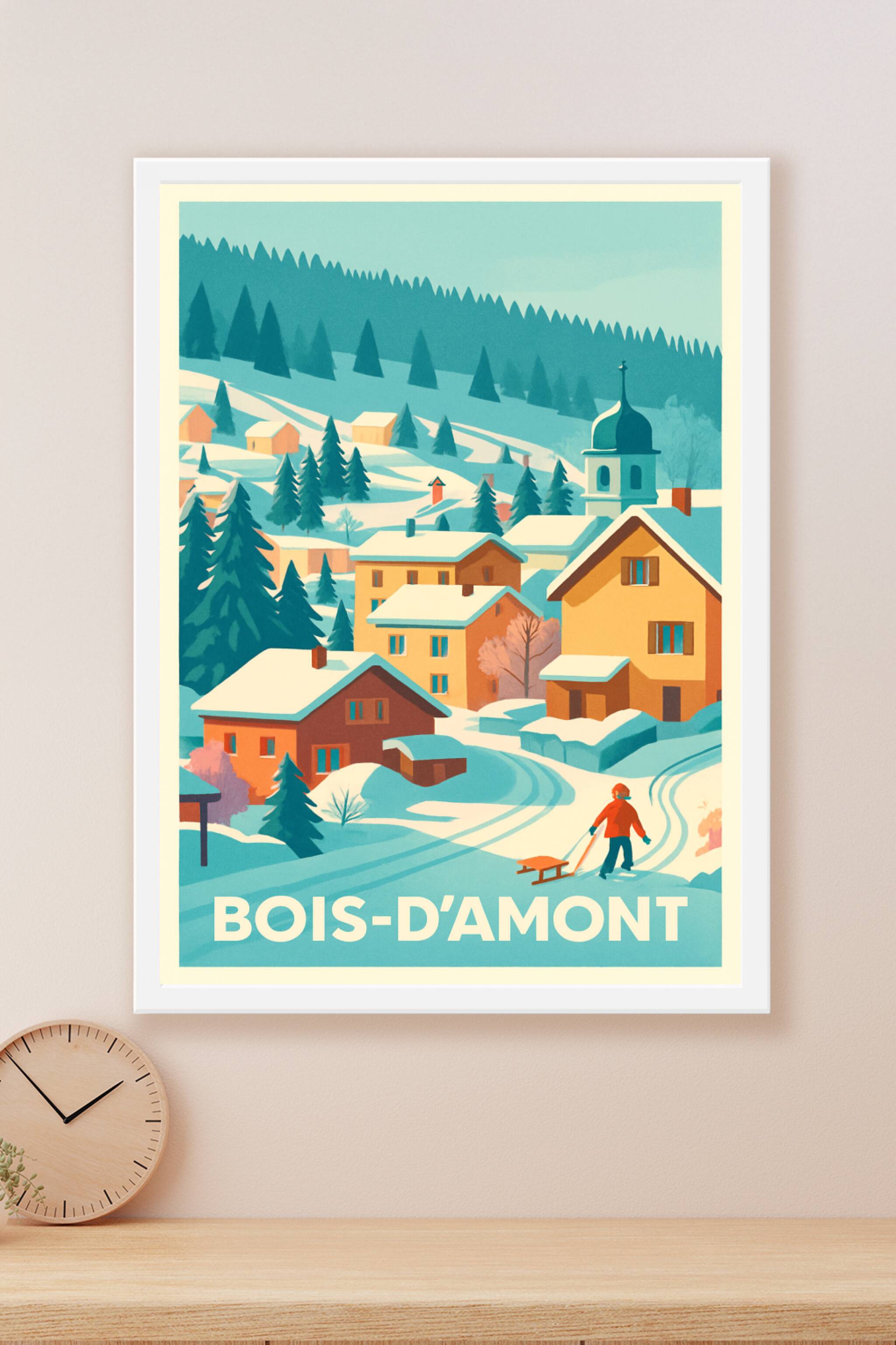 Découvrez l'atmosphère paisible et féerique de Bois-d'Amont, illustrée dans cette affiche au style vintage chaleureux. Le village enneigé, ses mais...