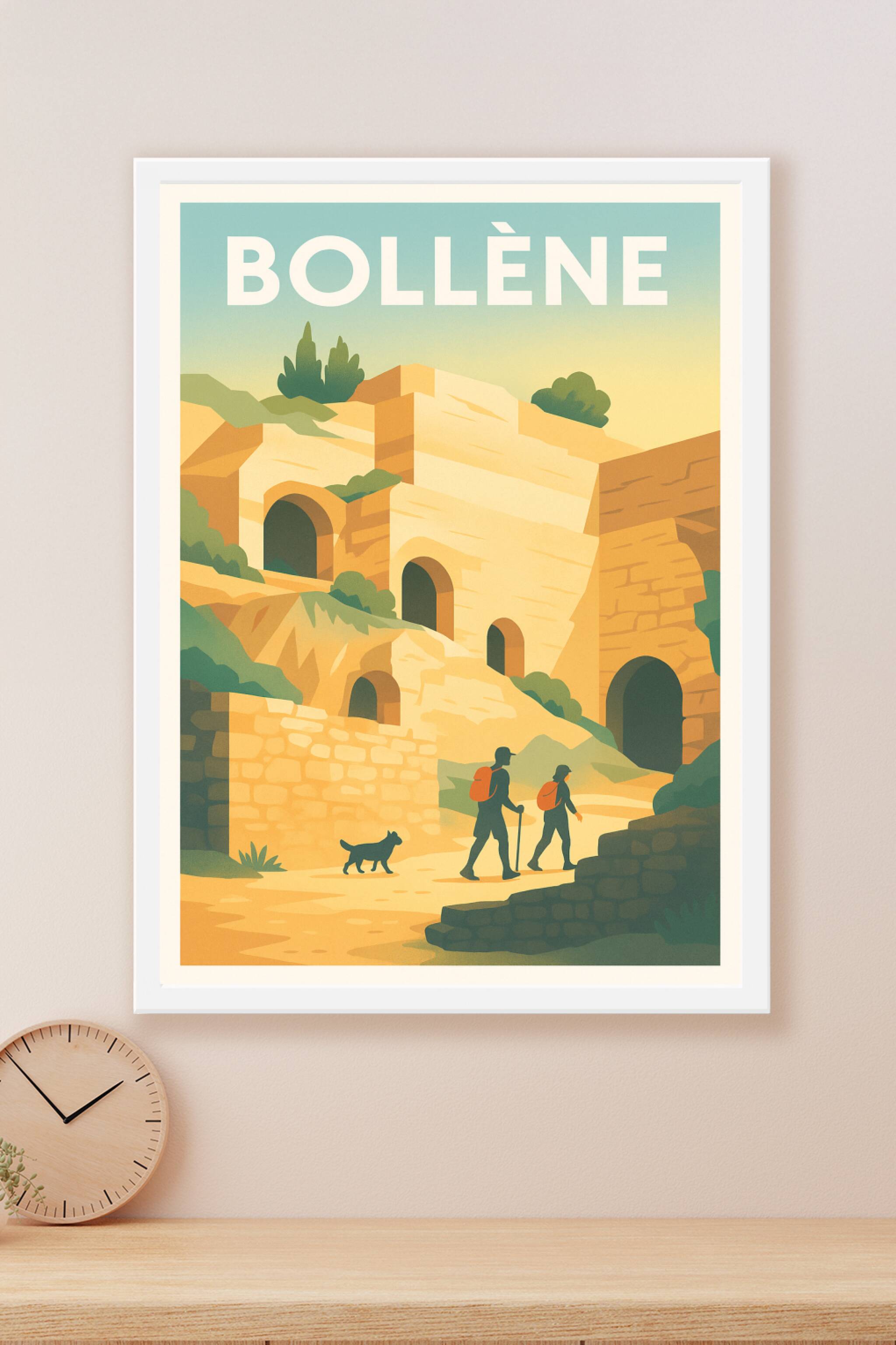 Découvrez la richesse historique et la douceur de vivre de Bollène avec cette affiche illustrée d'une scène de randonnée au milieu des vestiges ens...