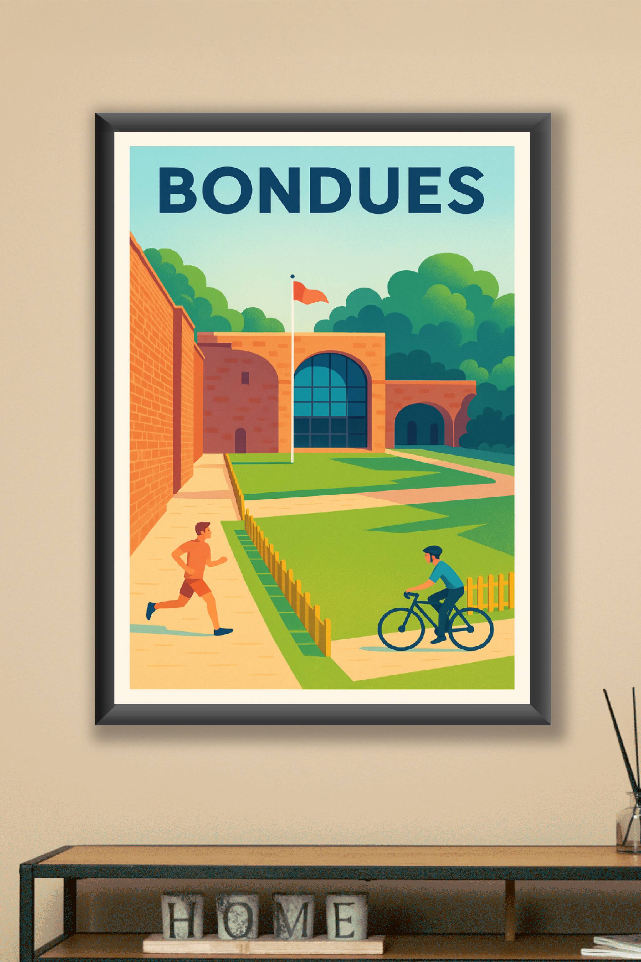 Admirez la tranquillité et la fraîcheur de Bondues à travers cette affiche au style vintage et lumineux. Illustrant un espace vert où jogger et cyc...