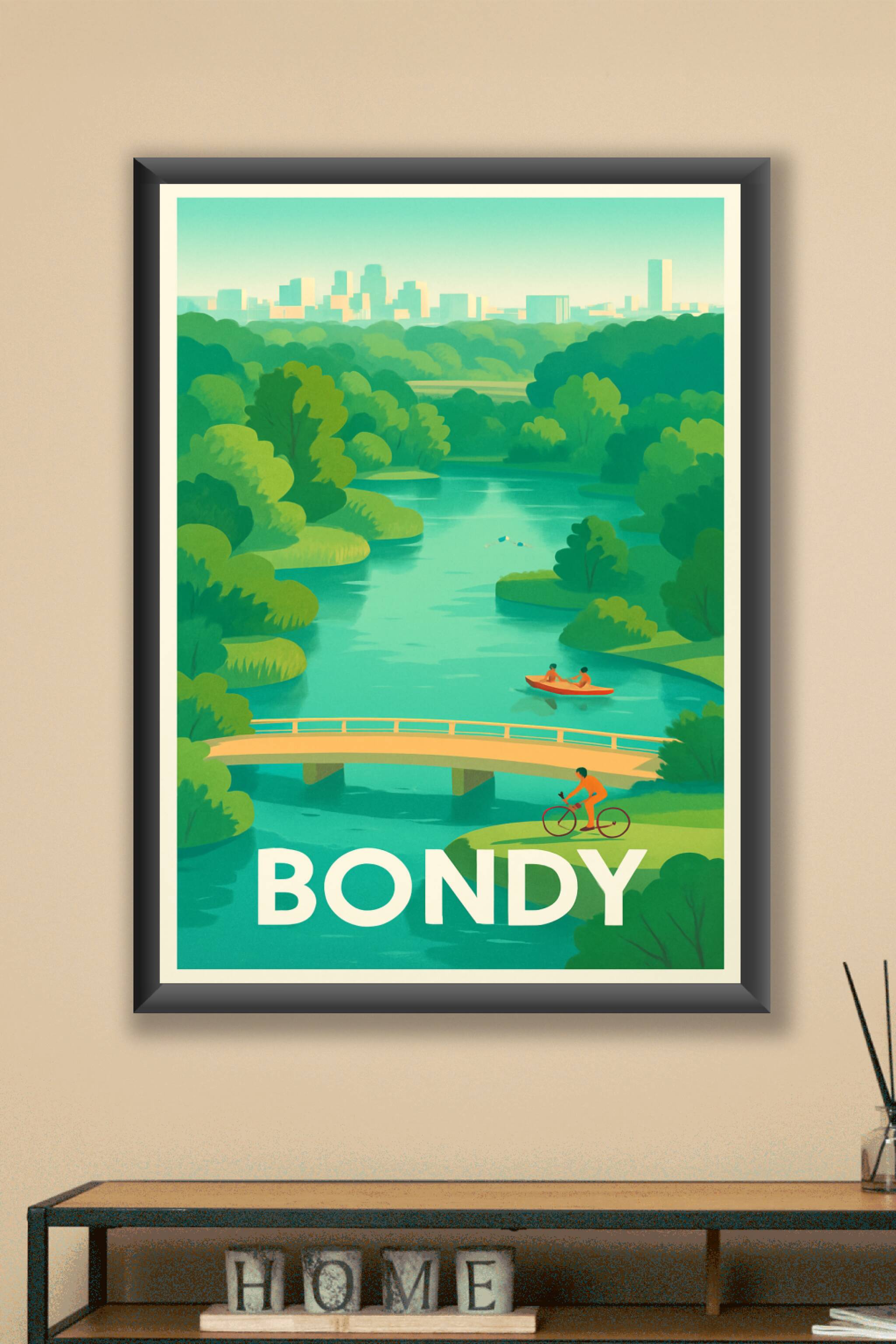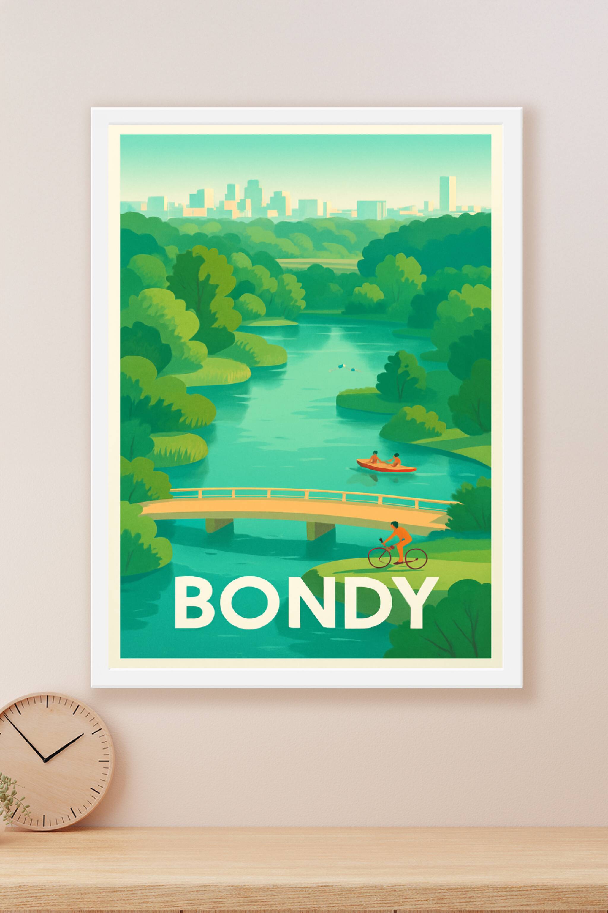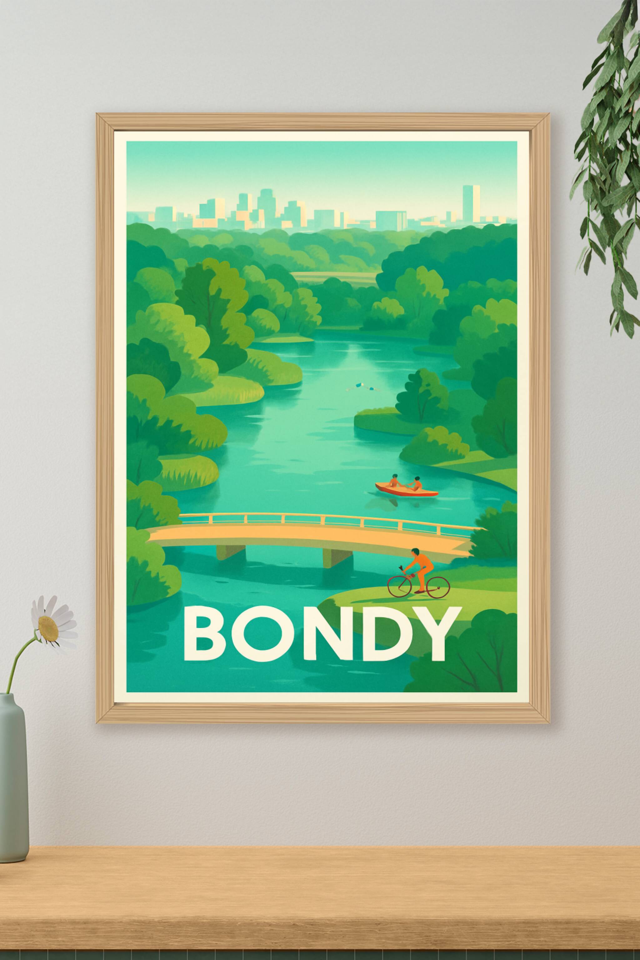 Découvrez Bondy sous un regard apaisant avec cette affiche vintage qui met en valeur les espaces verts et la sérénité de cette ville en bordure de ...