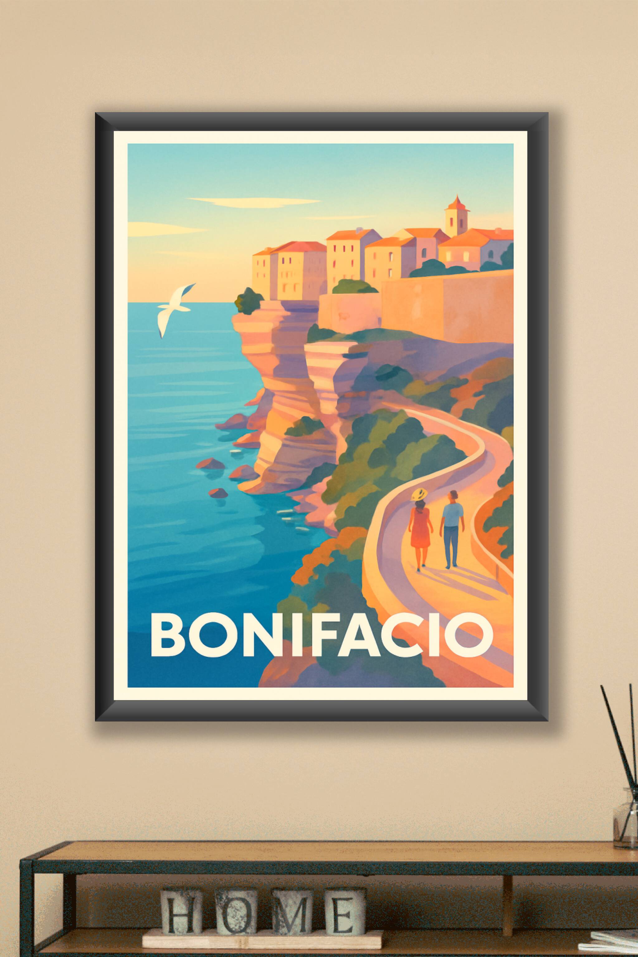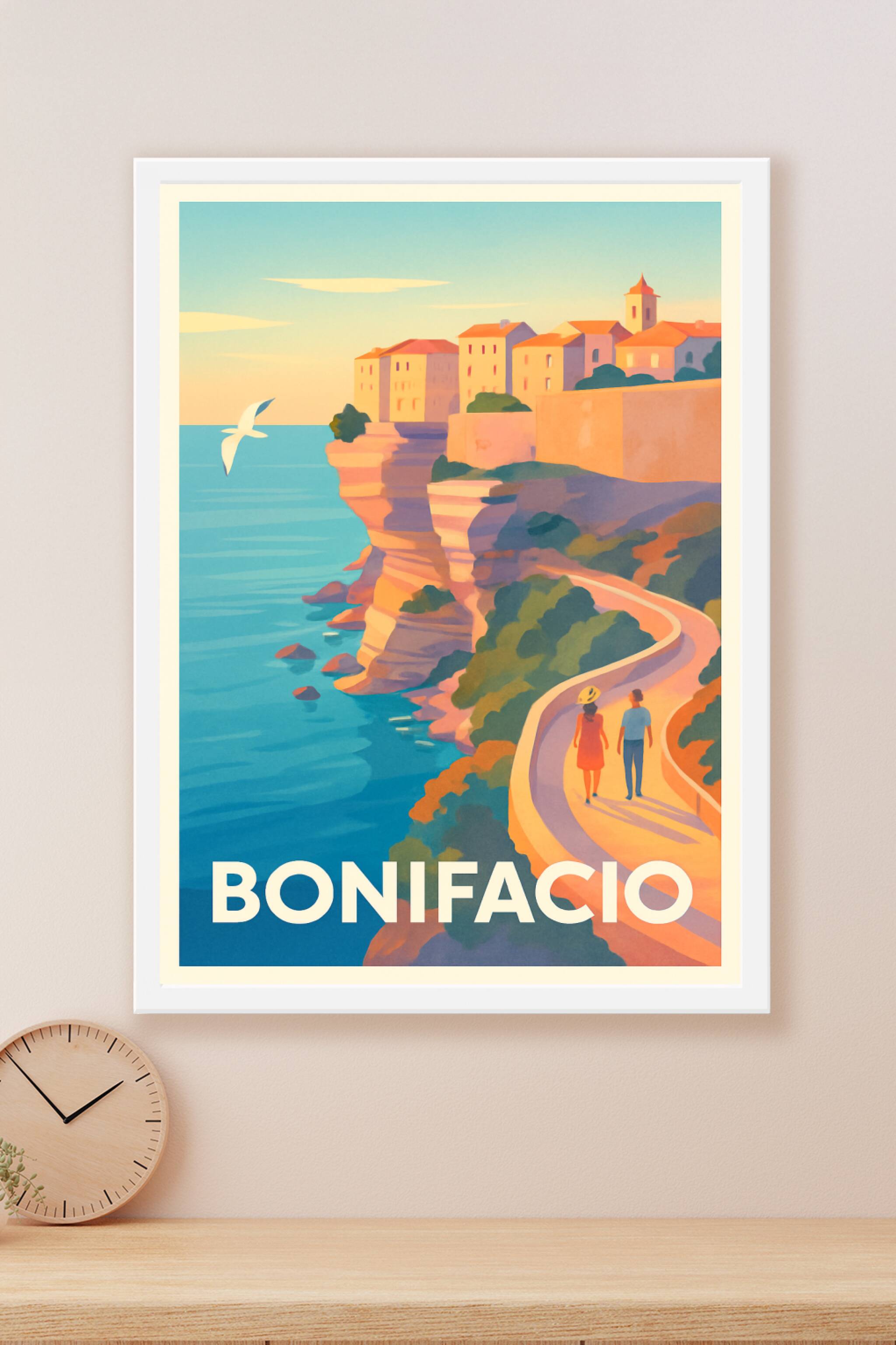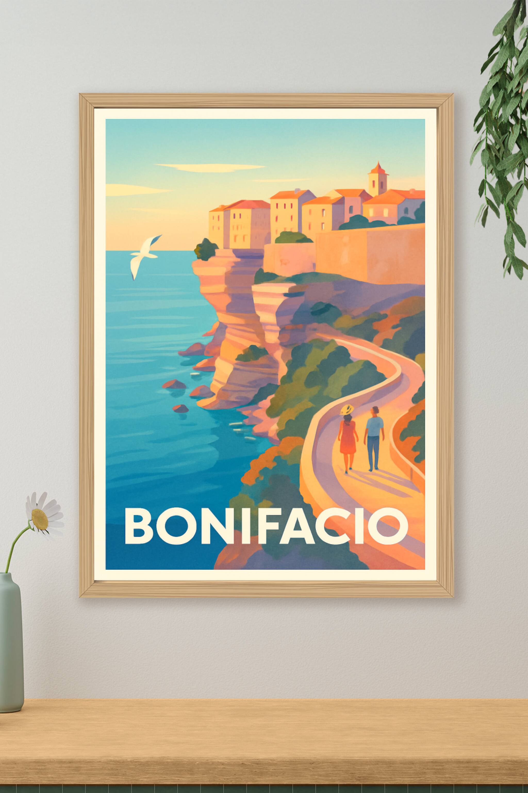 Découvrez la beauté saisissante de Bonifacio avec cette affiche illustrée au style doux et lumineux qui met en valeur ses célèbres falaises calcair...