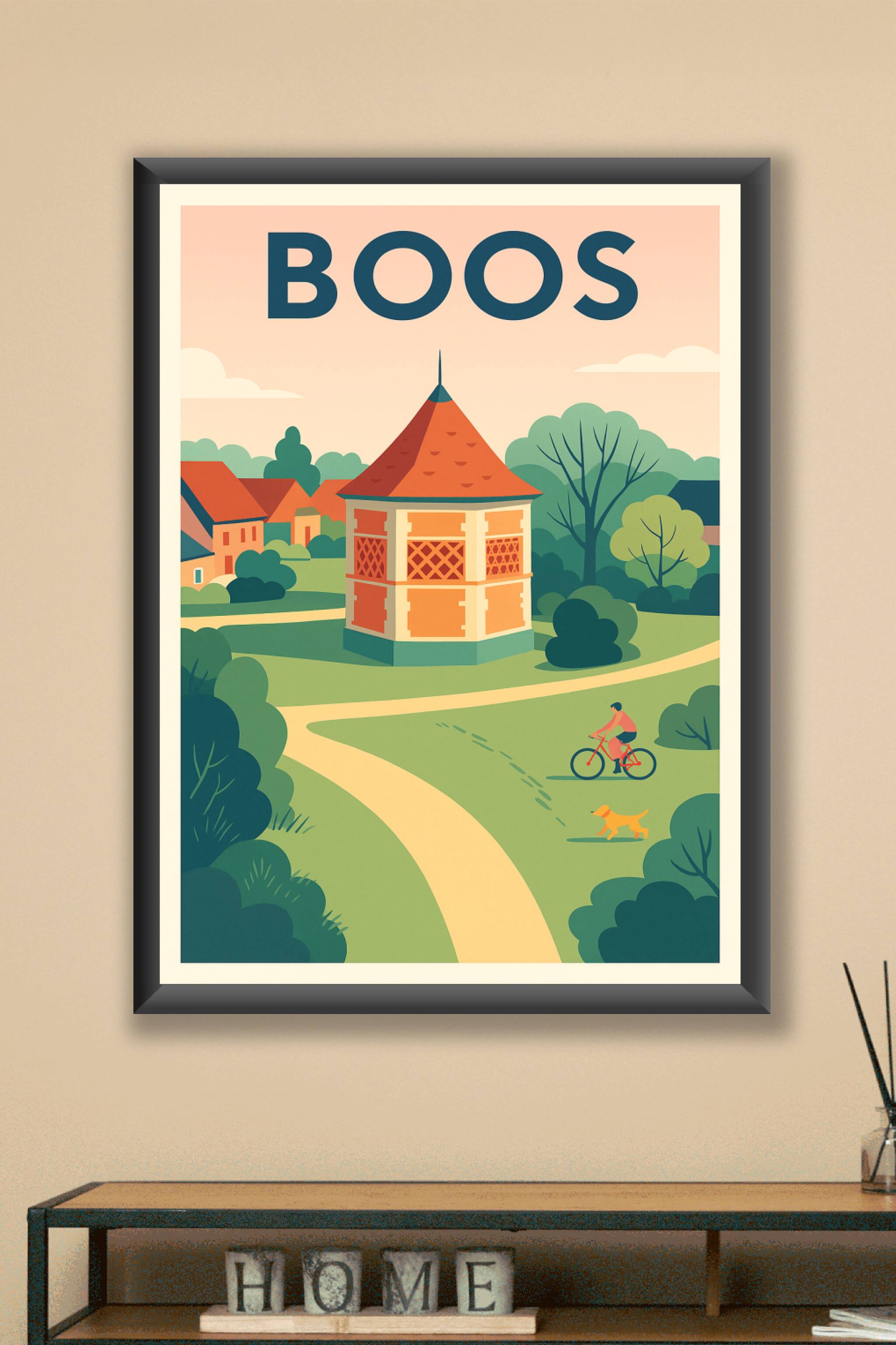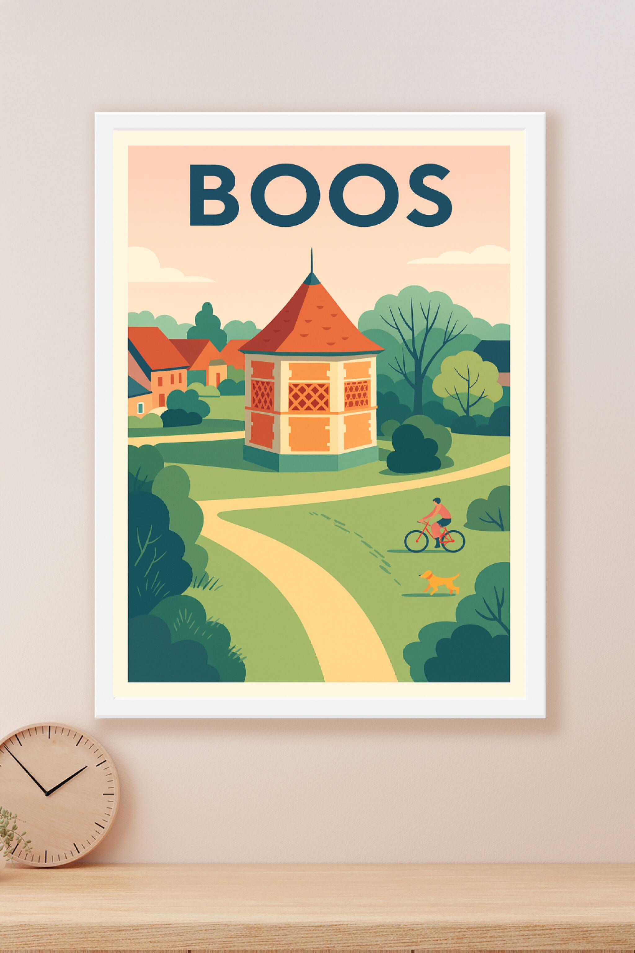 Découvrez l'ambiance paisible et bucolique de Boos avec cette affiche illustrée au style vintage et chaleureux. Au cœur de la campagne verdoyante, ...