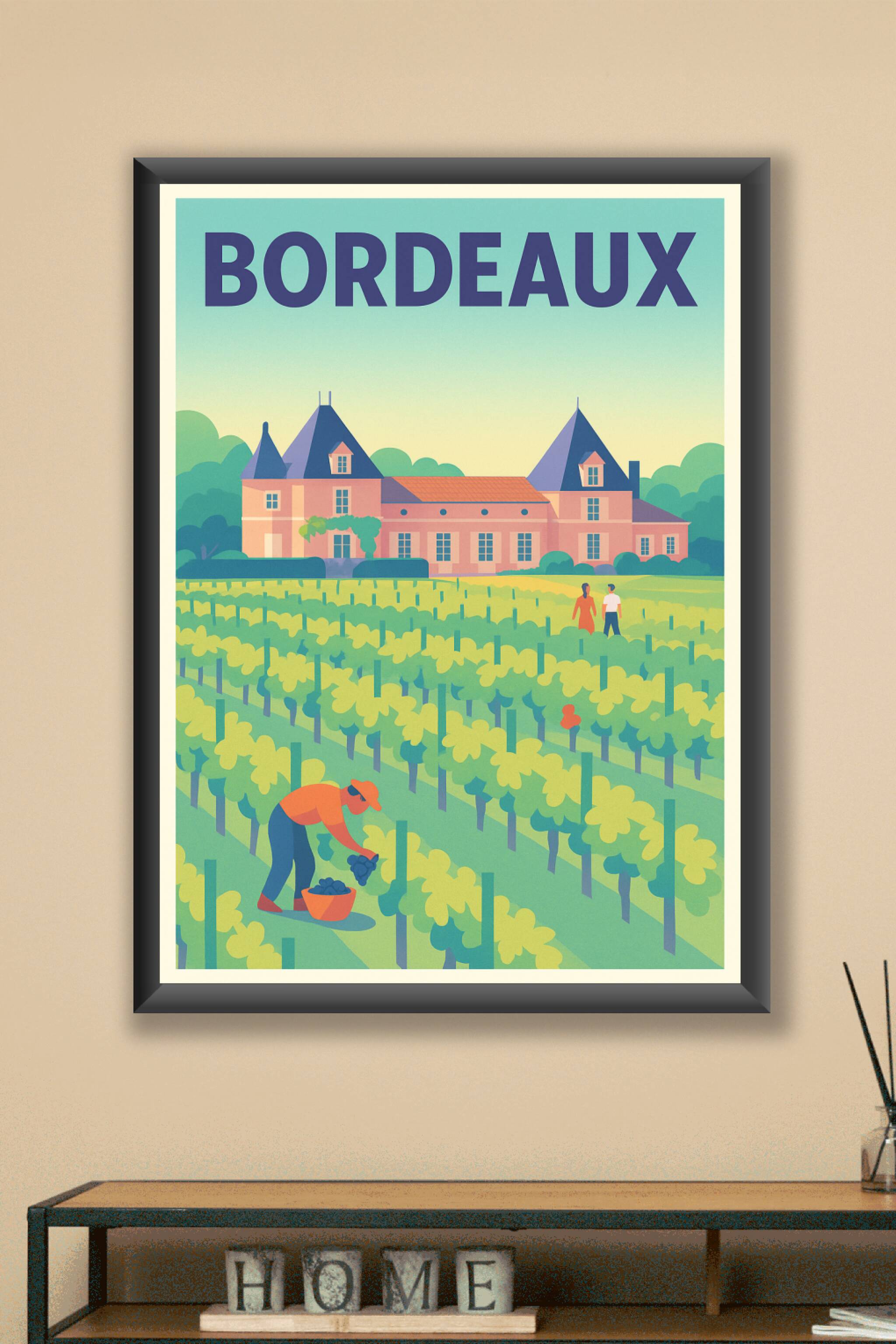 Découvrez l'ambiance bucolique des vignobles bordelais avec cette affiche élégante représentant une scène typique de la région, alliant douceur des...