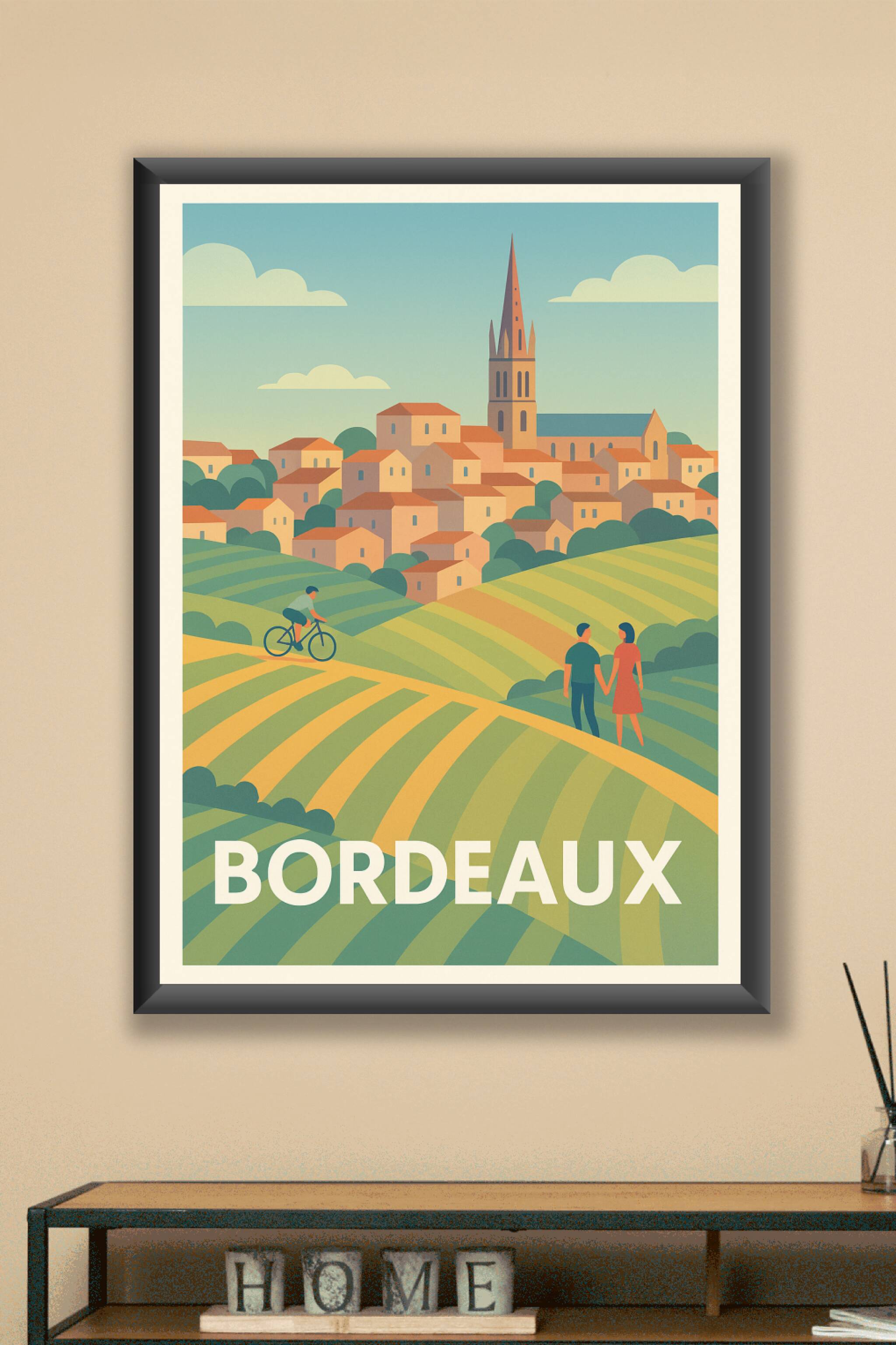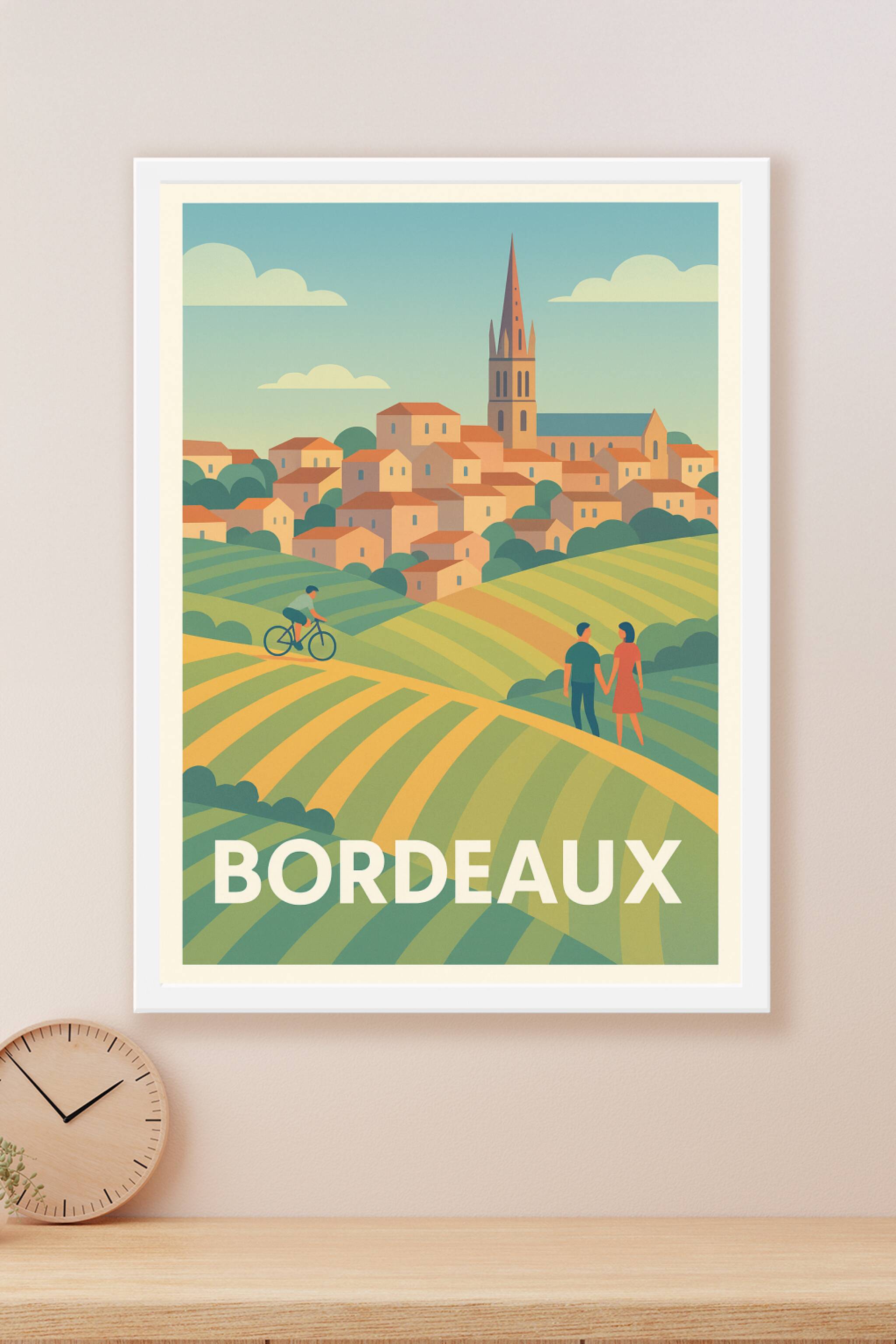 Découvrez l'élégance bucolique de Bordeaux avec cette affiche illustrée aux couleurs douces et apaisantes, mettant en scène les paysages vallonnés ...