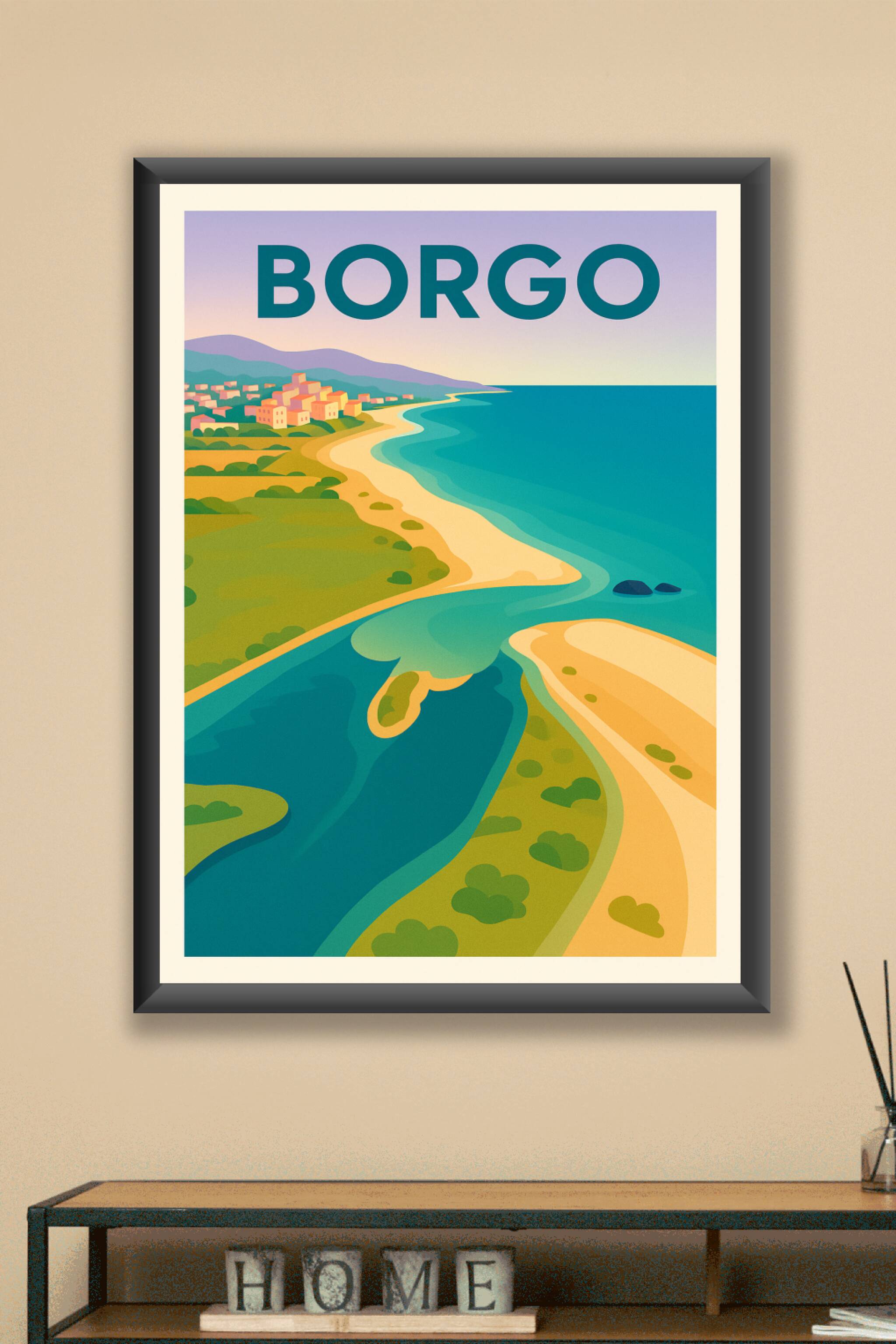 Découvrez la beauté naturelle de Borgo avec cette affiche illustrée, offrant une vue apaisante sur la plage dorée, la mer turquoise et les collines...
