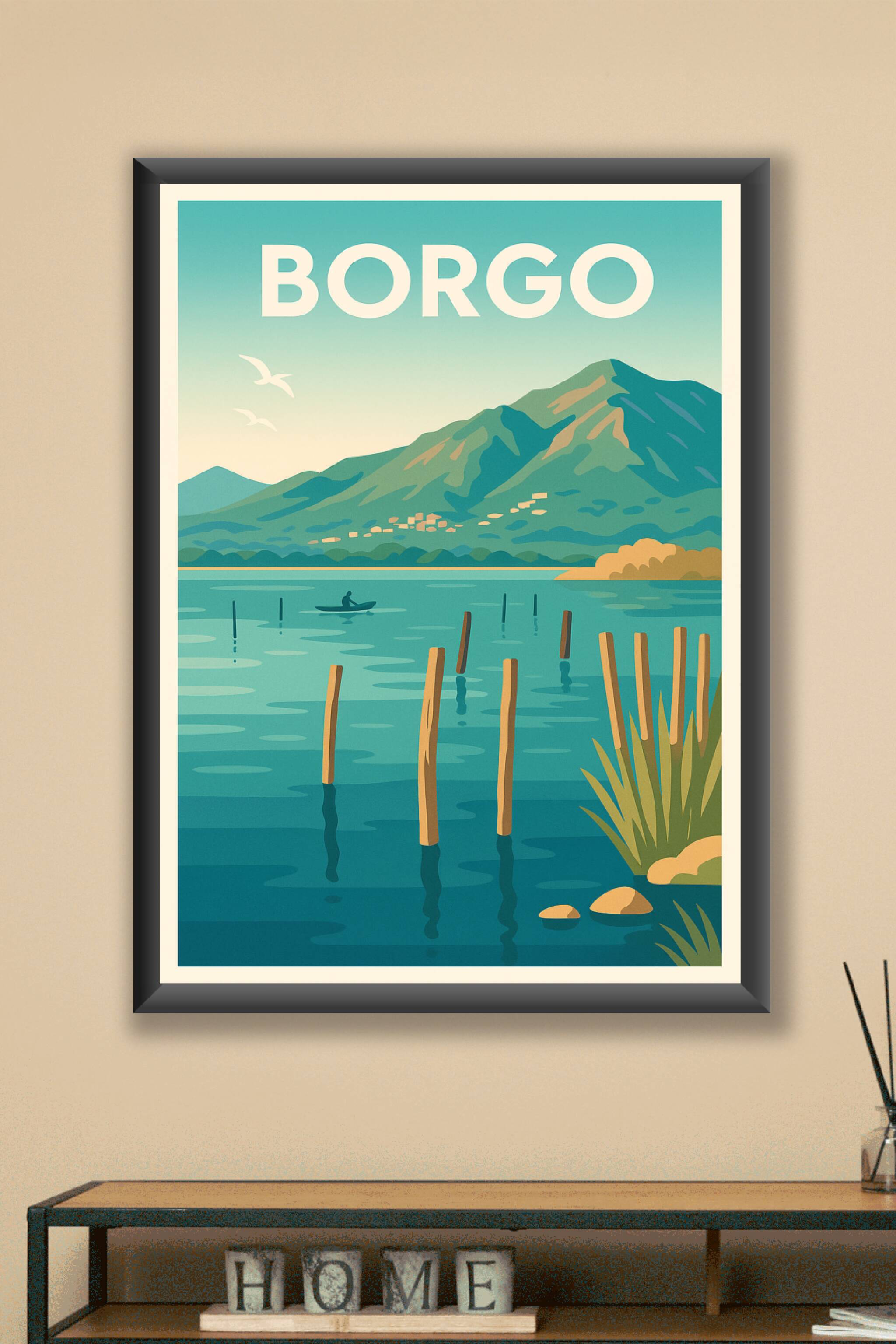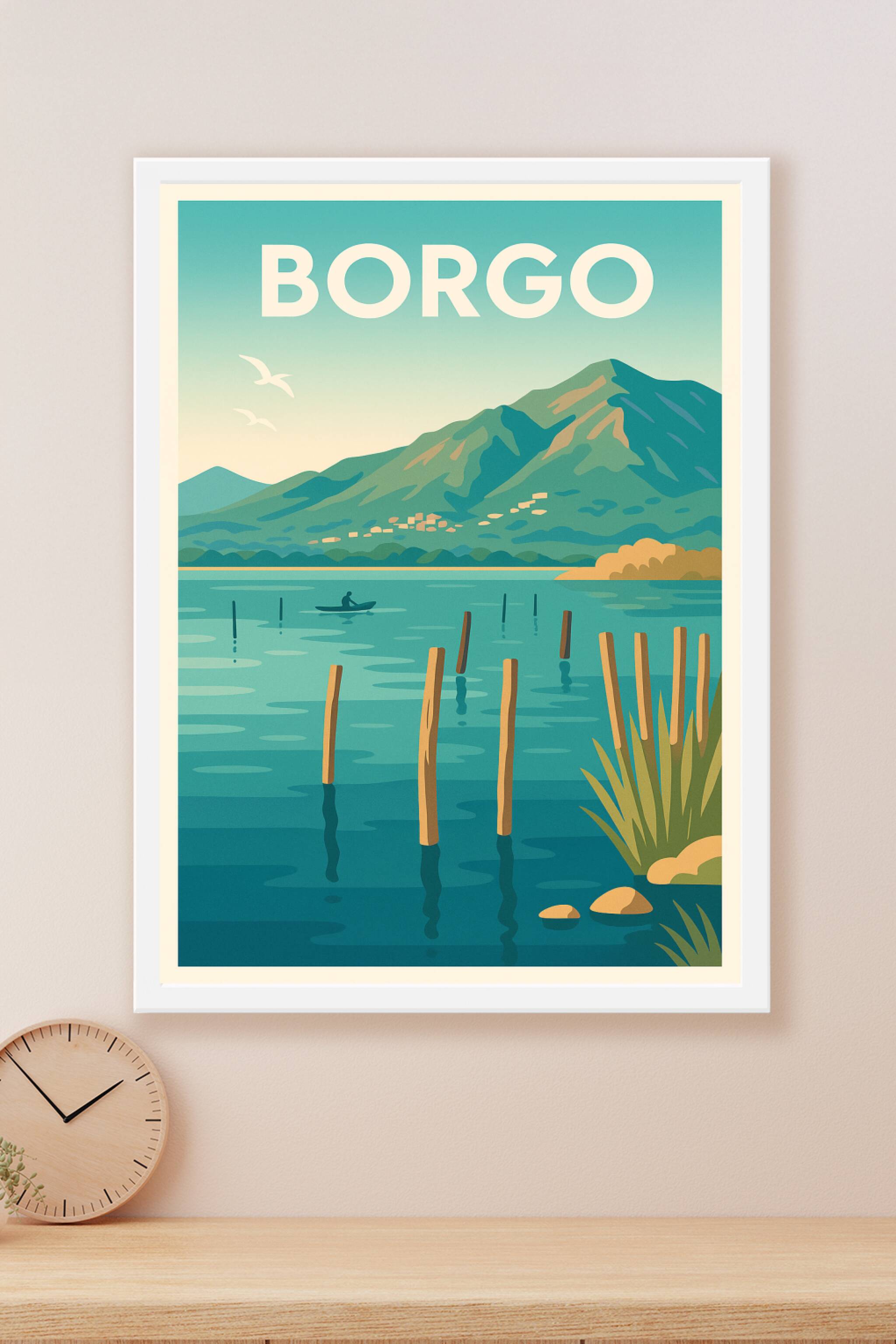 Découvrez la quiétude spectaculaire de Borgo avec cette affiche illustrée à l'ambiance douce et calme. Le paysage harmonieux mêle montagnes majestu...