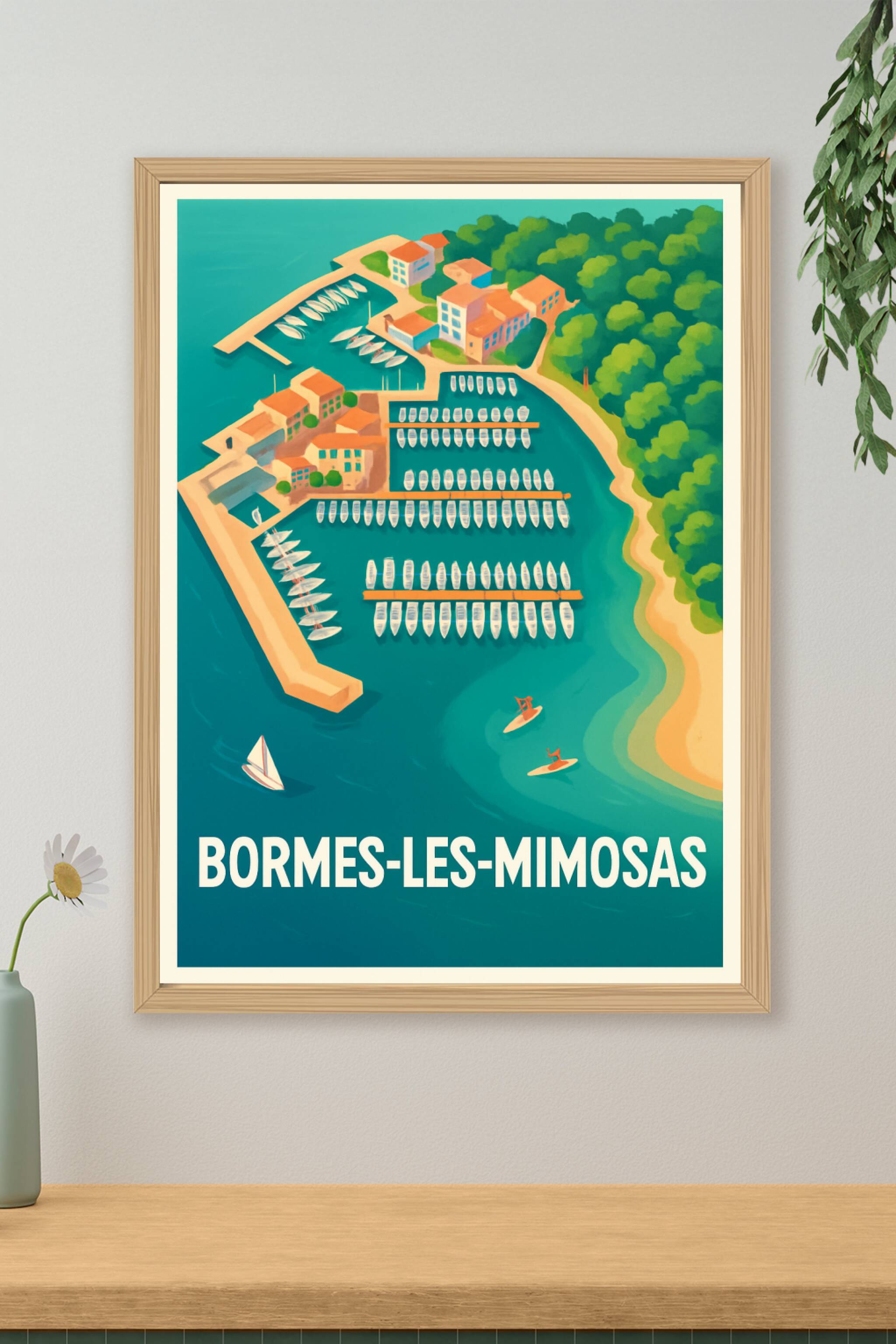 Découvrez le charme côtier de Bormes-les-Mimosas à travers cette affiche artistique illustrant son port pittoresque et ses eaux turquoise. Ce poste...