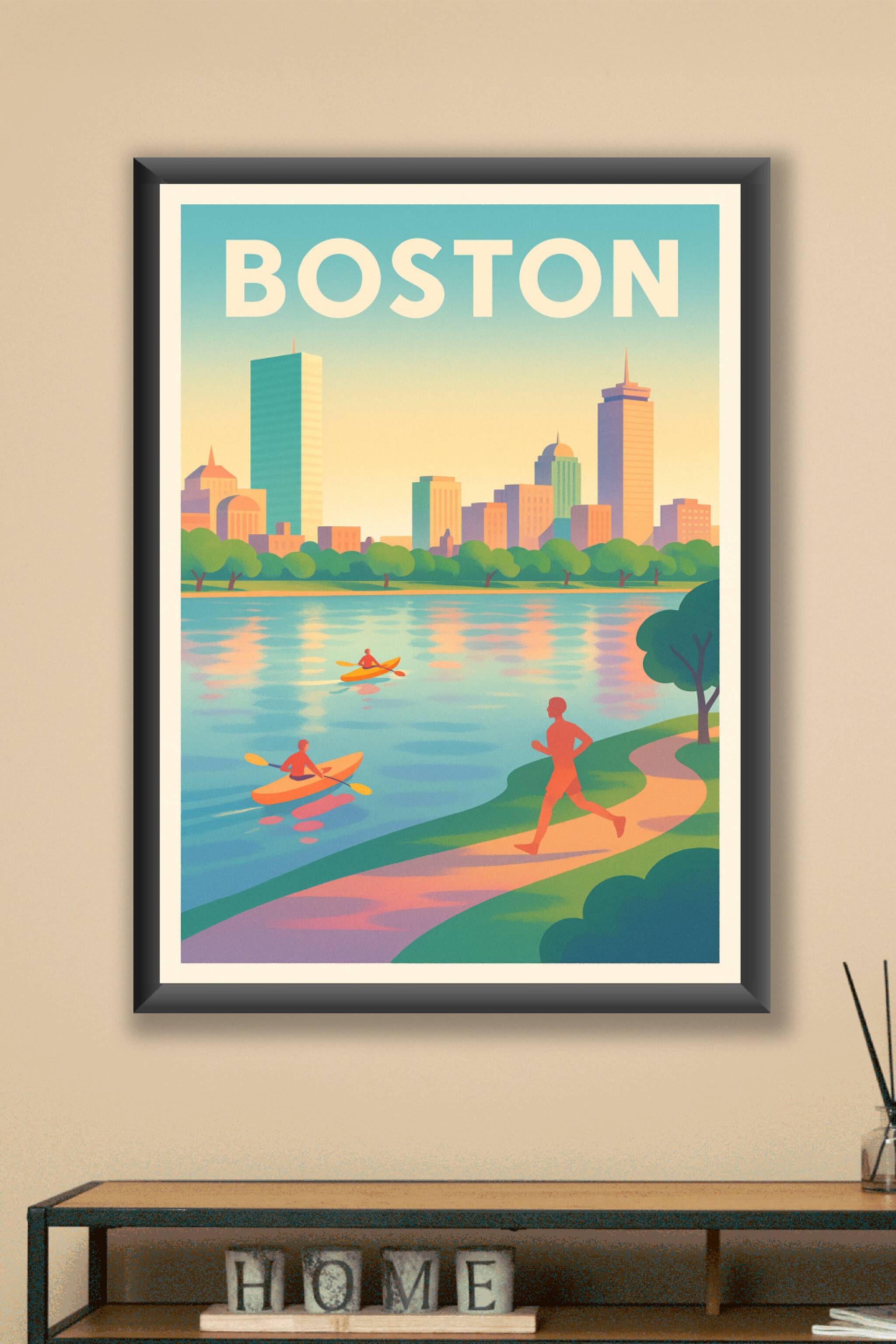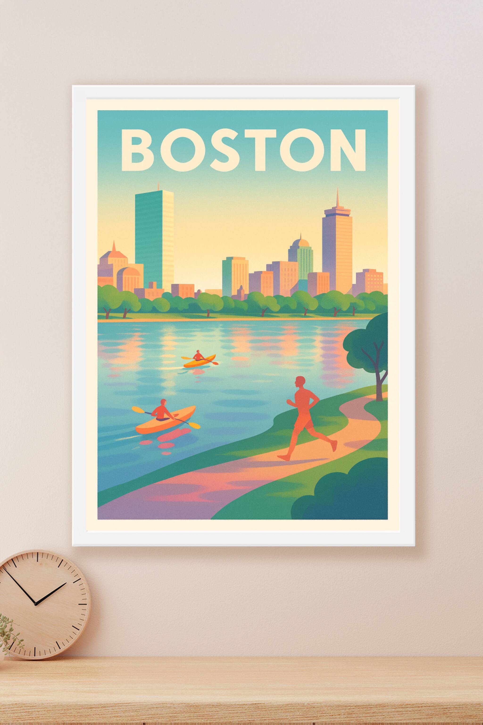 Découvrez le charme vibrant de Boston avec cette affiche au style rétro illustrant une scène paisible entre sportifs en kayak et joggeur en bordure...
