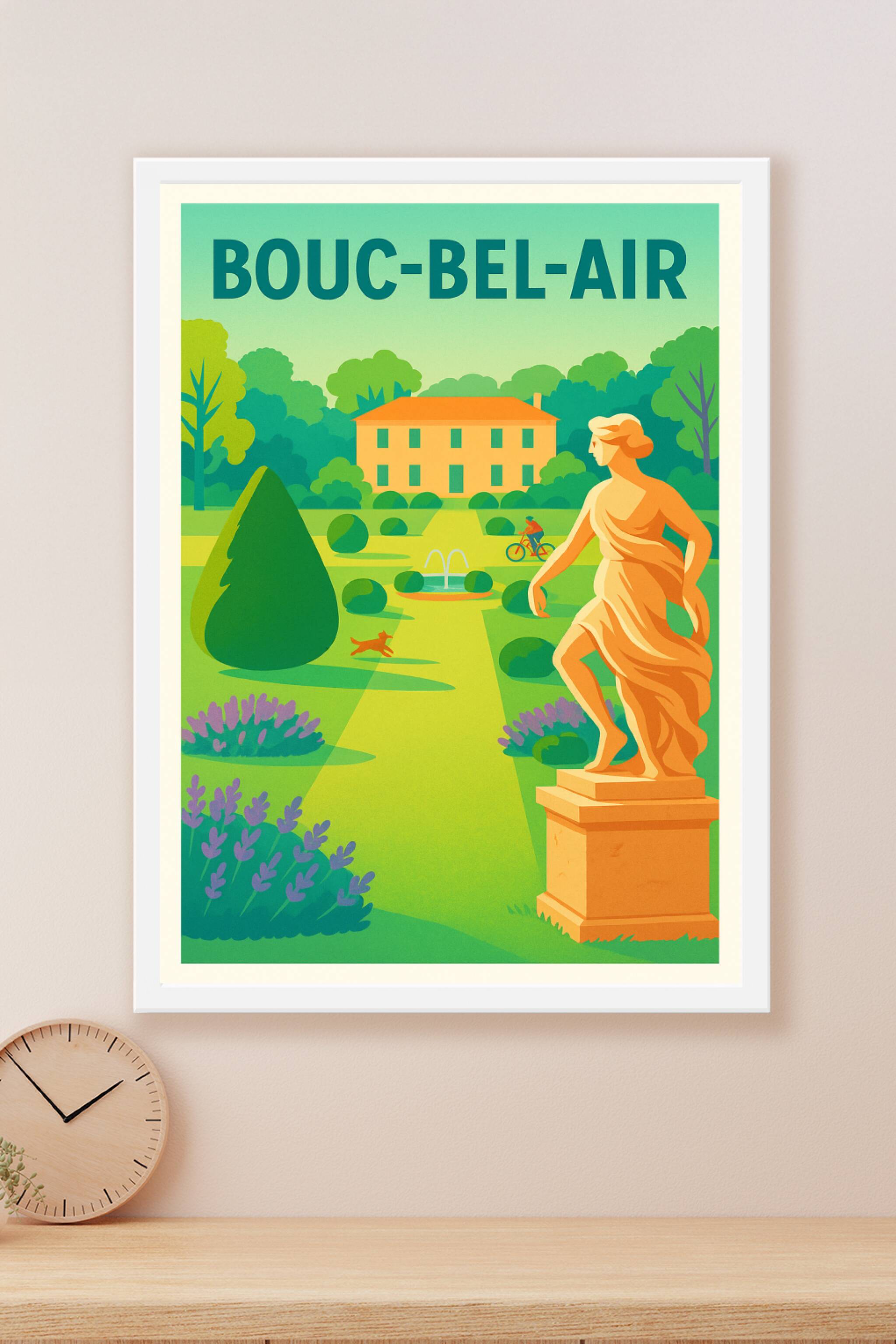 Découvrez la sérénité champêtre de Bouc-Bel-Air avec cette affiche au style rétro moderne, mettant en scène un jardin harmonieux et une statue clas...