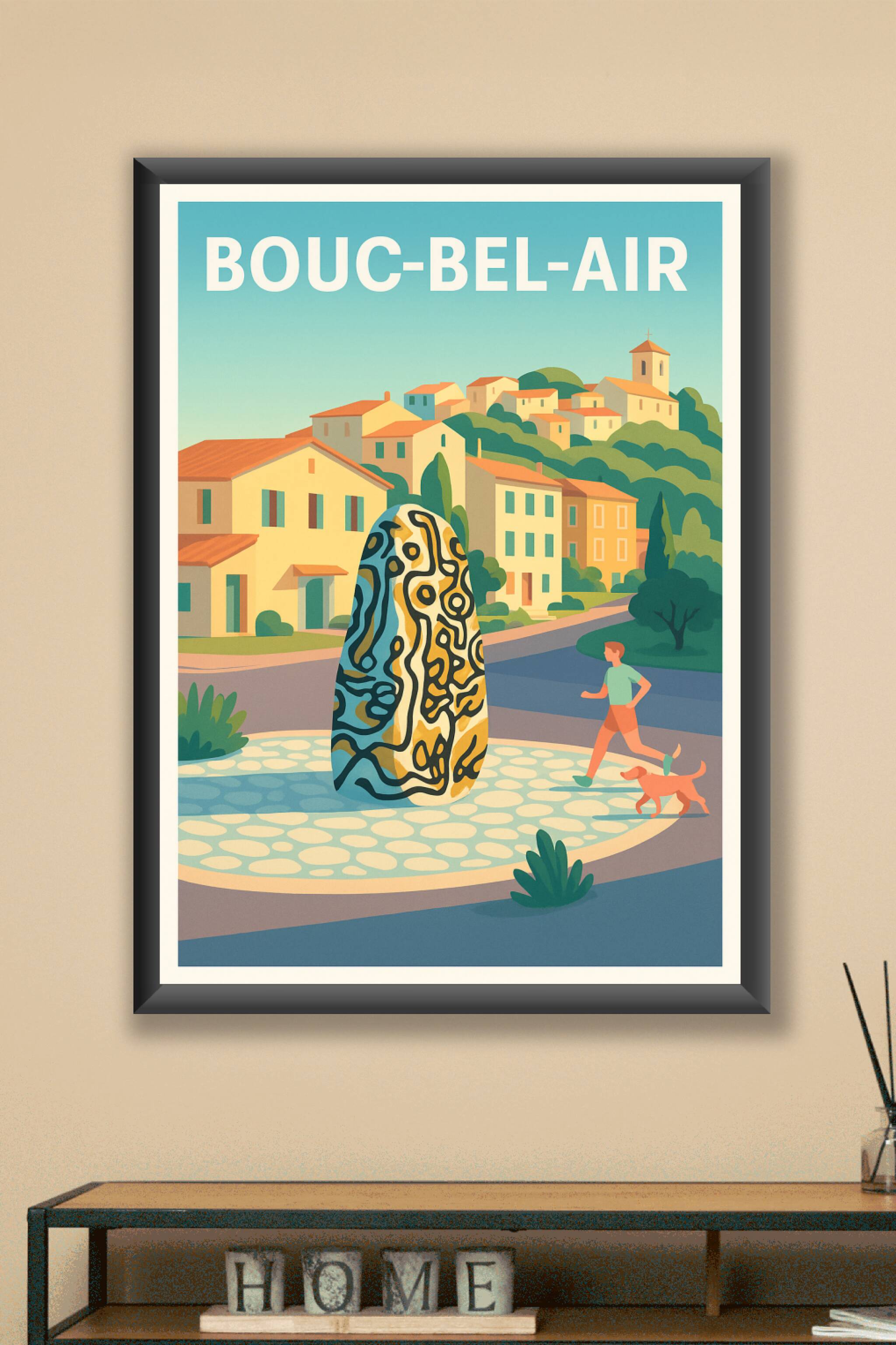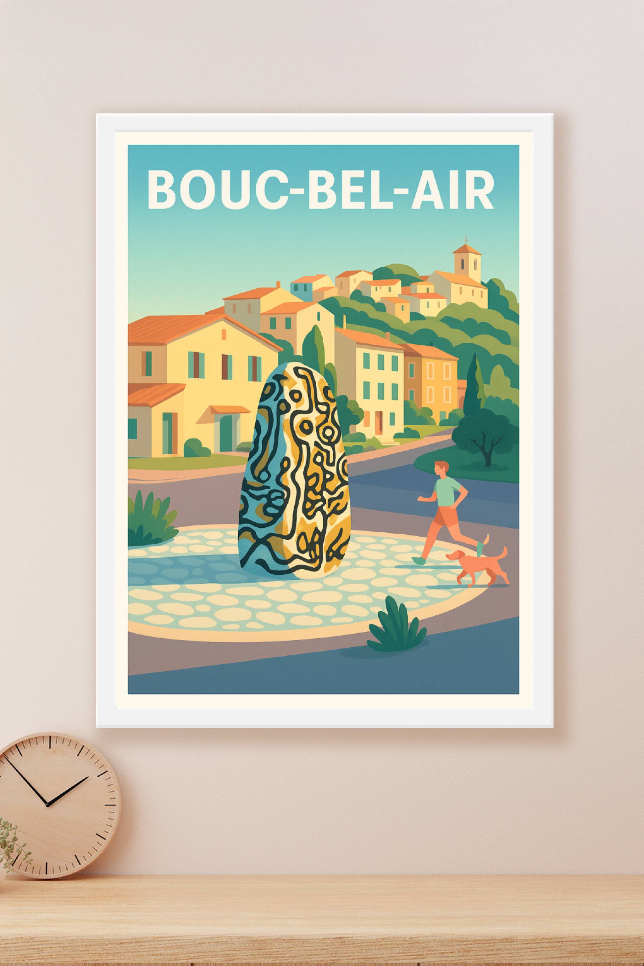 Découvrez la douceur de vivre de Bouc-Bel-Air à travers cette affiche illustrée mettant en scène un paysage typique et apaisant du village, avec se...