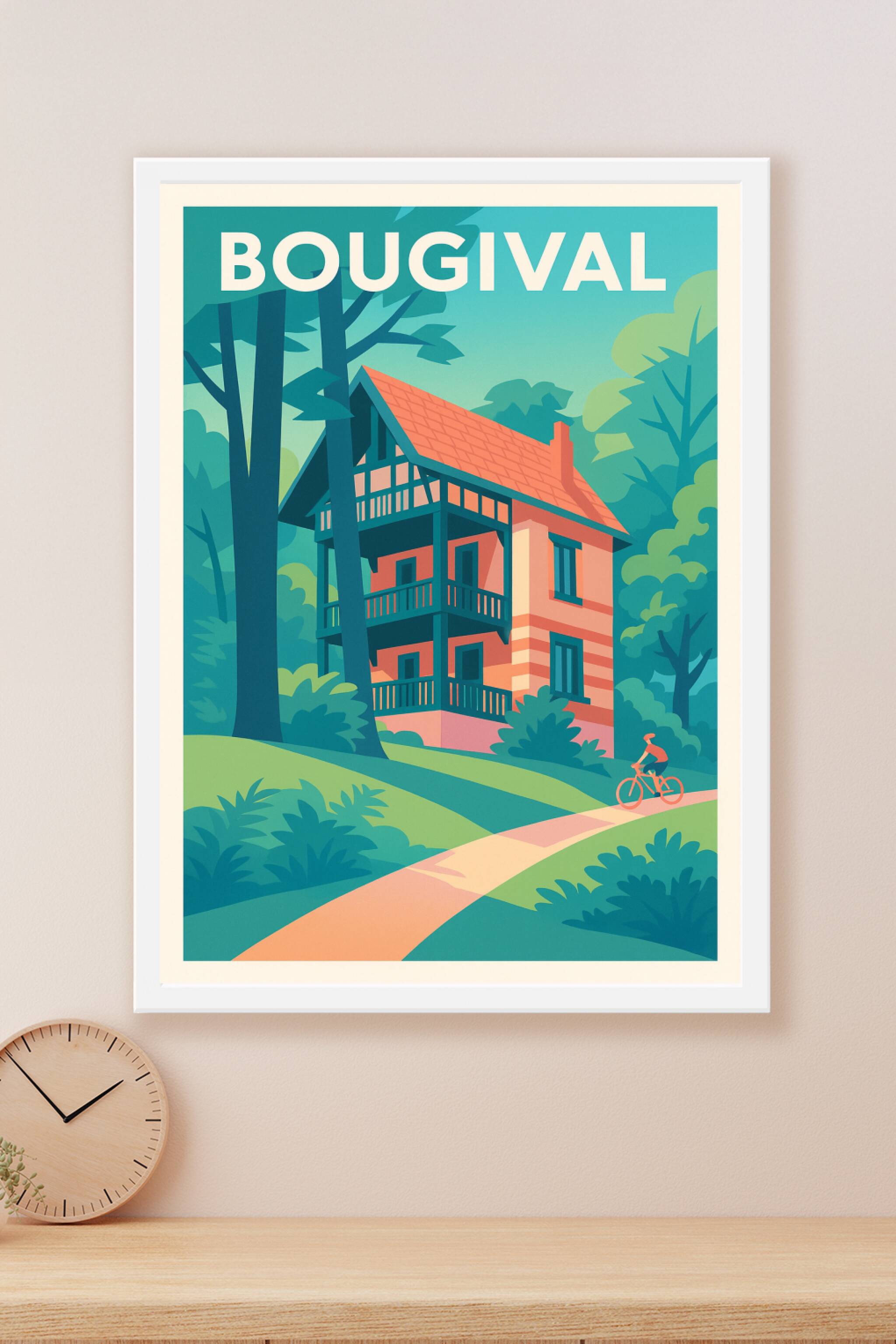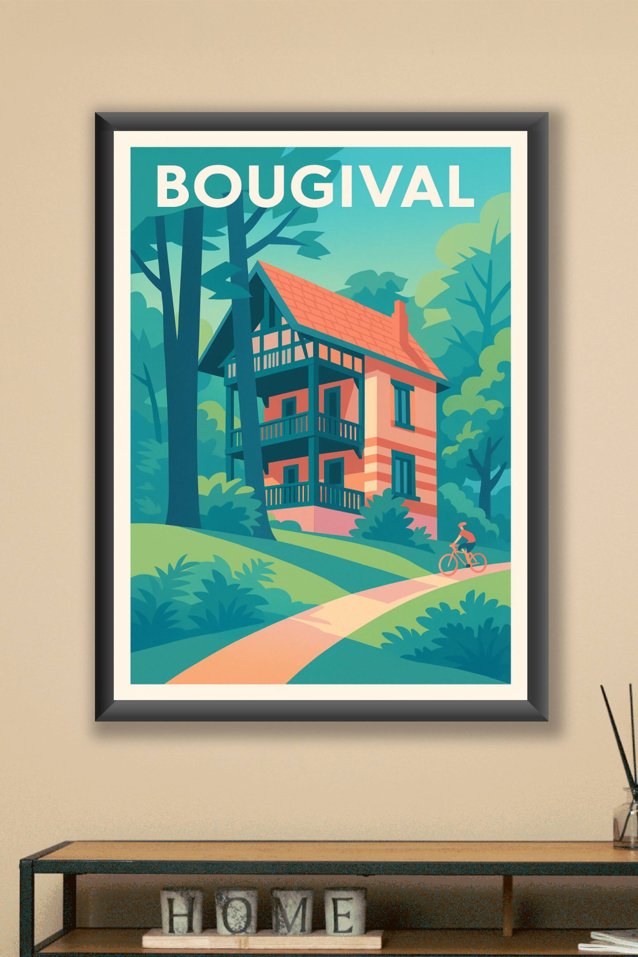 Découvrez le charme bucolique de Bougival avec cette affiche illustrée mettant en scène une maison typique nichée au cœur d'une nature luxuriante. ...