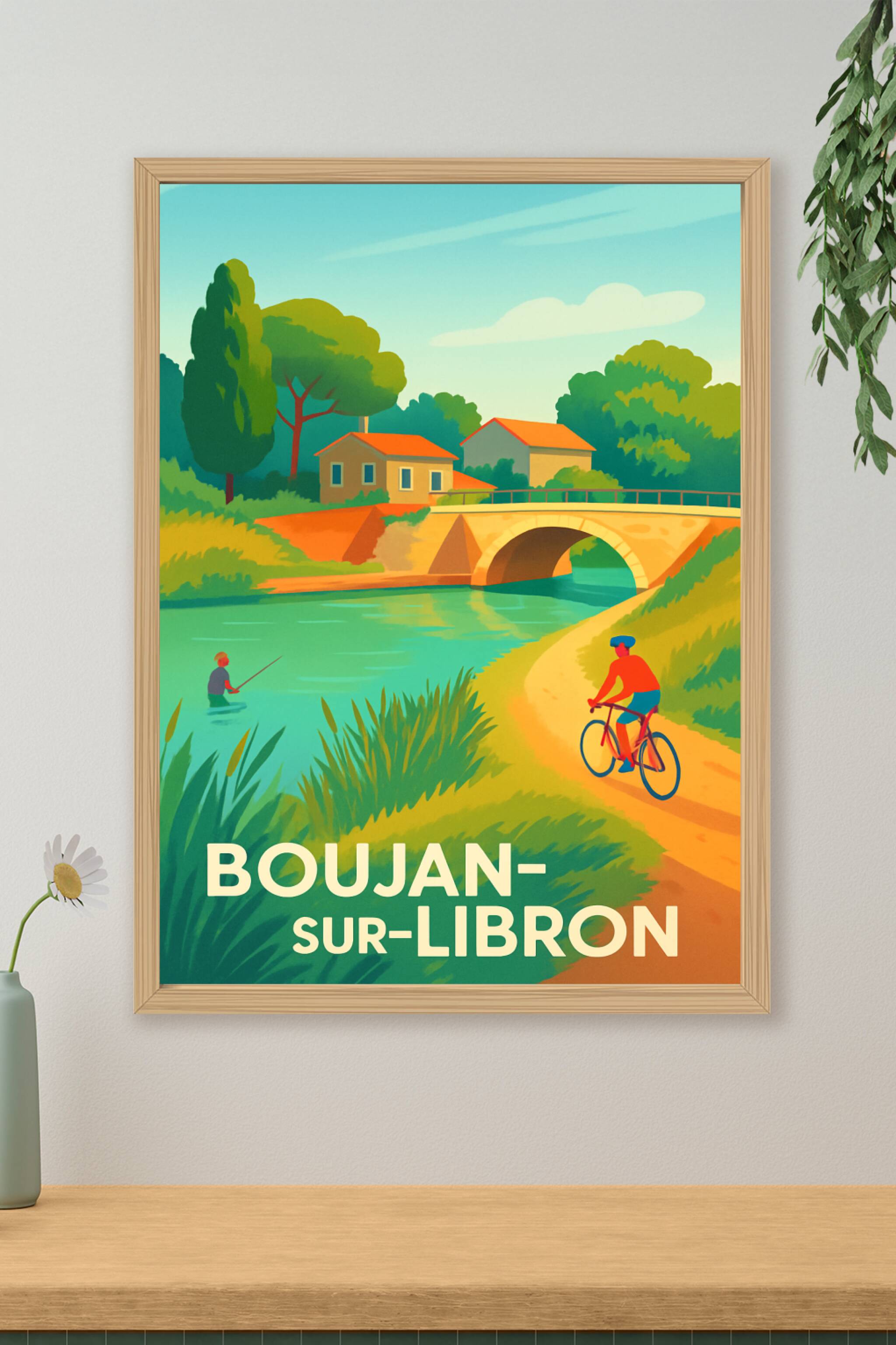 Découvrez la douceur de vivre en pleine nature avec cette affiche illustrée de Boujan-sur-Libron, où un paisible chemin longe une rivière traversée...