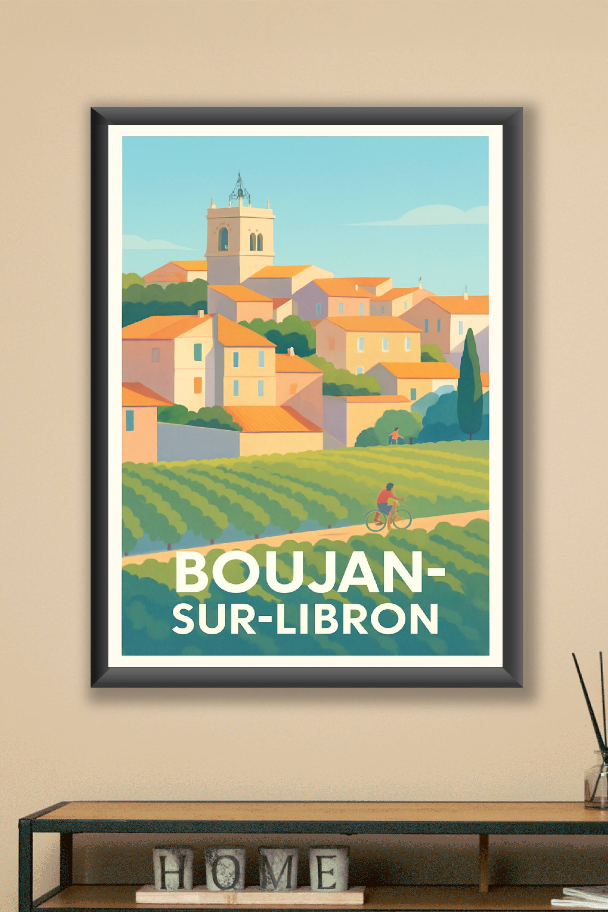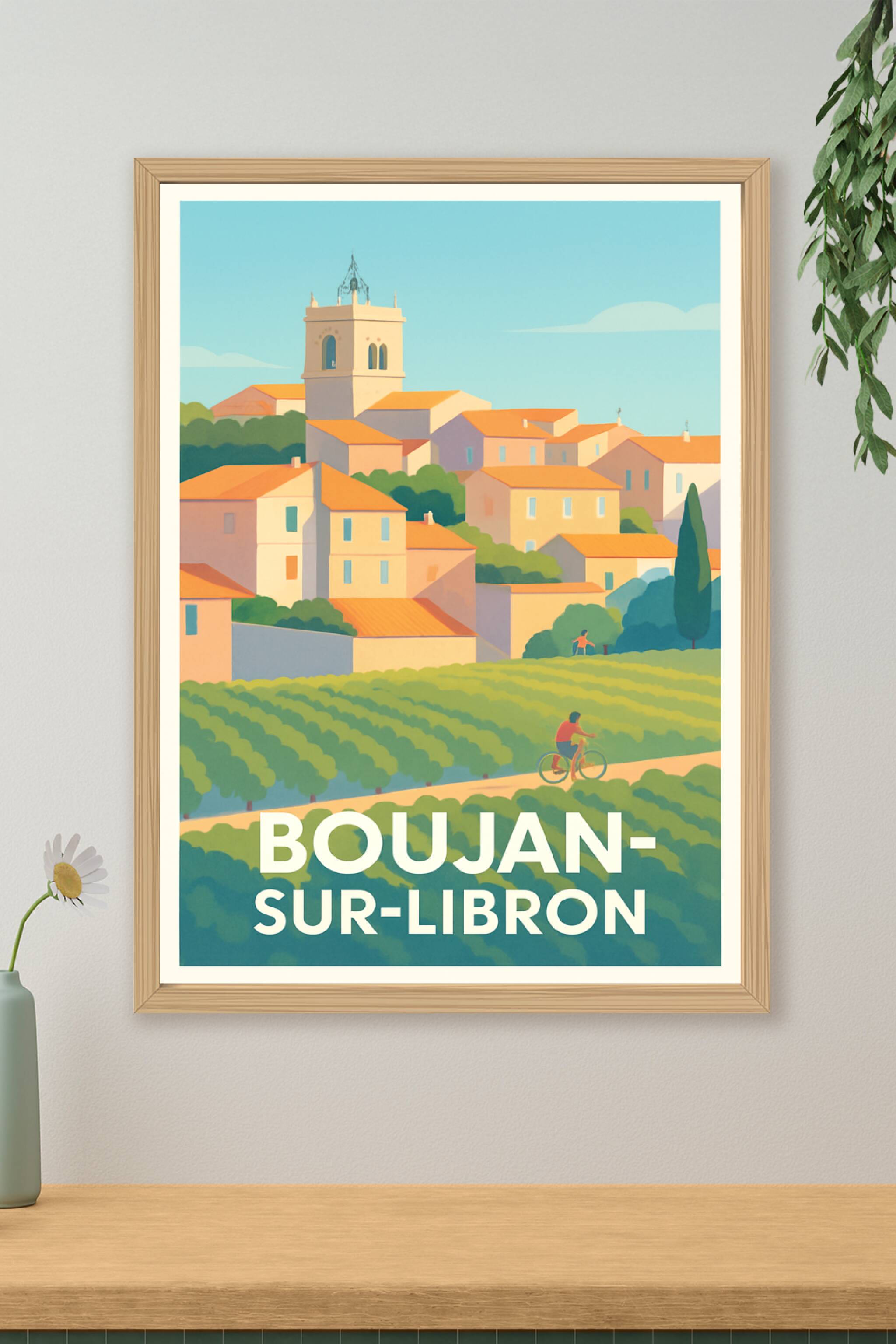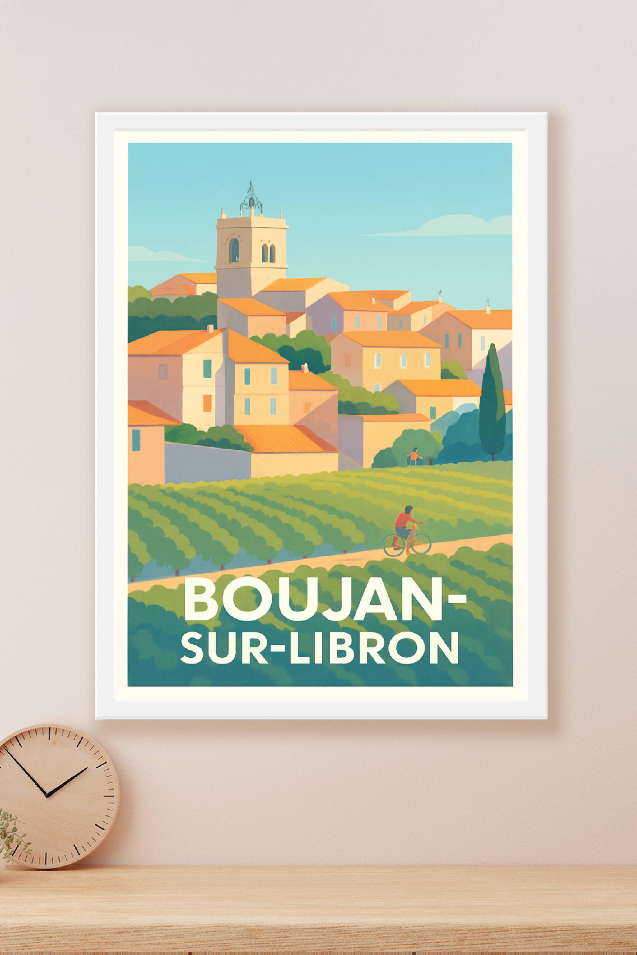 Découvrez la sérénité et le charme pittoresque de Boujan-sur-Libron avec cette affiche illustrée aux couleurs douces et estivales. L'œuvre met en v...