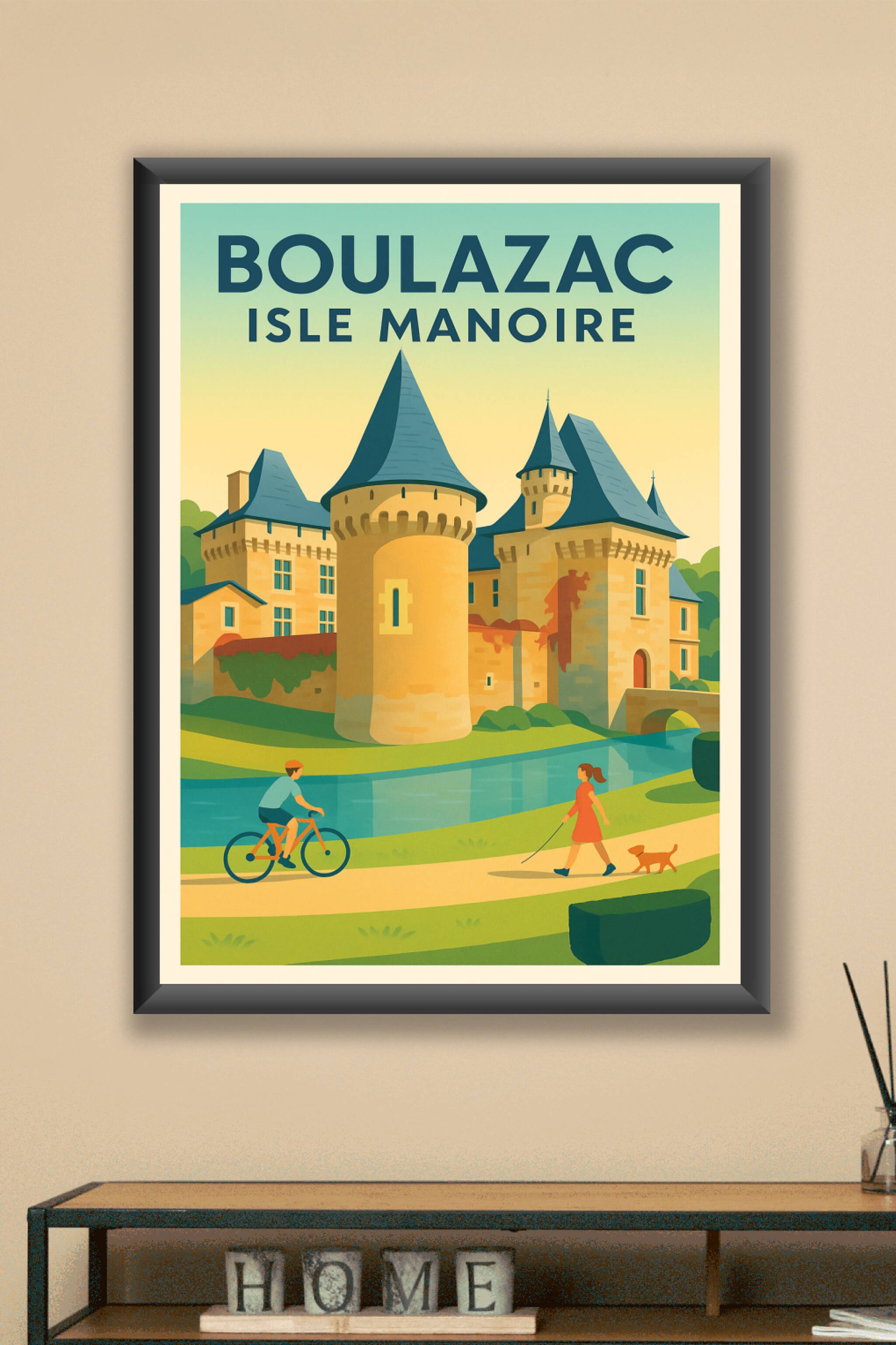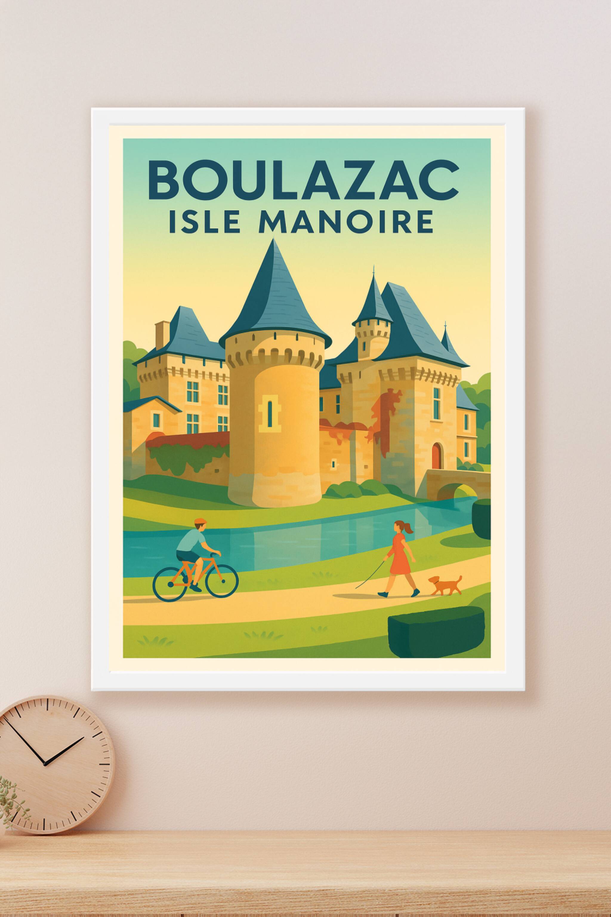Découvrez le charme exceptionnel de Boulazac avec cette affiche illustrée mettant en valeur le majestueux château de l'Isle Manoire, entouré de ses...