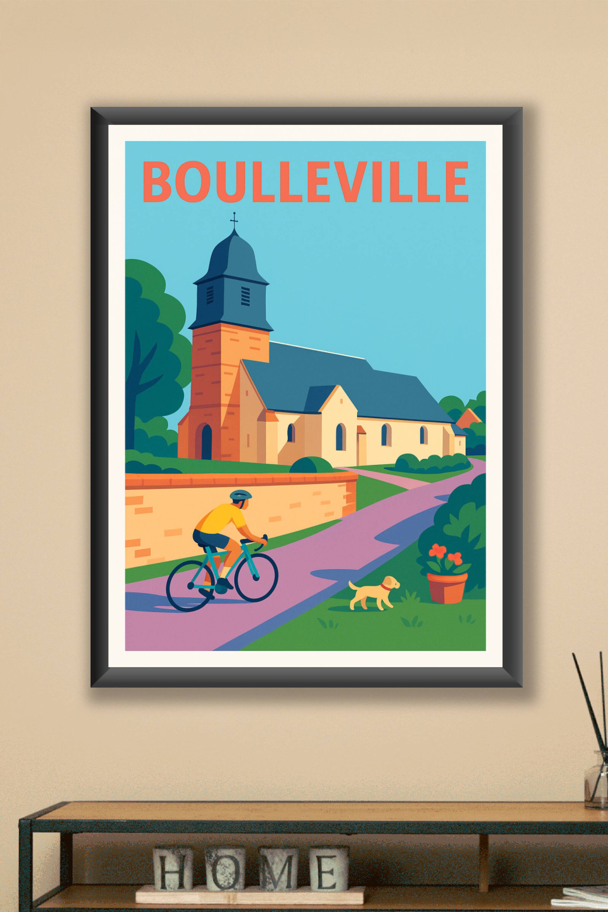 Découvrez le calme et la beauté authentique de Boulleville avec cette affiche illustrée dans un style coloré et moderne. L'église emblématique du v...