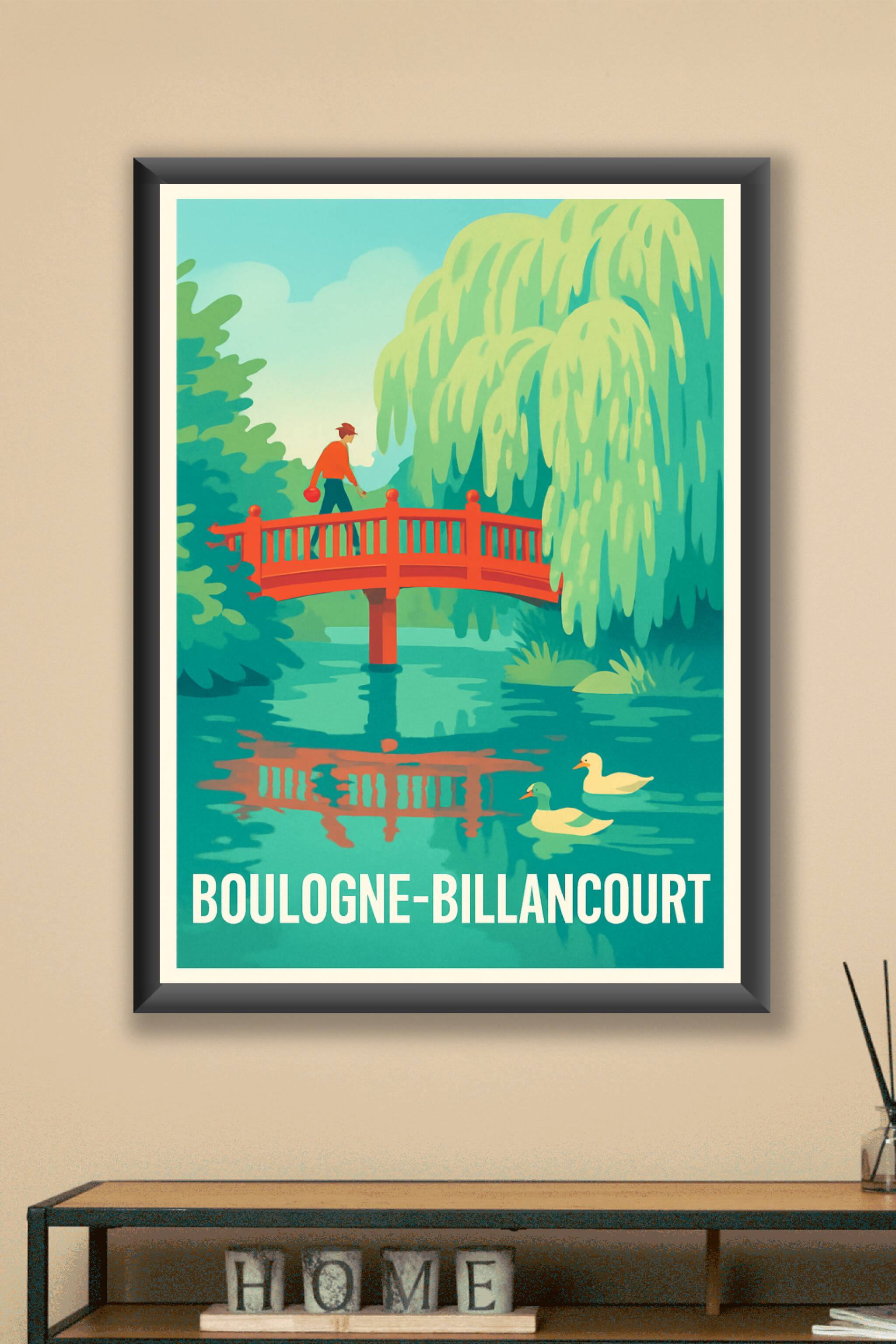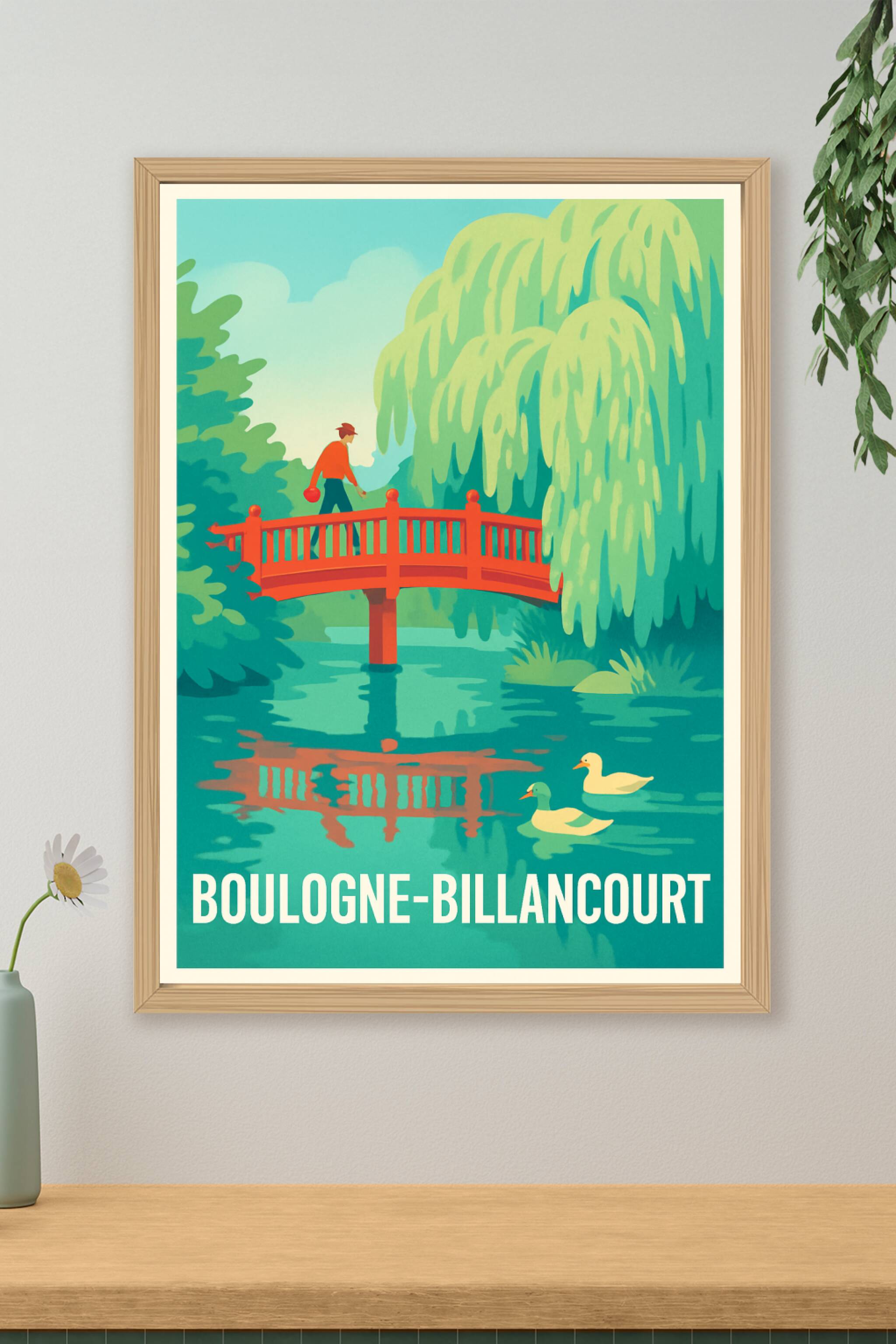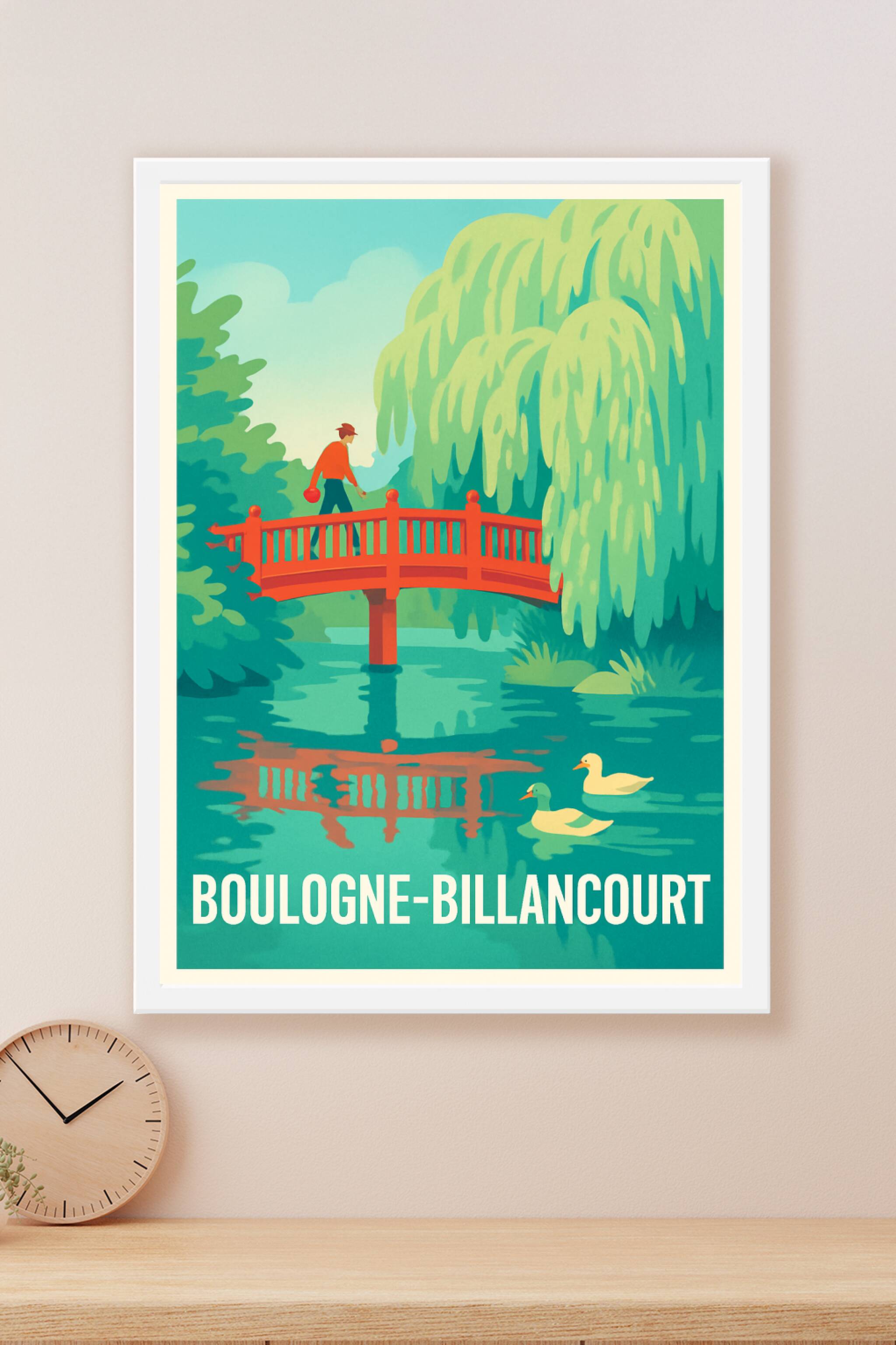 Découvrez l'élégance paisible et la nature luxuriante de Boulogne-Billancourt avec cette affiche au style vintage et coloré. Le pont rouge et les c...
