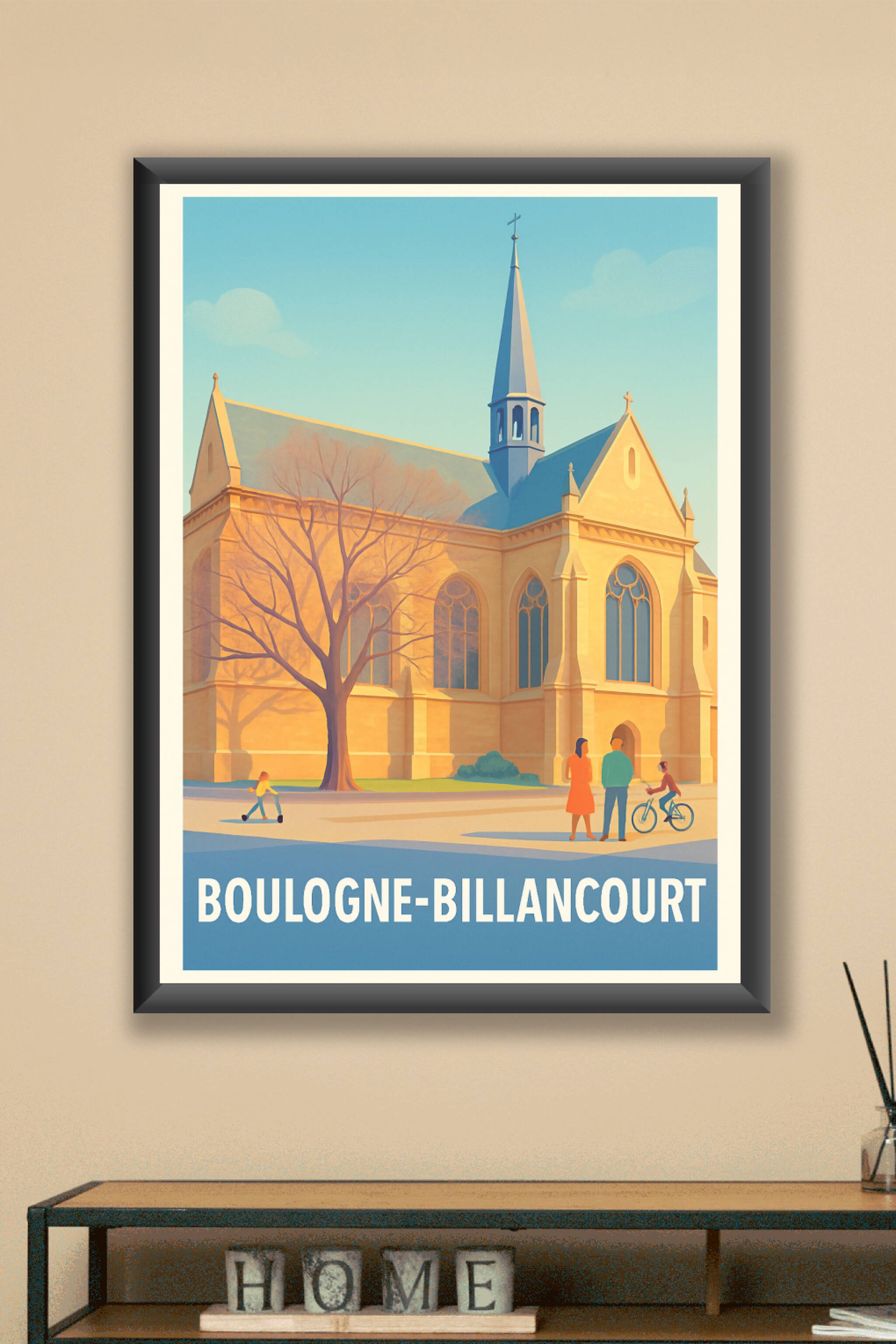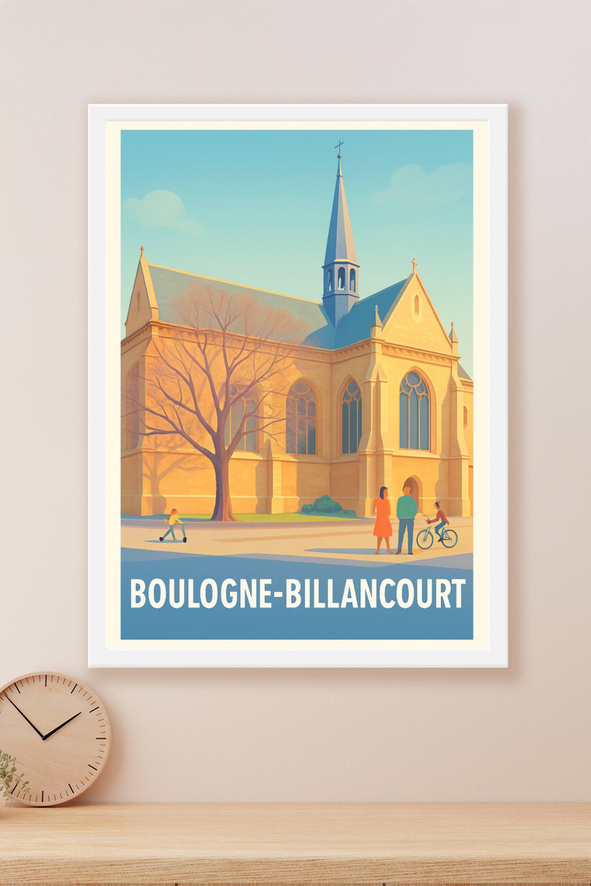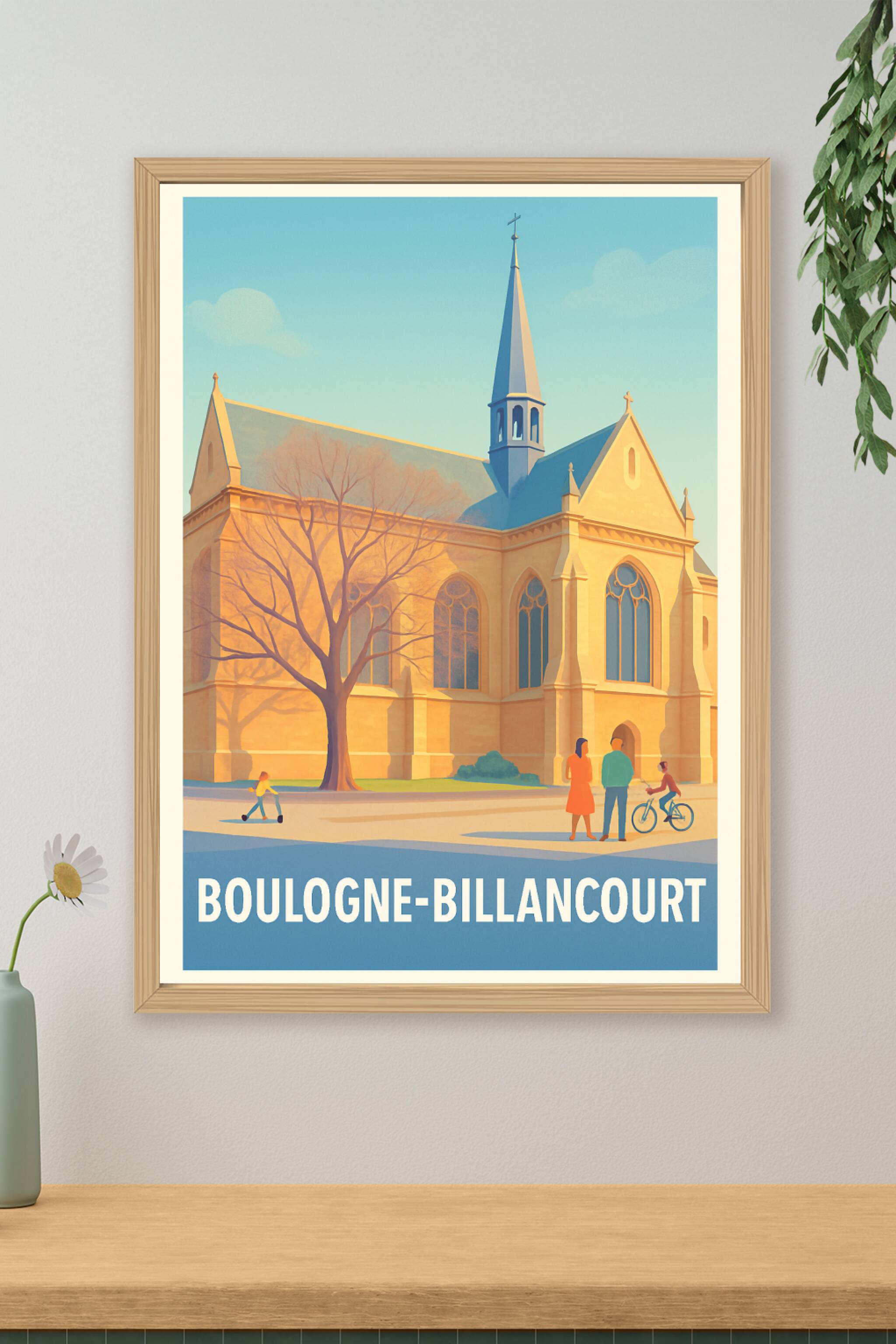 Cette affiche représente avec charme une scène lumineuse de Boulogne-Billancourt, mettant en valeur l’architecture élégante et l’atmosphère convivi...
