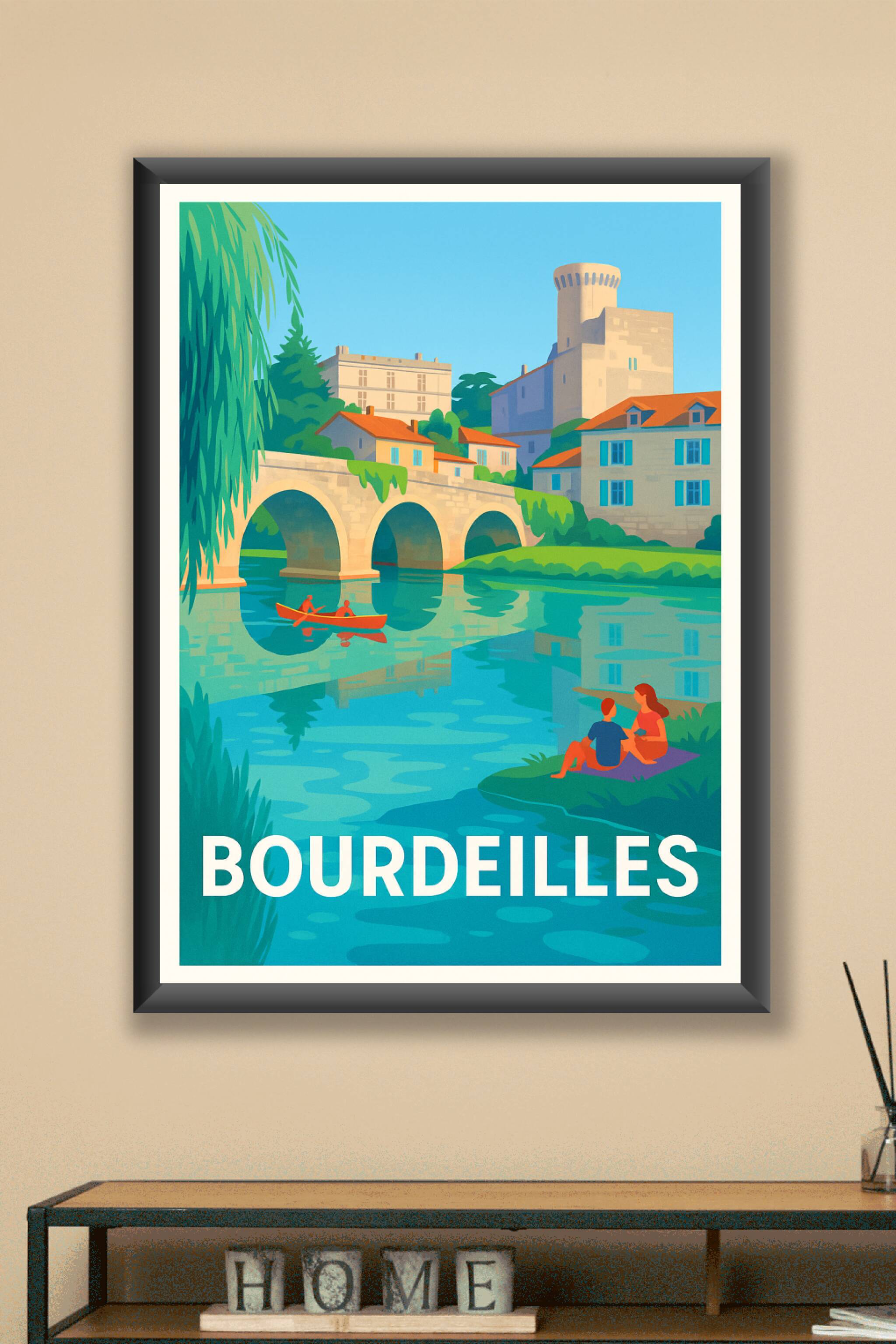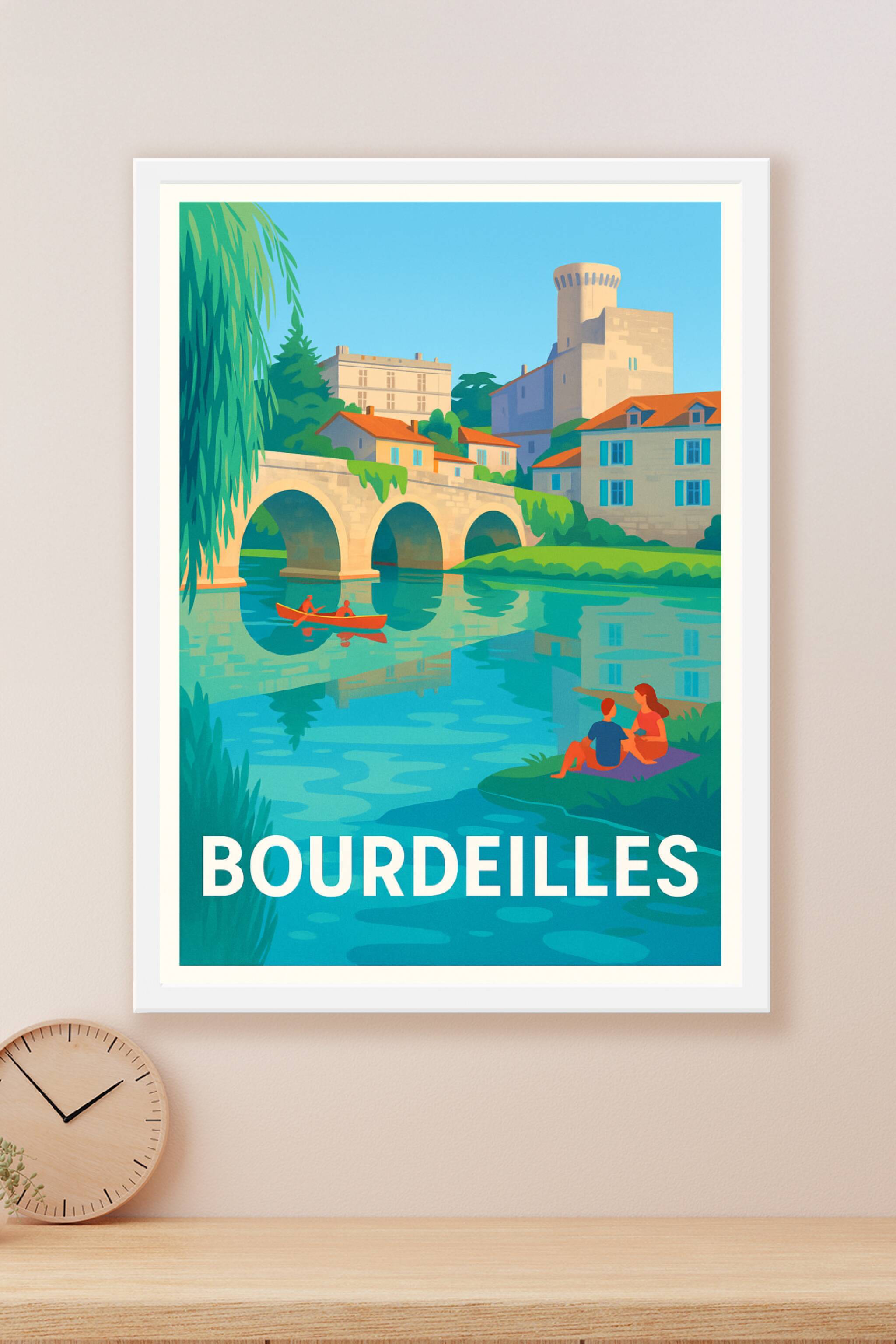 Découvrez l'élégance tranquille de Bourdeilles avec cette affiche illustrée mettant en scène son célèbre pont en pierre et le château historique qui surplombe la rivière. Le poster capture une ambiance bucolique où la nature et l'architecture s'harmonisent, avec deux personnages profitant de la douceur d'une paisible après-midi au bord de l'eau et une embarcation rouge éclatante qui glisse sous l'arche du pont.Cette affiche est imprimée en tirage "Fine Art" sur papier 305g coton, garantissant une qualité d'impression exceptionnelle et une durabilité optimale. Proposée en formats du plus grand A1 au plus compact A4, elle est disponible avec ou sans cadre pour s'adapter parfaitement à votre décoration intérieure.Offrez-vous ou à vos proches ce poster élégant qui invite à la sérénité et met à l'honneur le patrimoine culturel et naturel de Bourdeilles, avec une production 100% française haut de gamme.