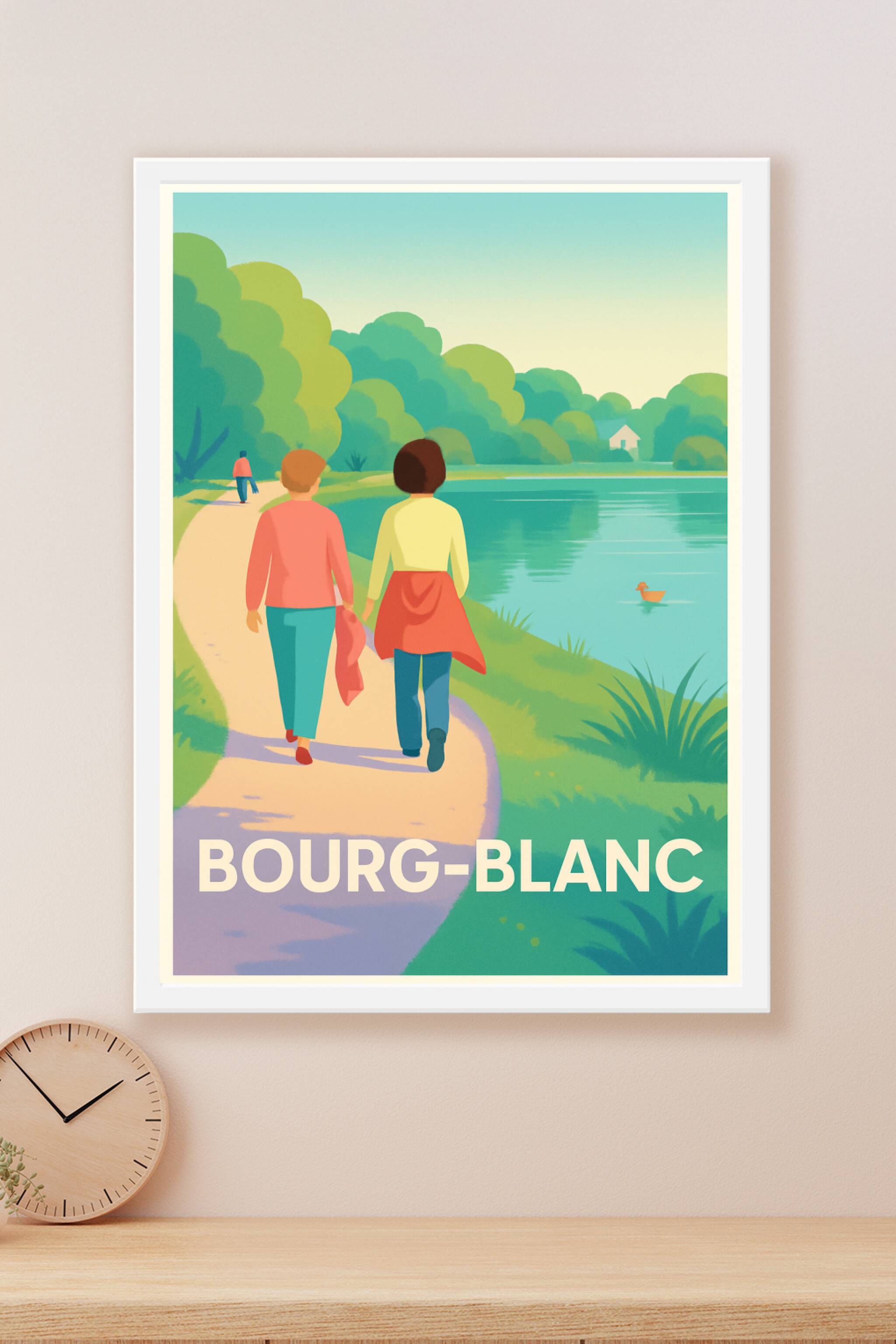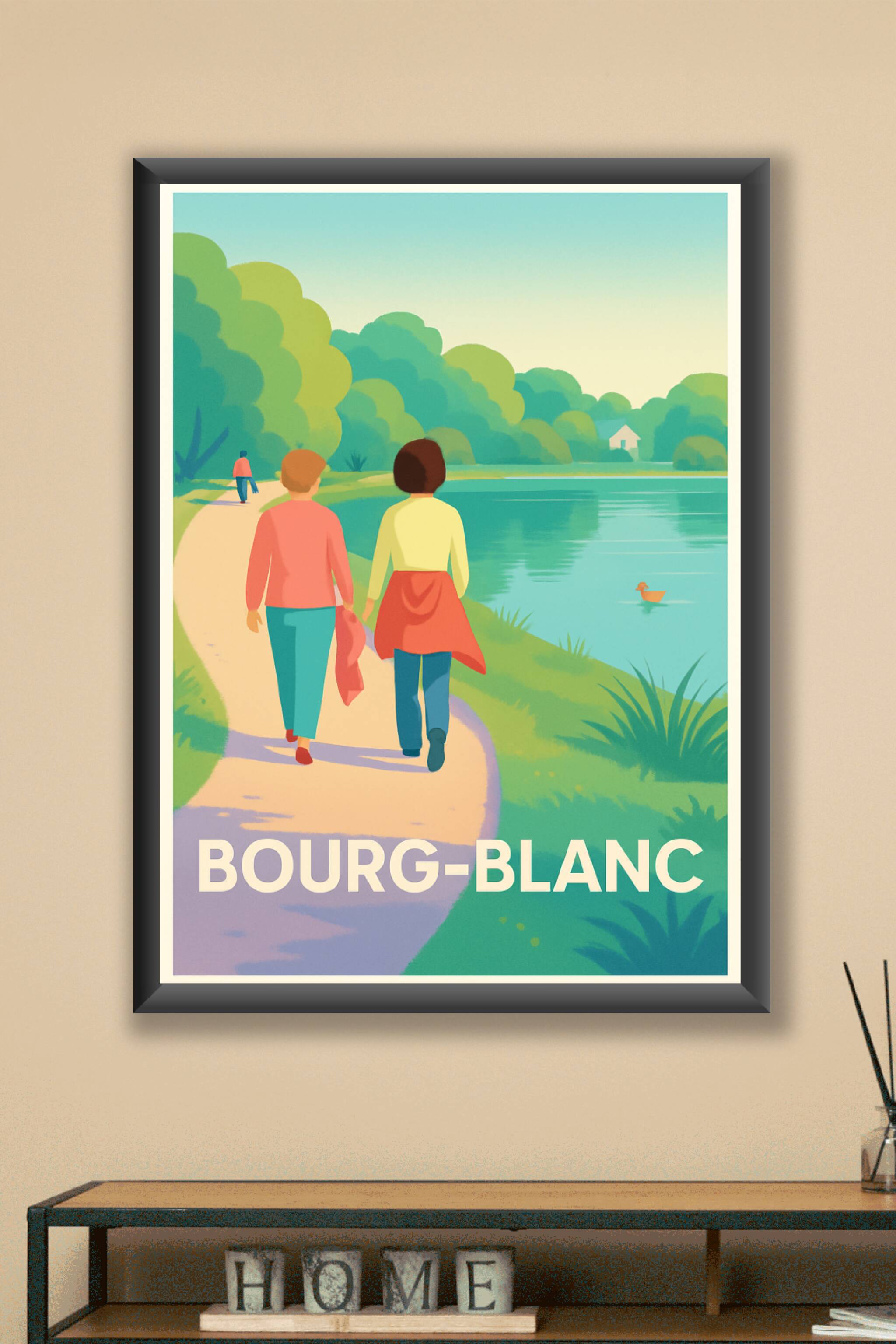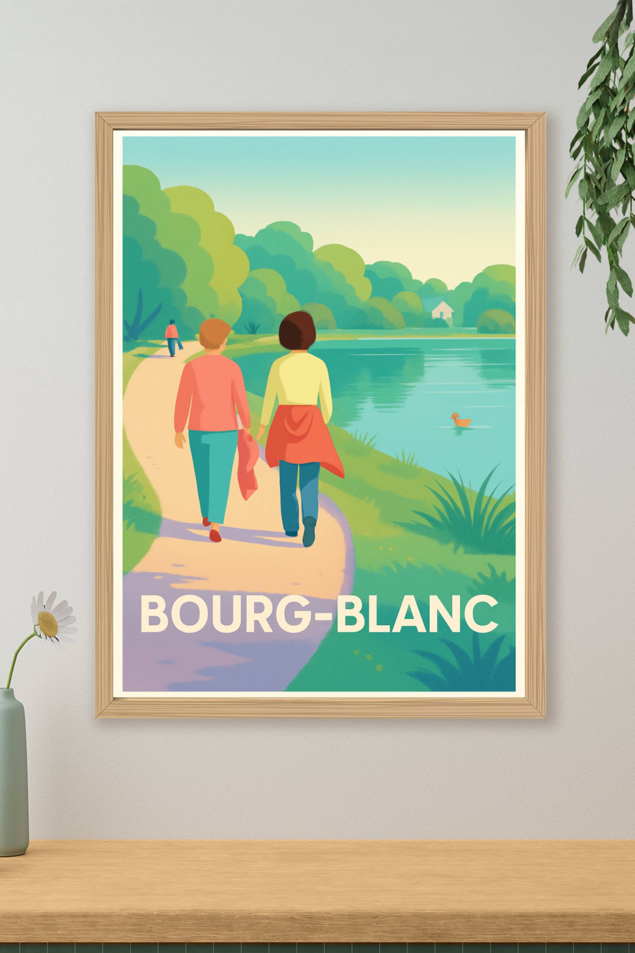 Découvrez la quiétude et la douceur de vivre de Bourg-Blanc à travers cette affiche artistique représentant une promenade au bord d'un lac paisible...