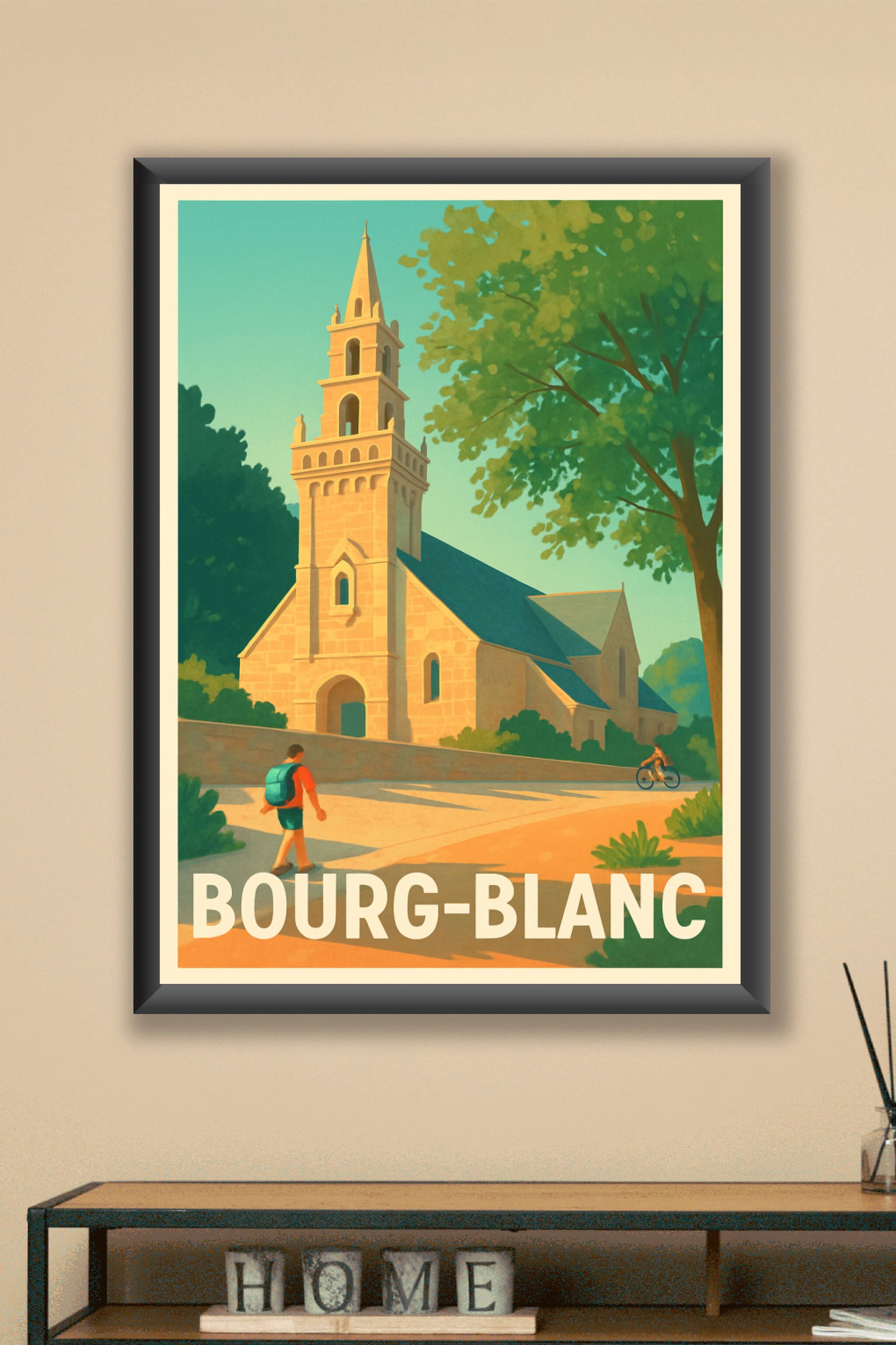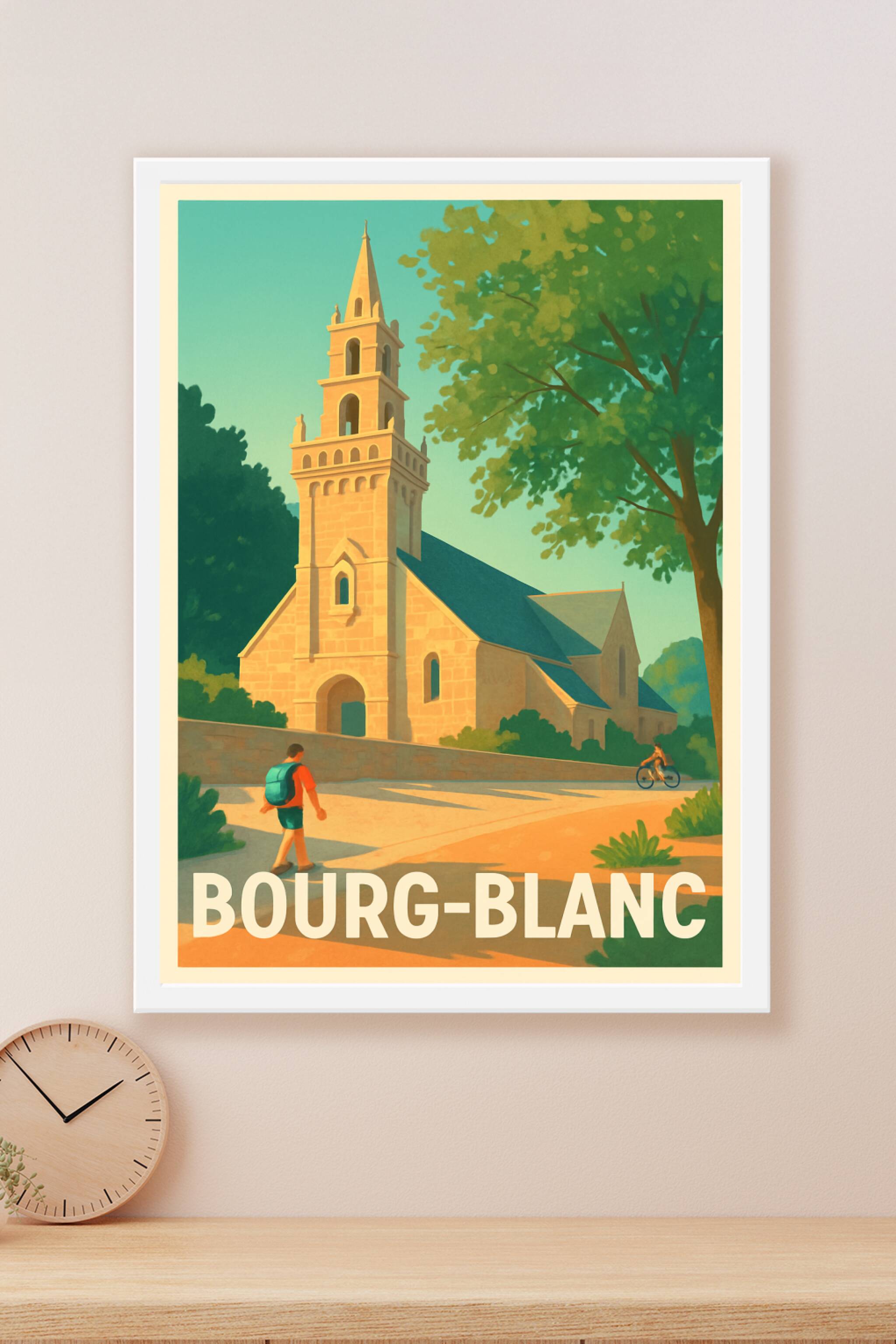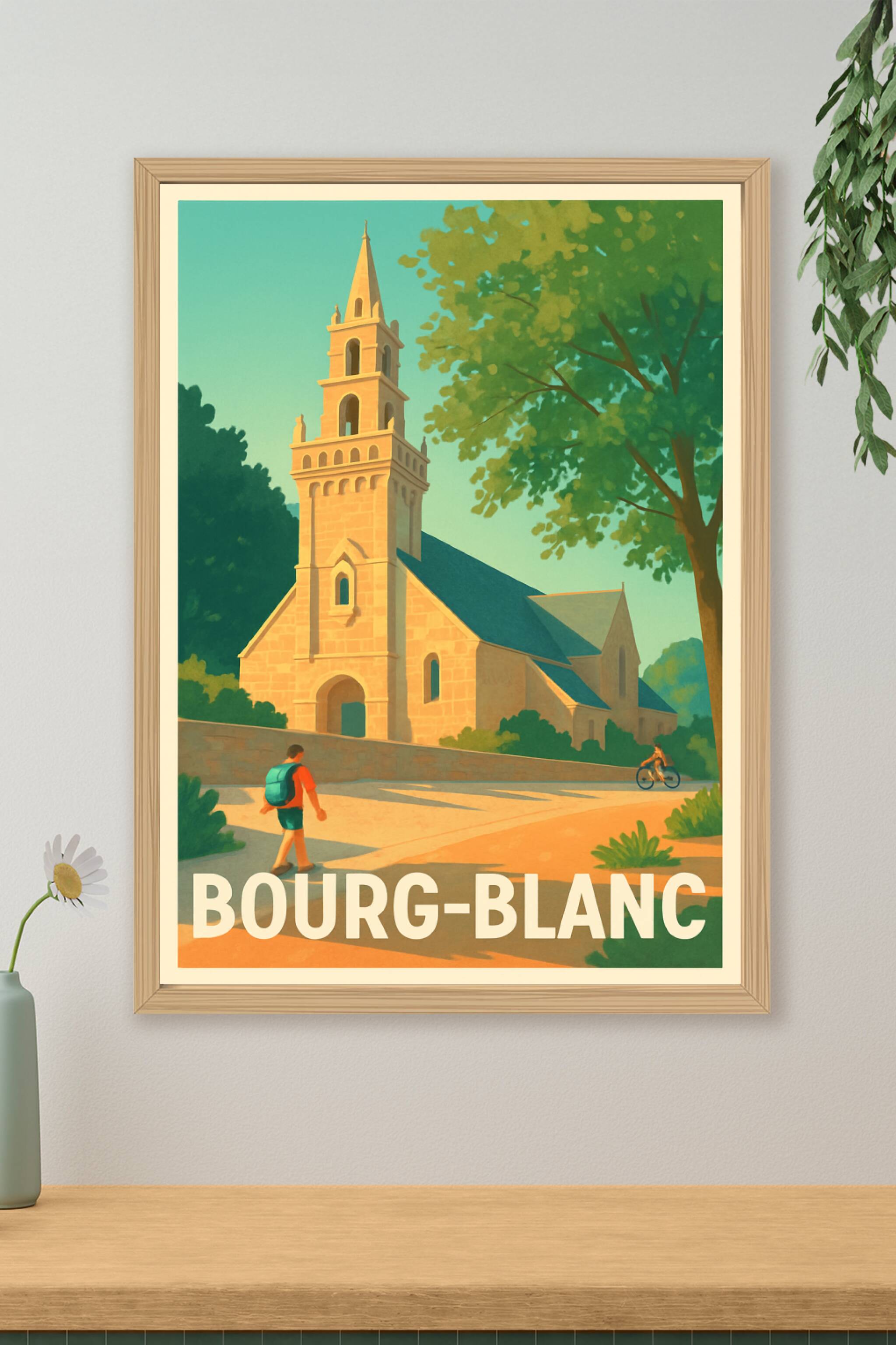 Découvrez le charme authentique de Bourg-Blanc avec cette superbe affiche illustrée qui met en lumière son architecture traditionnelle et ses paysa...
