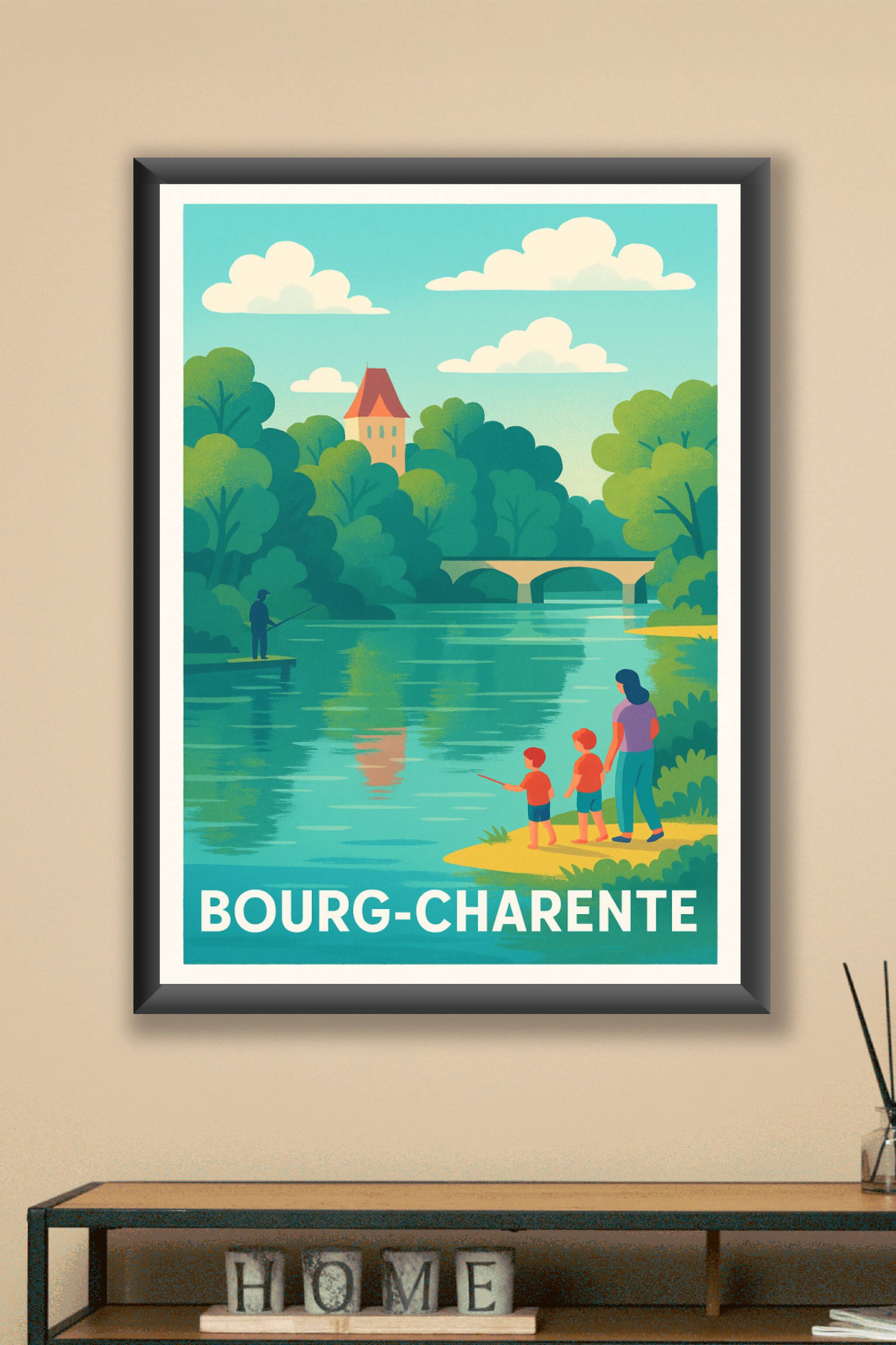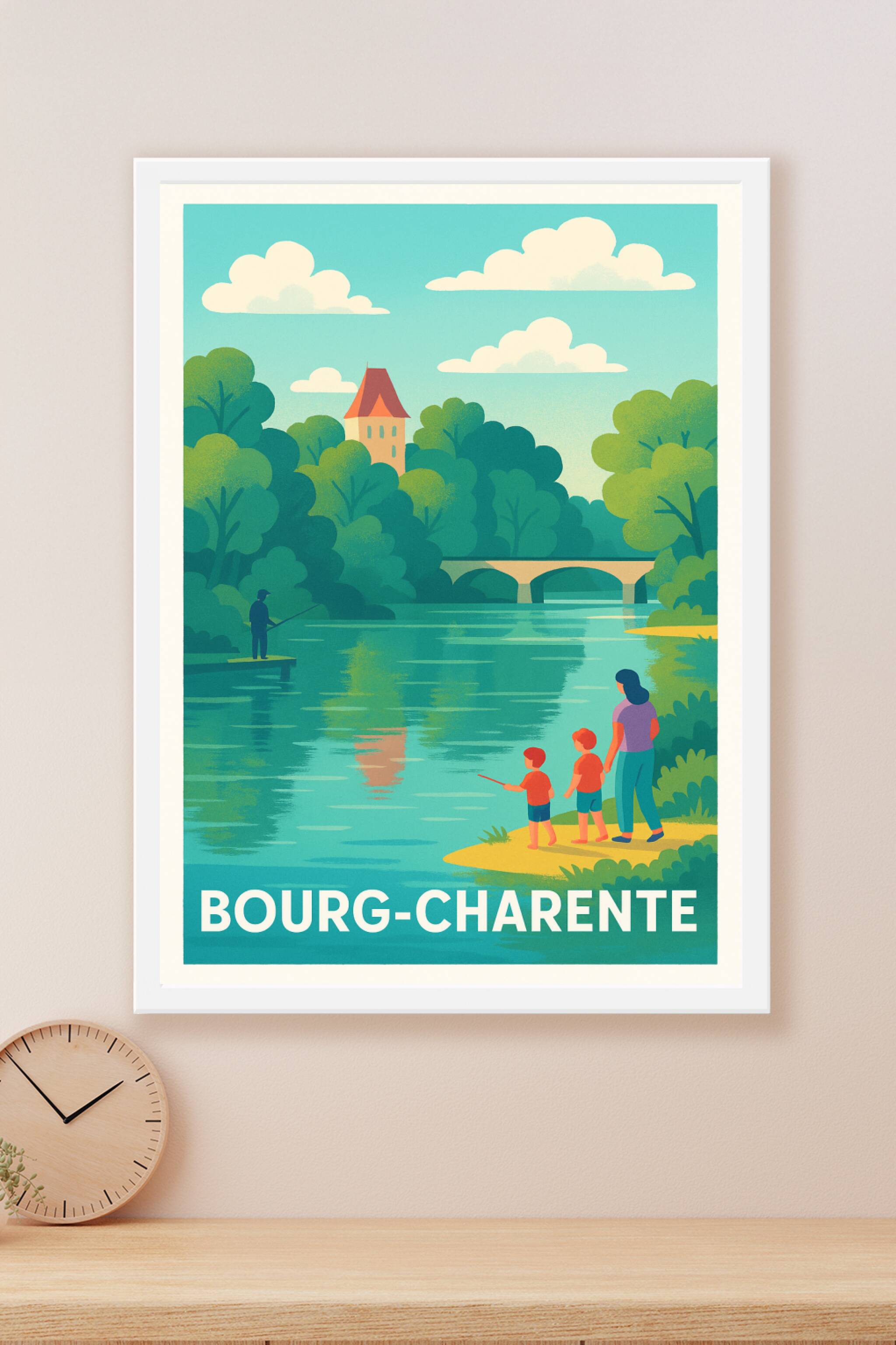 Découvrez l'ambiance paisible et naturelle de Bourg-Charente avec cette affiche illustrée mettant en scène une douce balade au bord de la rivière, ...