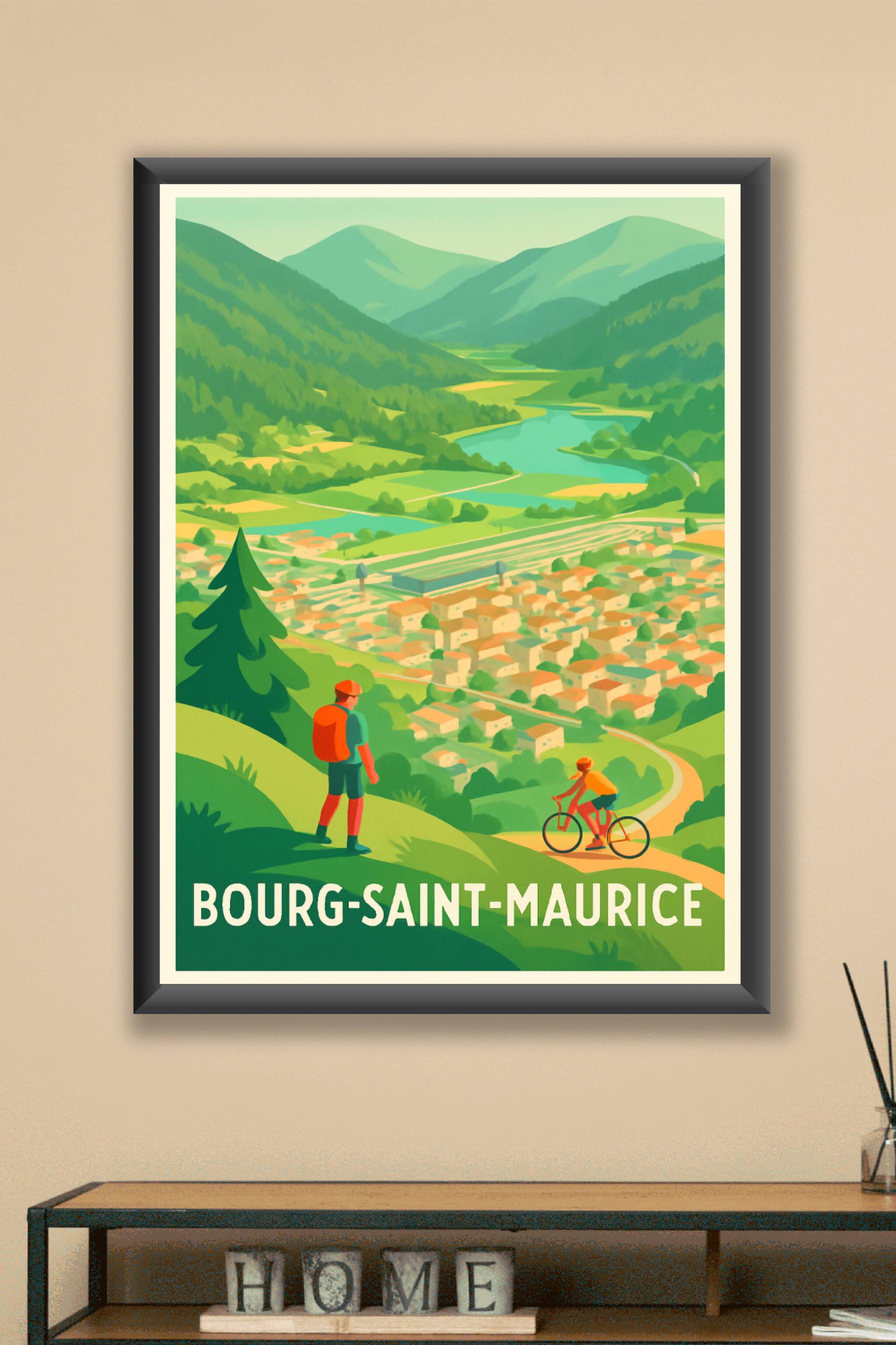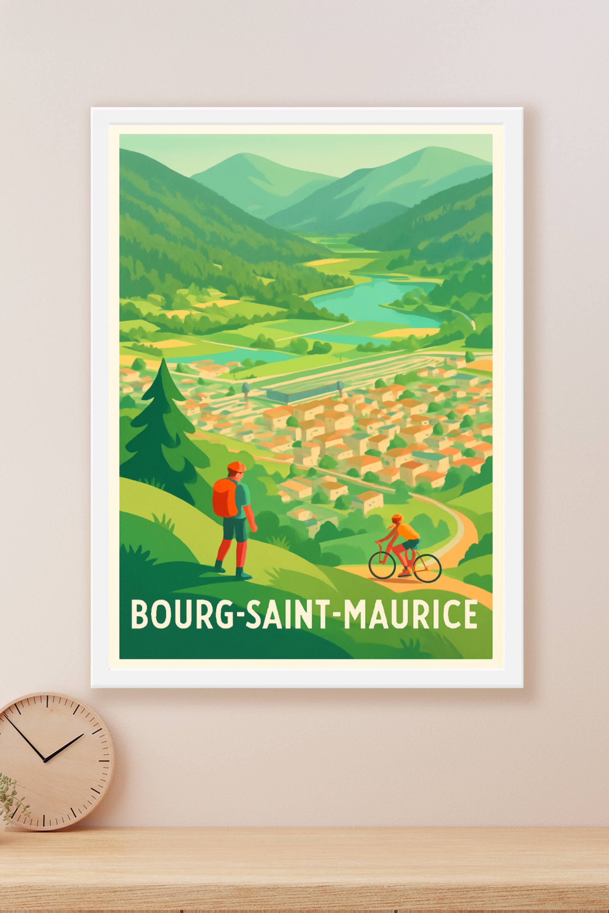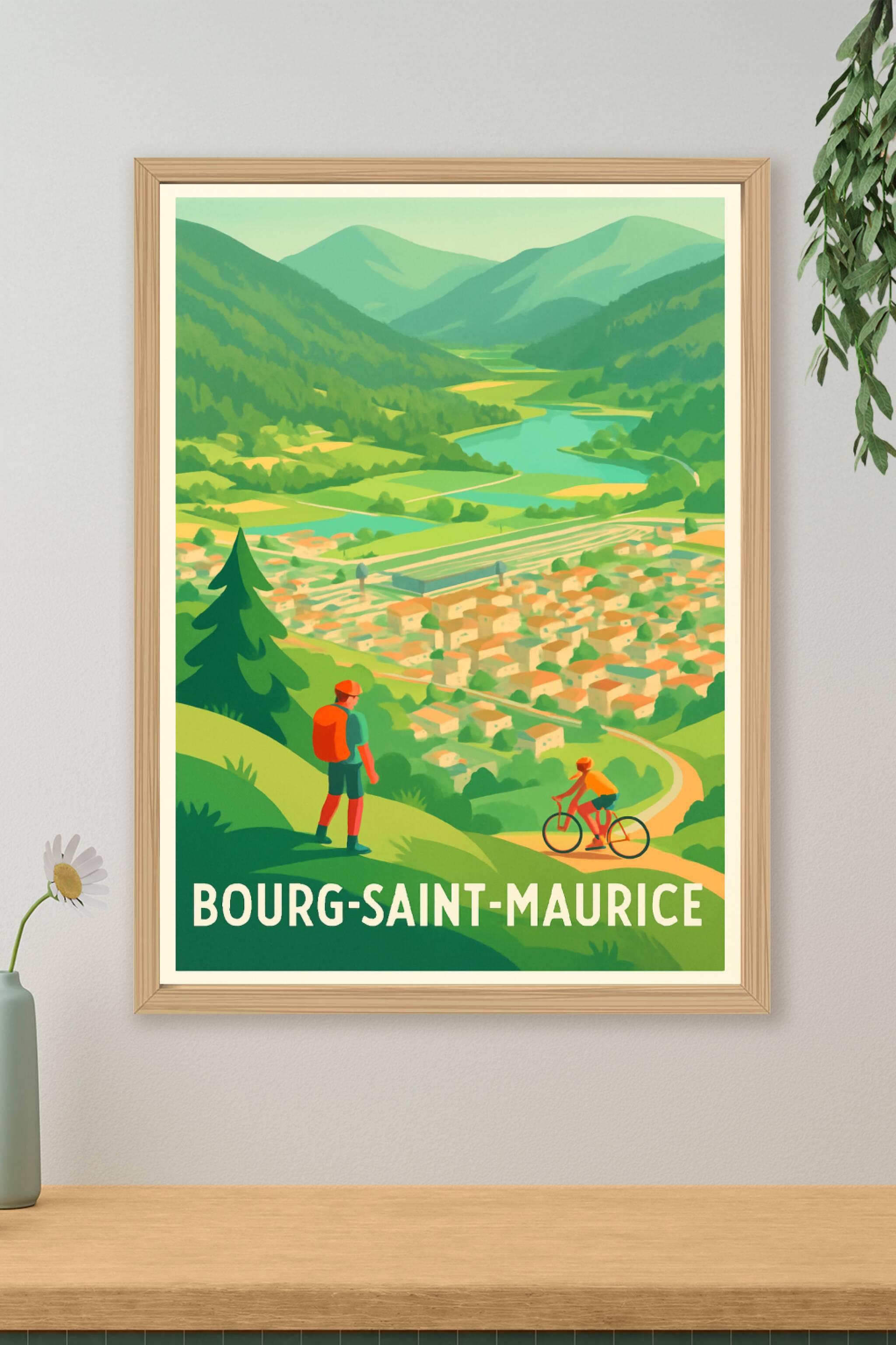 Découvrez la beauté verdoyante de Bourg-Saint-Maurice avec cette affiche illustrée qui met en avant un paysage de montagne idyllique, deux amateurs...