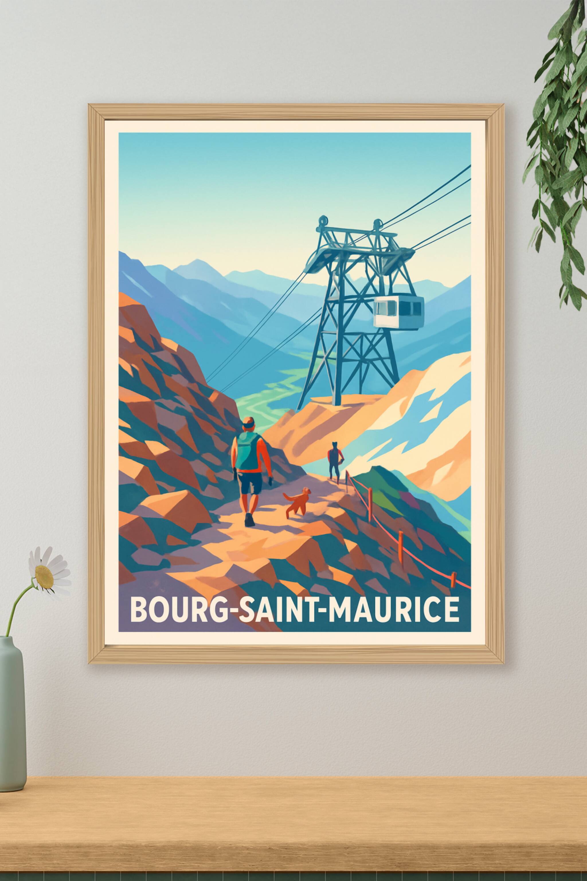 Découvrez la beauté majestueuse des Alpes avec cette affiche illustrant un sentier de randonnée pittoresque à Bourg-Saint-Maurice. La scène capture la fraîcheur d'une journée en montagne, avec des randonneurs et une télécabine qui surplombent un paysage aux couleurs chaudes et apaisantes. Ce poster, imprimé en tirage "Fine Art" sur papier 305g coton de haute qualité, est disponible en formats A1 à A4, avec ou sans cadre, pour s'adapter parfaitement à votre intérieur. Apportez une touche d'aventure et de nature à votre décoration grâce à ce poster premium, fabriqué en France, idéal pour les amoureux des paysages alpins et de la randonnée.