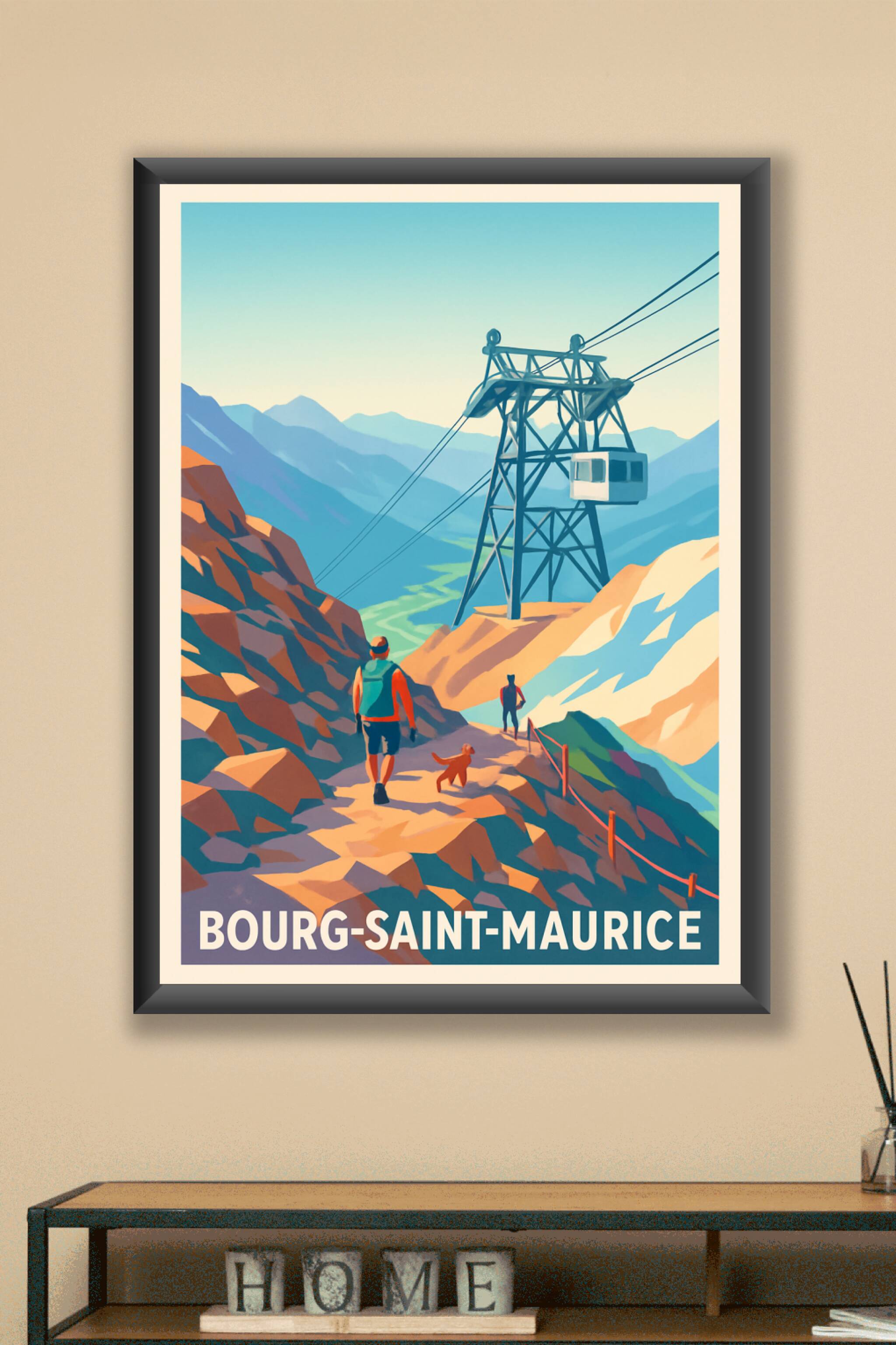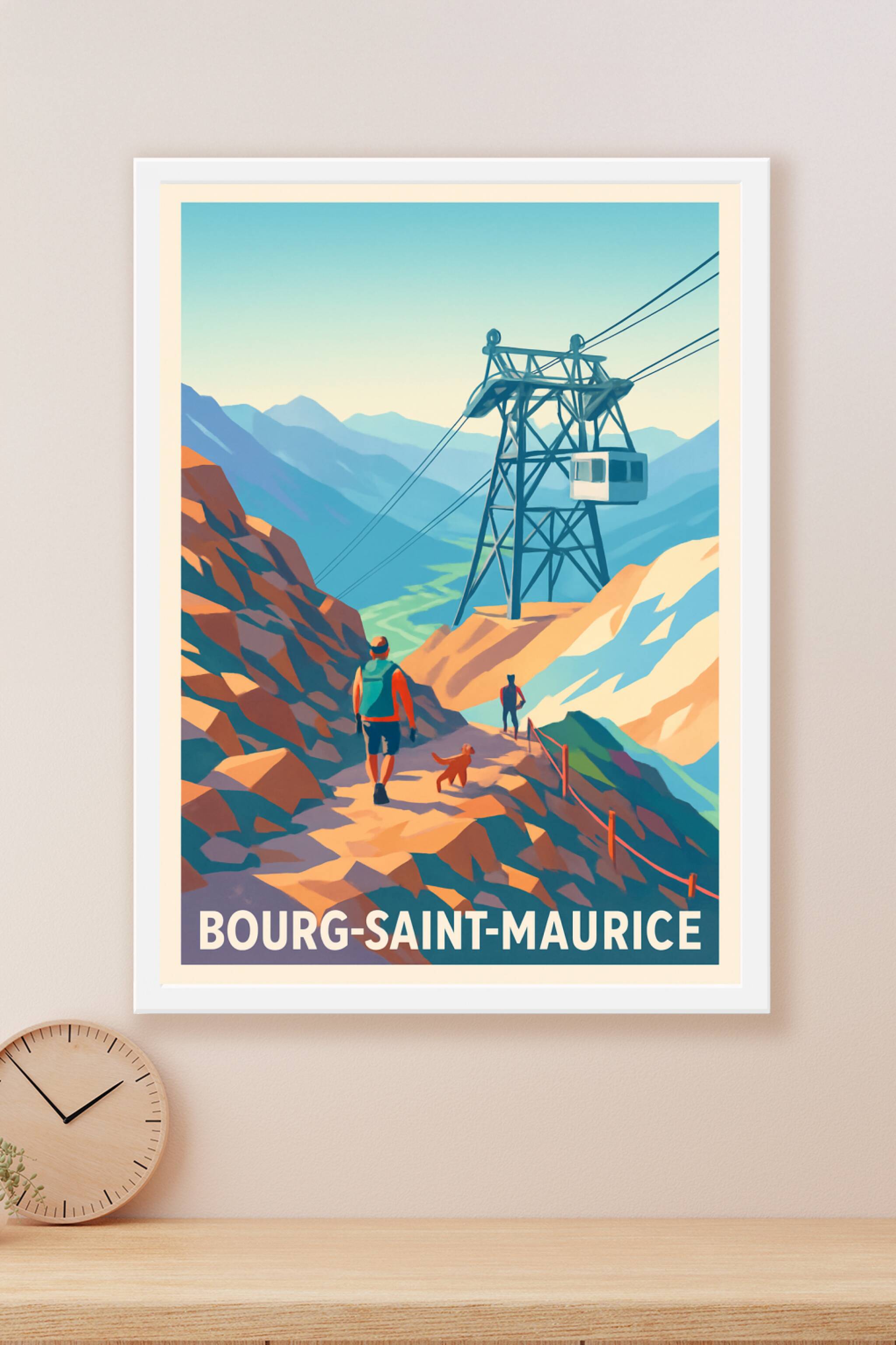 Découvrez la beauté majestueuse des Alpes avec cette affiche illustrant un sentier de randonnée pittoresque à Bourg-Saint-Maurice. La scène capture...