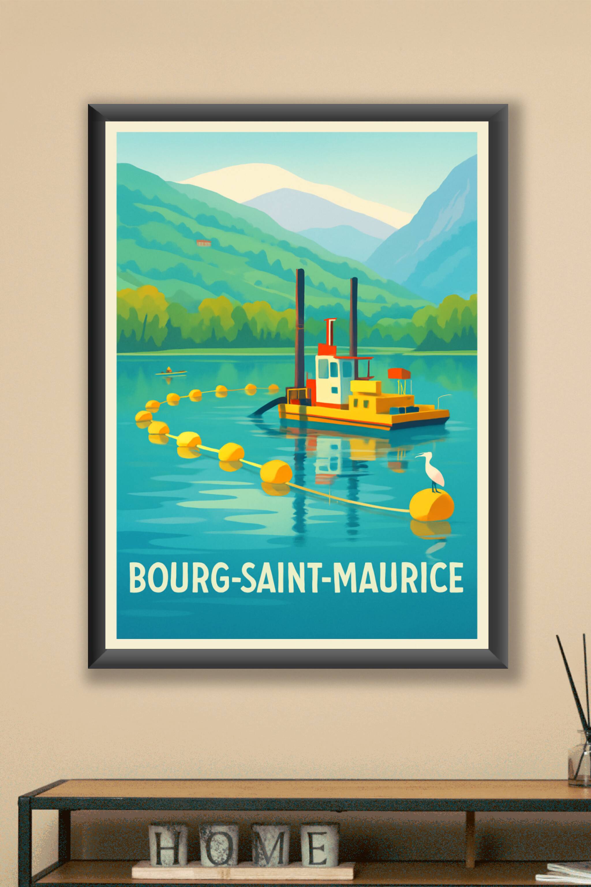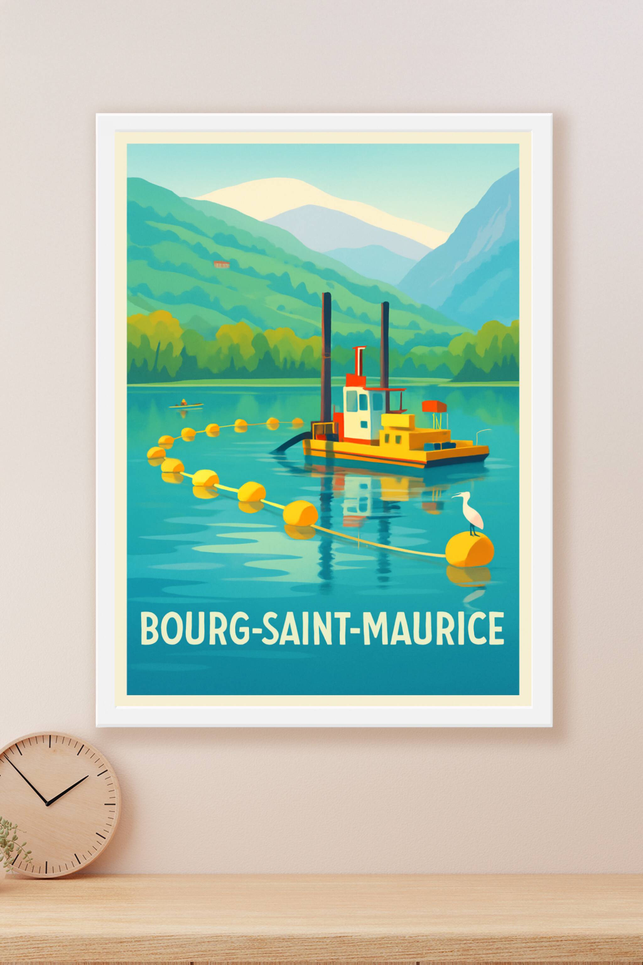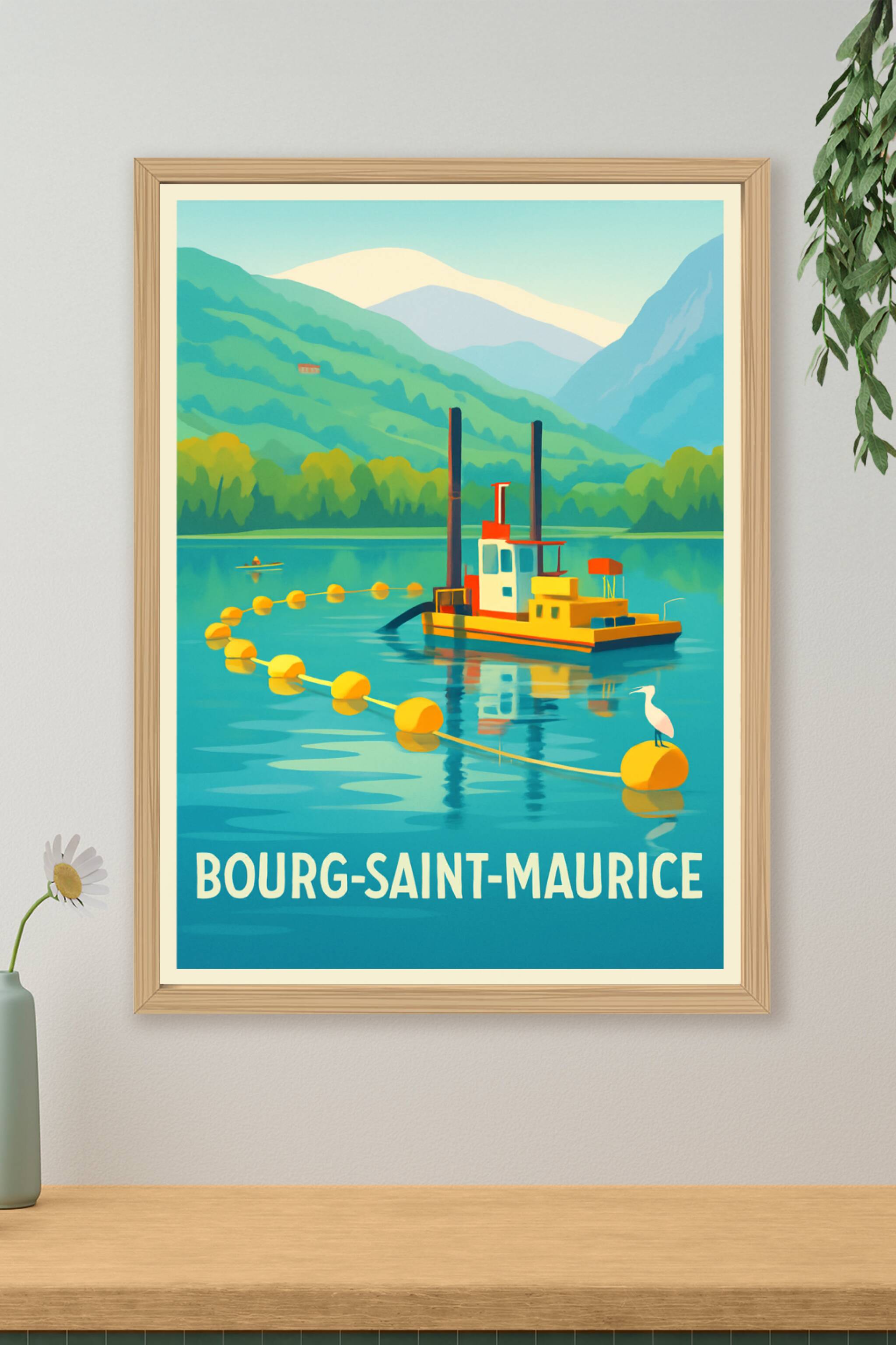 Découvrez l'esprit paisible de Bourg-Saint-Maurice avec cette affiche élégante illustrant un bateau coloré flottant sur un lac entouré de montagnes...