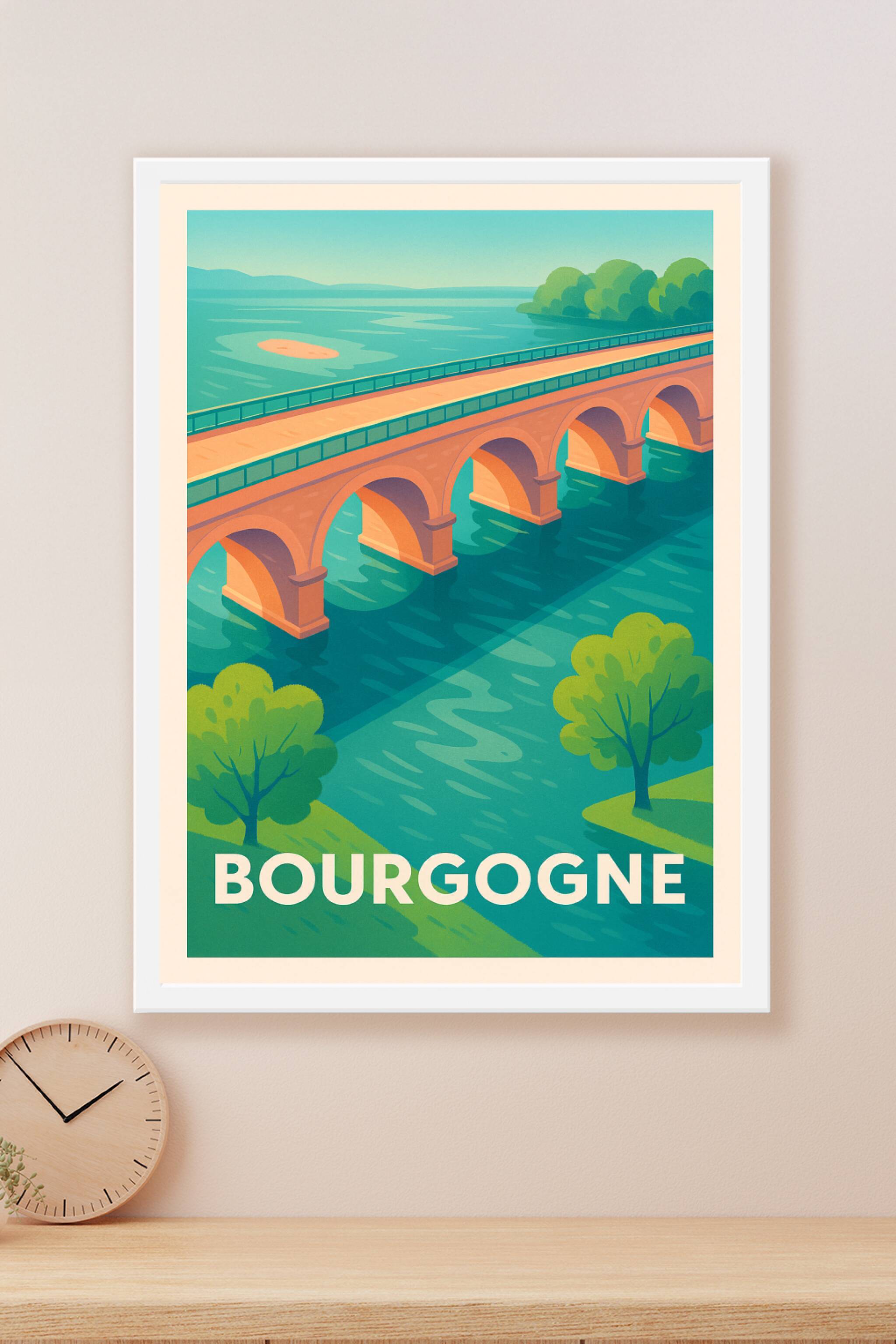 Découvrez la douceur et la sérénité de la Bourgogne à travers cette affiche illustrée mettant en avant un pont emblématique sur une rivière paisibl...