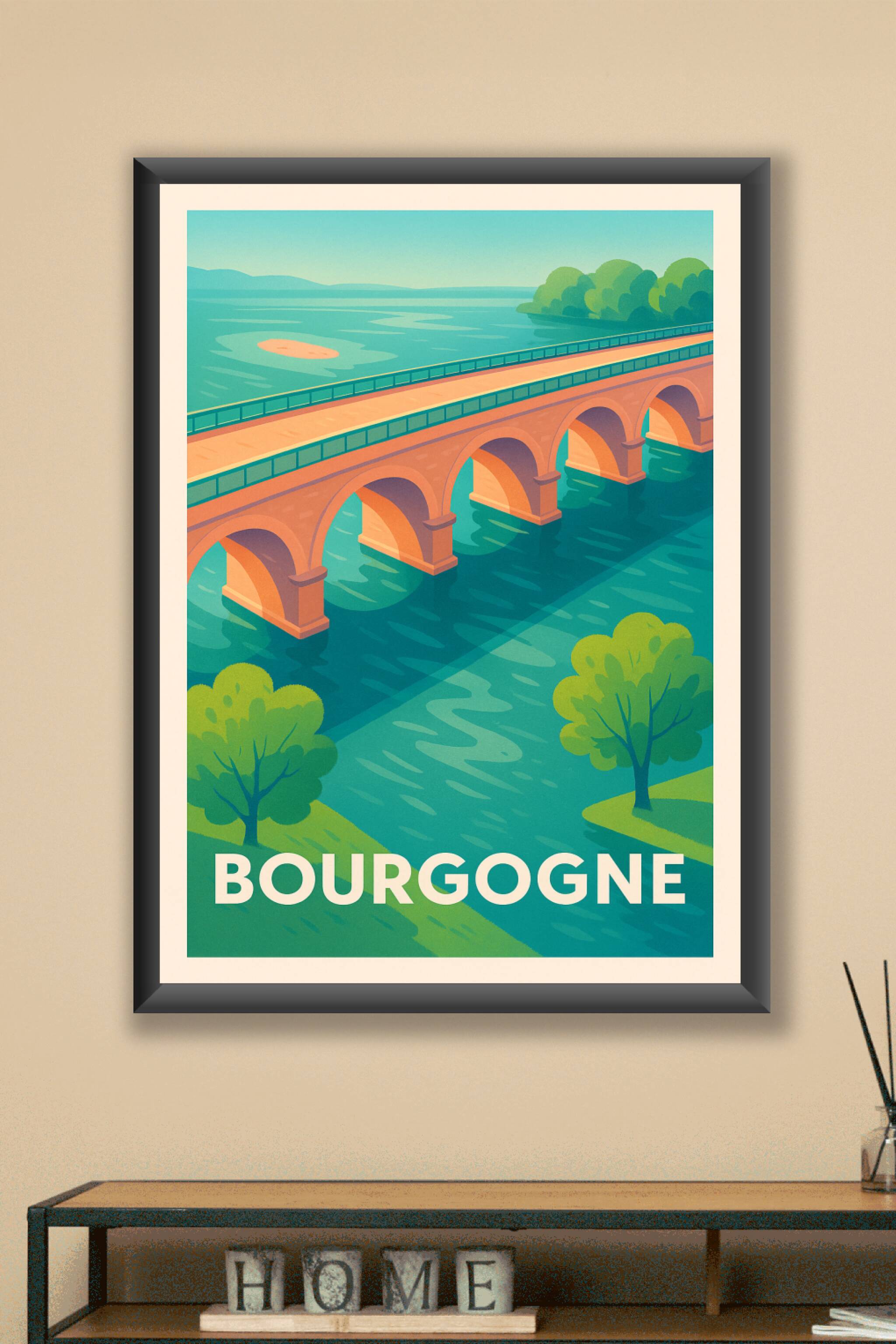 Découvrez la douceur et la sérénité de la Bourgogne à travers cette affiche illustrée mettant en avant un pont emblématique sur une rivière paisible, entouré d'une nature luxuriante. Ce poster au style vintage se marie parfaitement avec tout type d'intérieur, apportant une touche d'élégance et de calme. Imprimée en tirage "Fine Art" sur un papier 305g coton, cette affiche garantit une qualité d'impression remarquable avec des couleurs profondes et durablement éclatantes. Disponible en formats A1, A2, A3 et A4, avec ou sans cadre, elle s'adapte à vos envies et espaces pour sublimer votre décoration ou offrir un cadeau raffiné à un amateur de Bourgogne.